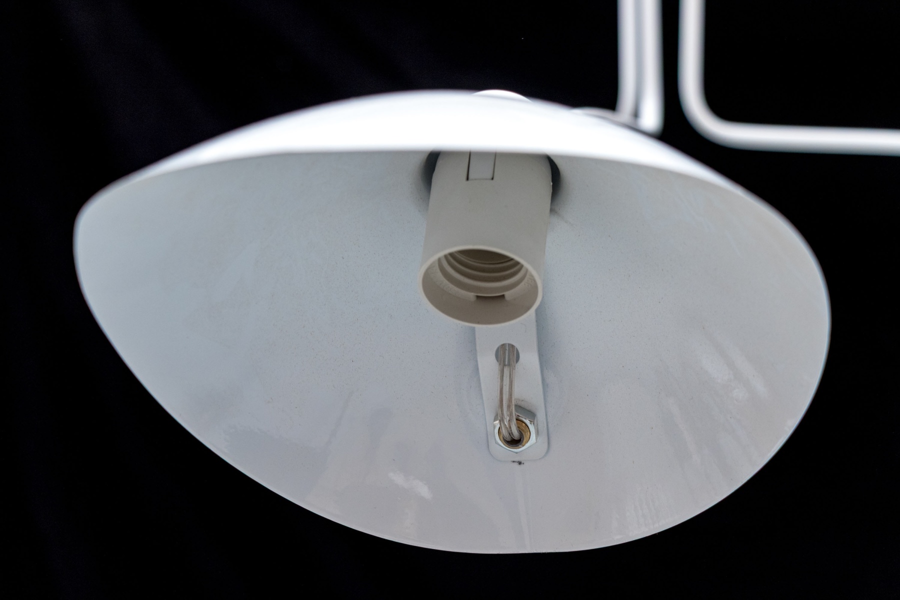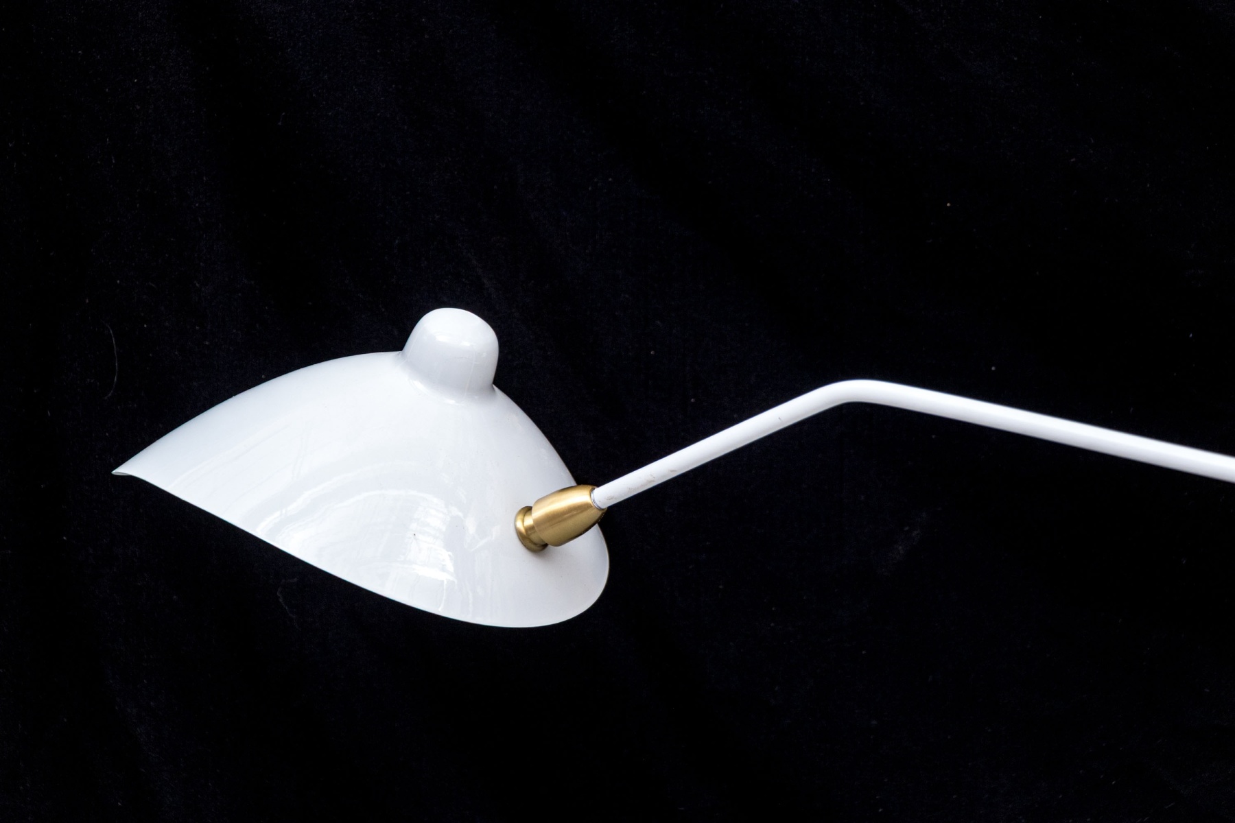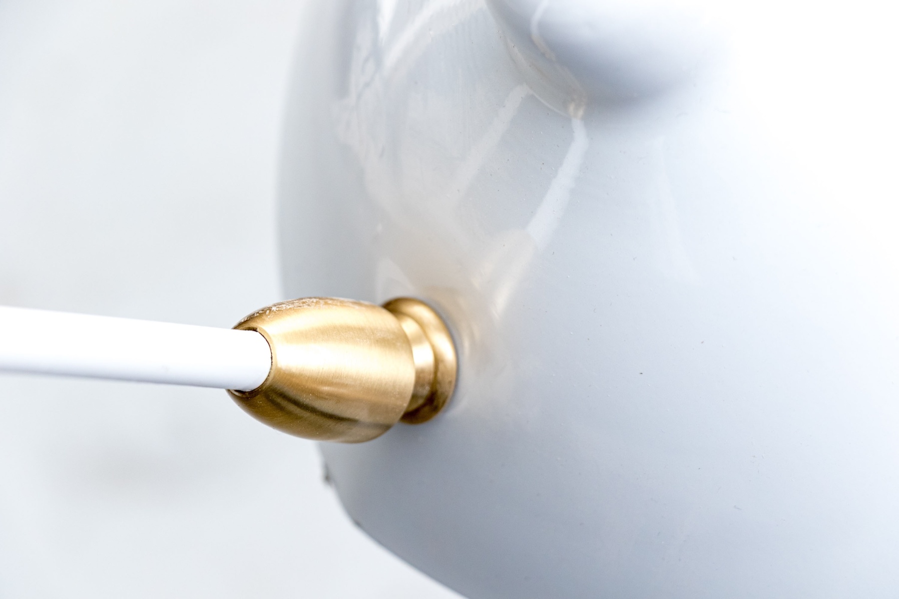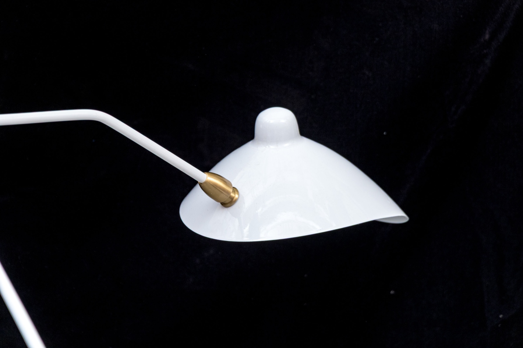 Cieling mounted with short central post having three arms with elbows at varying lengths. Each has a shaped white shade with brass fittings.