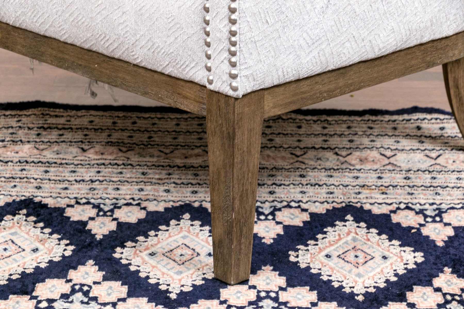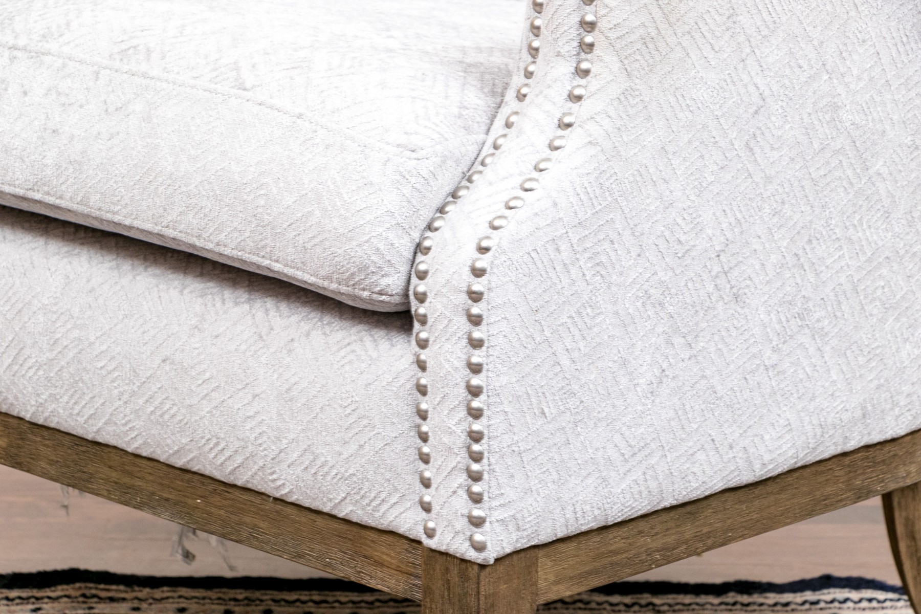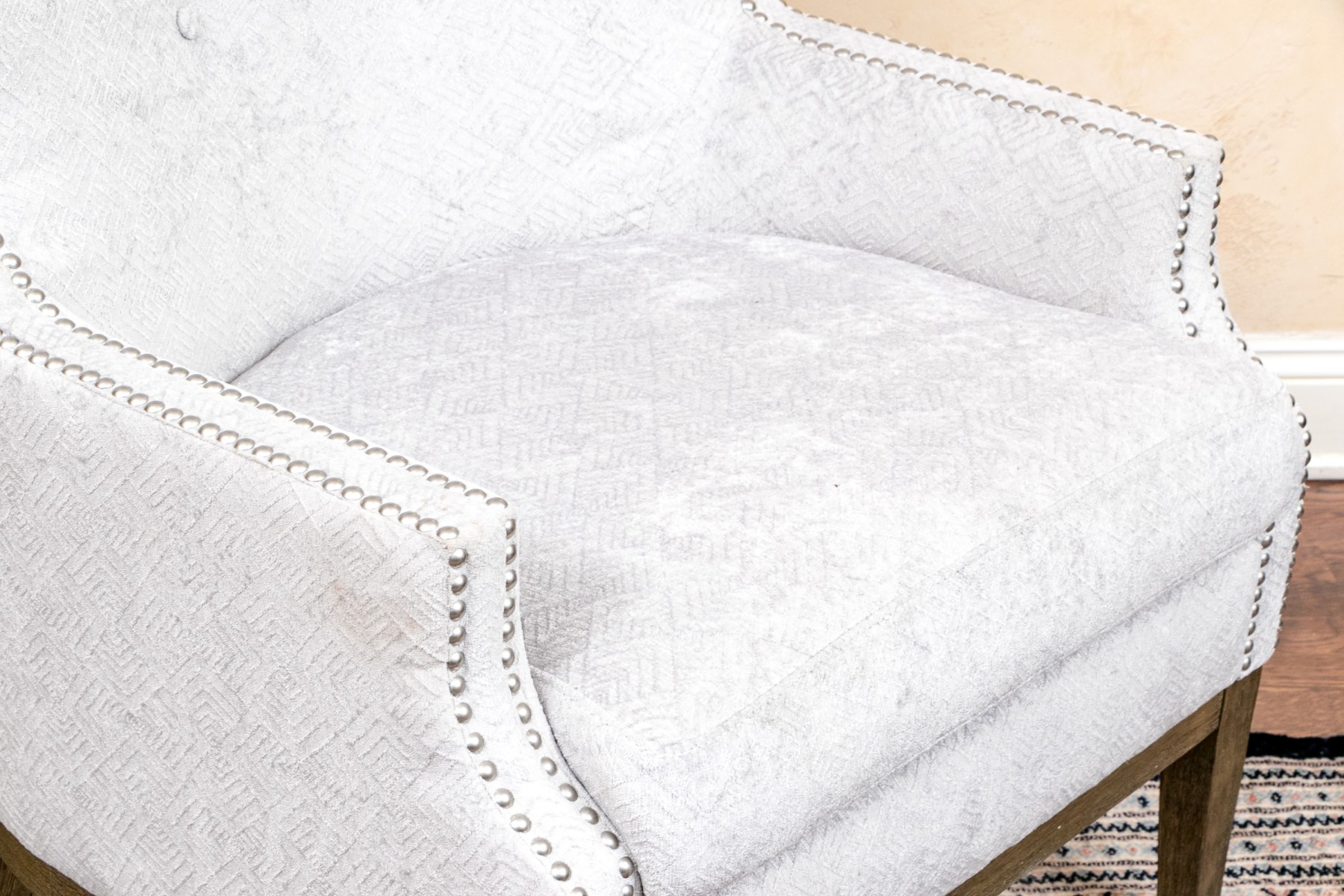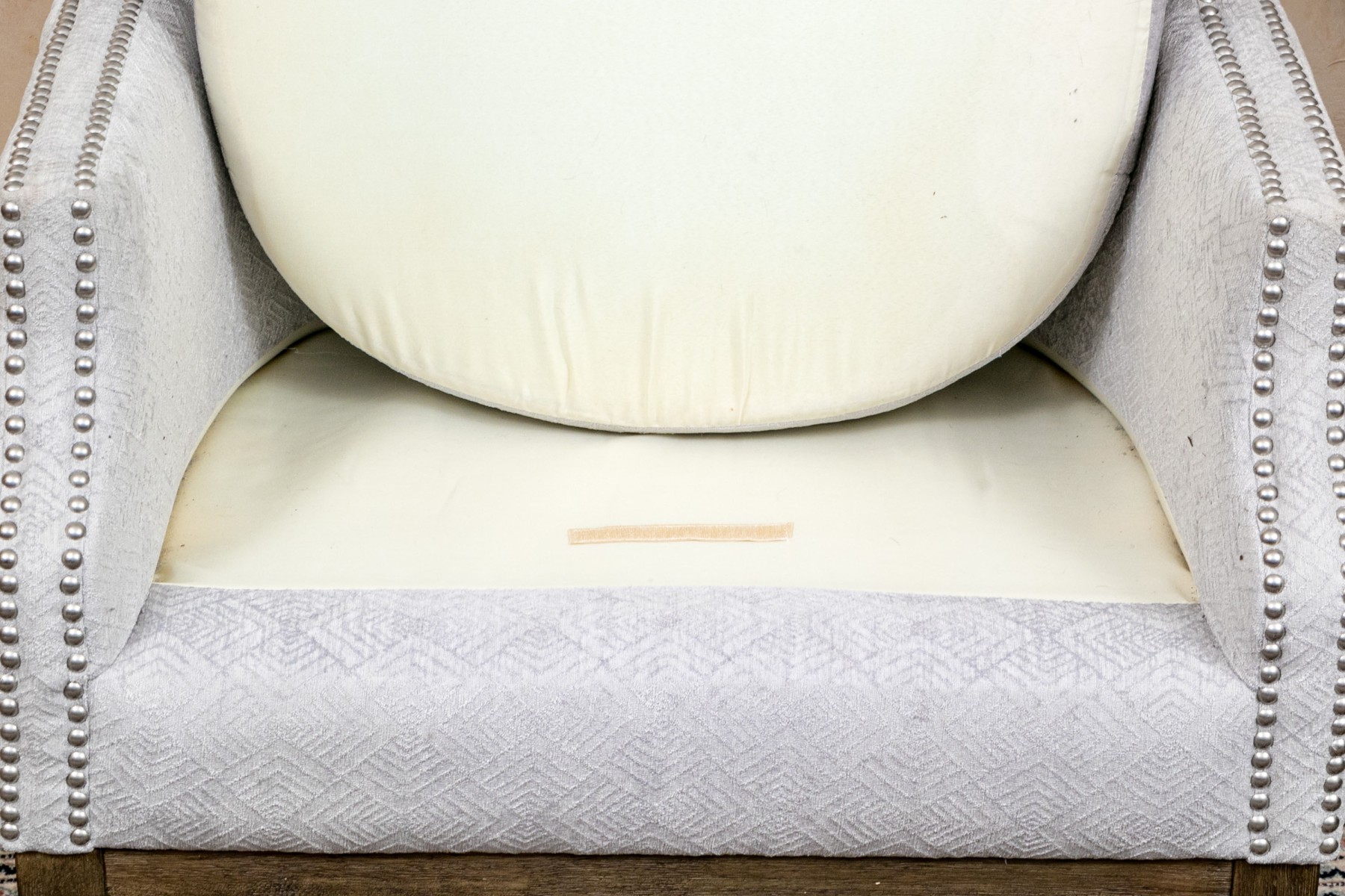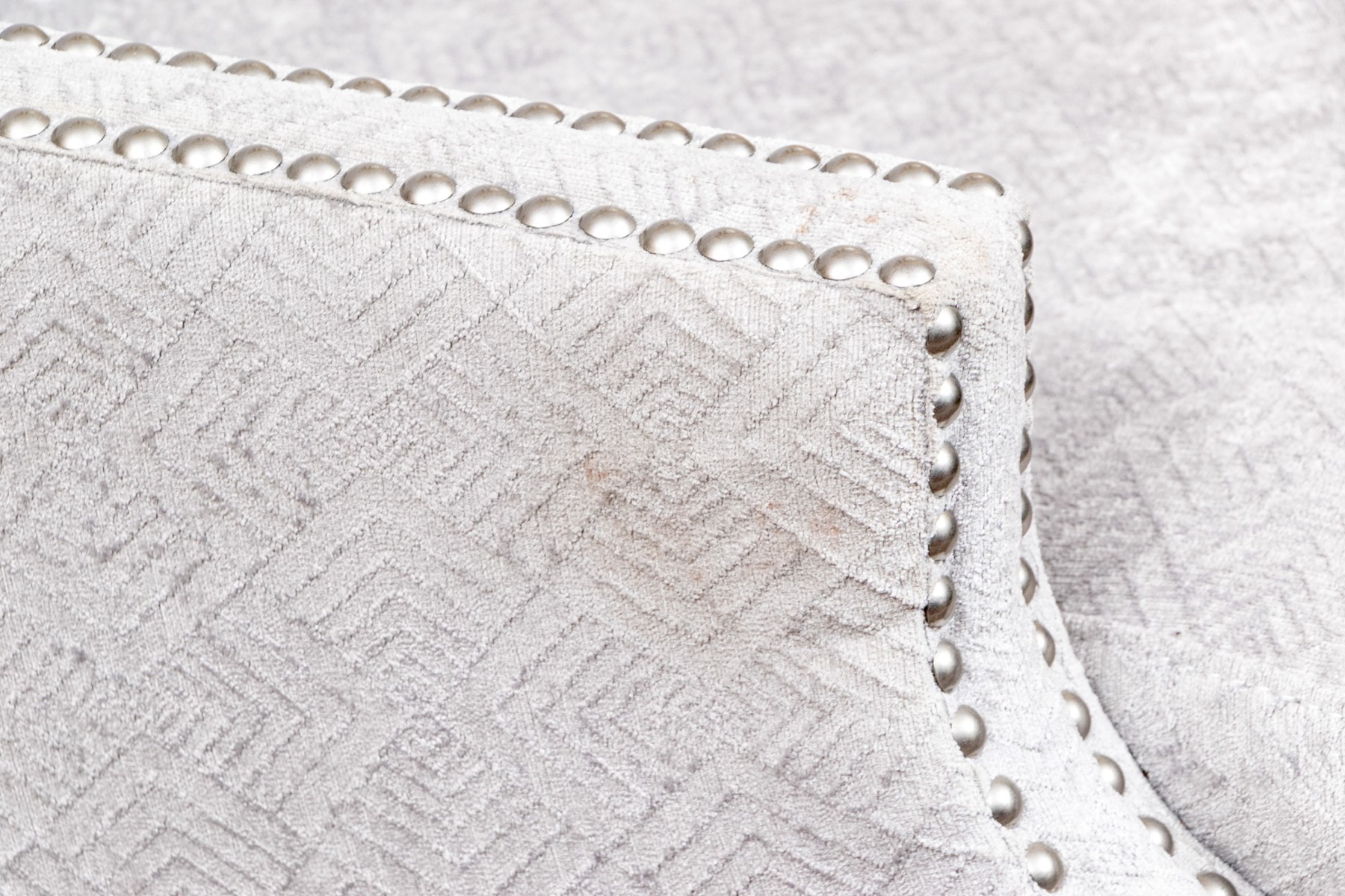Upholstered in an elegant fine pale gray textured fabric with silver tone nail head trim.