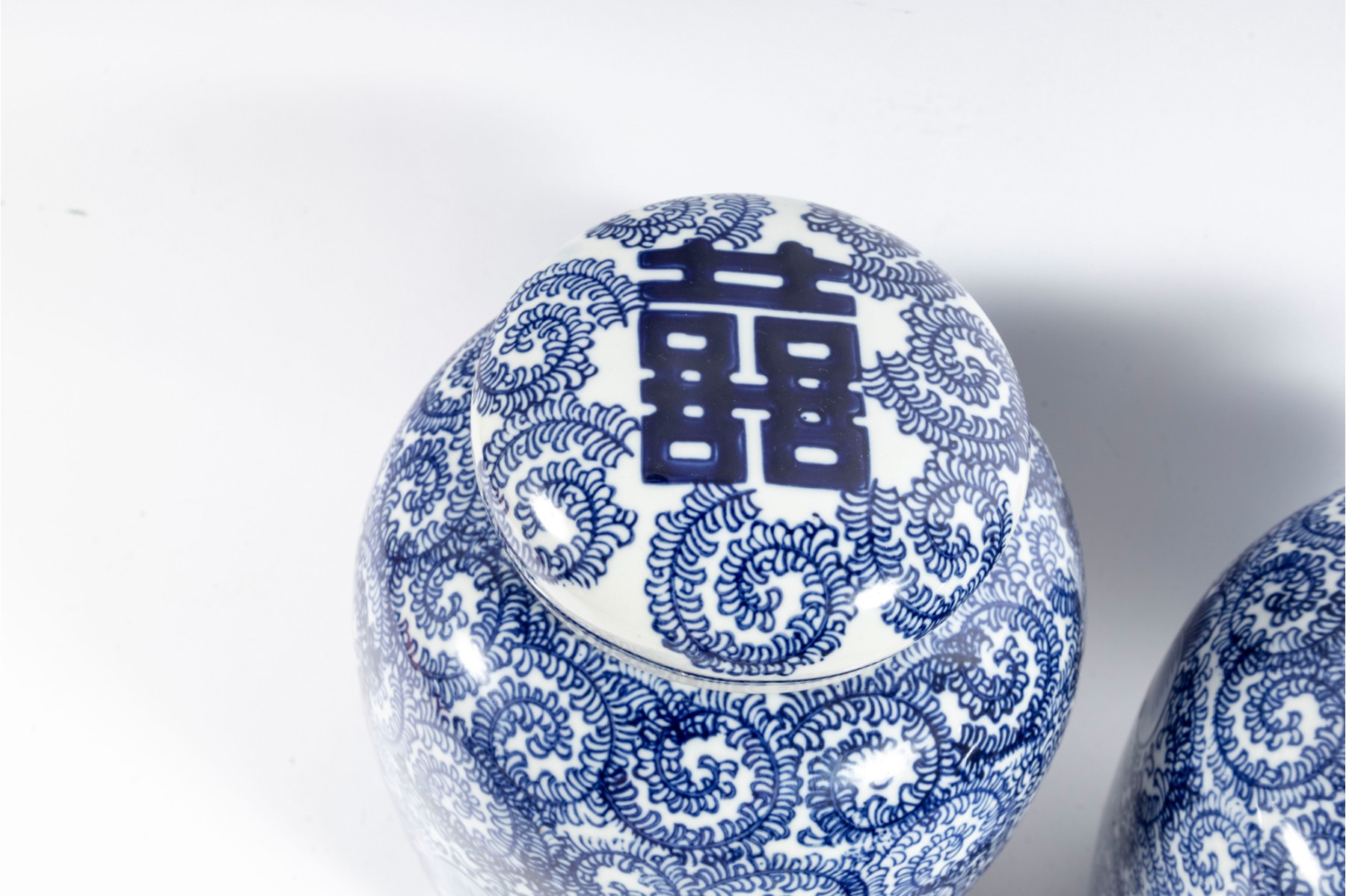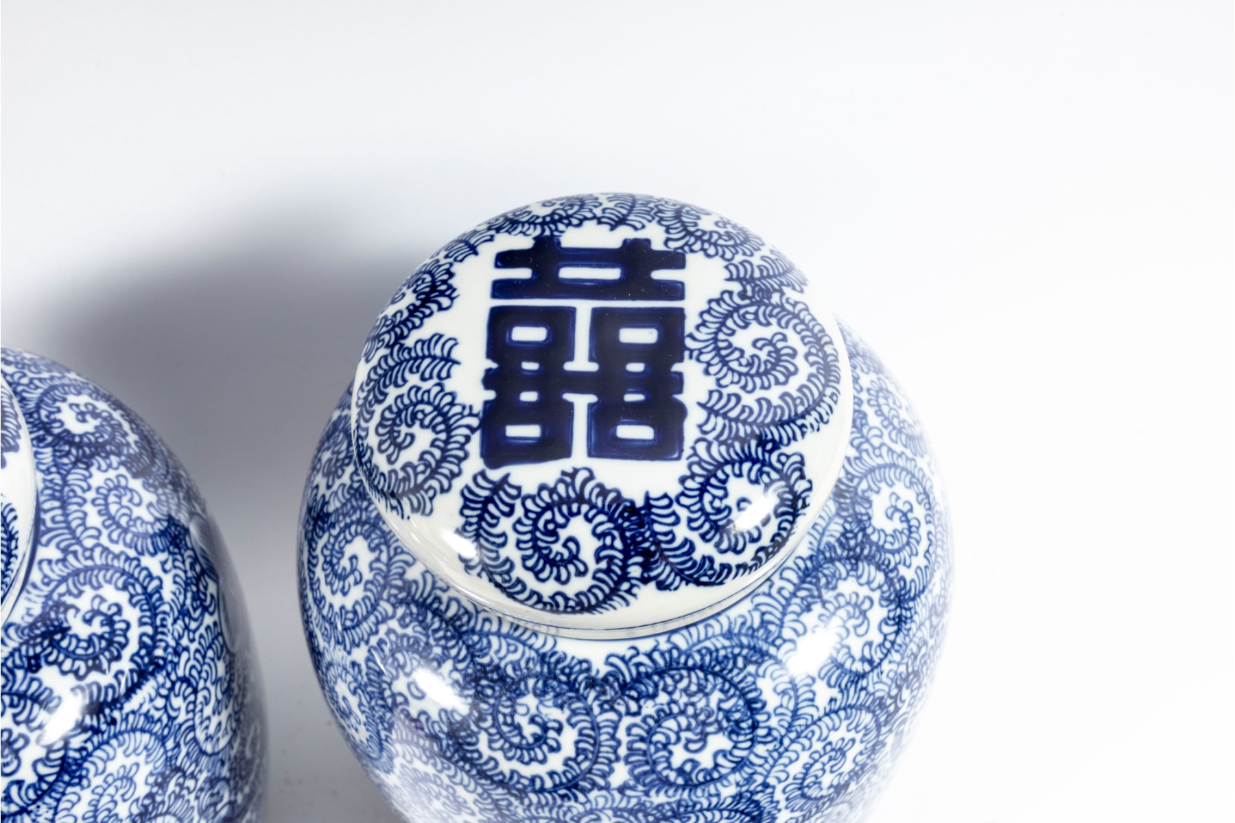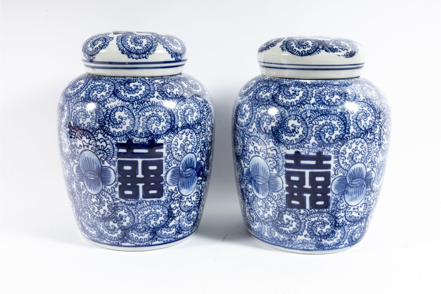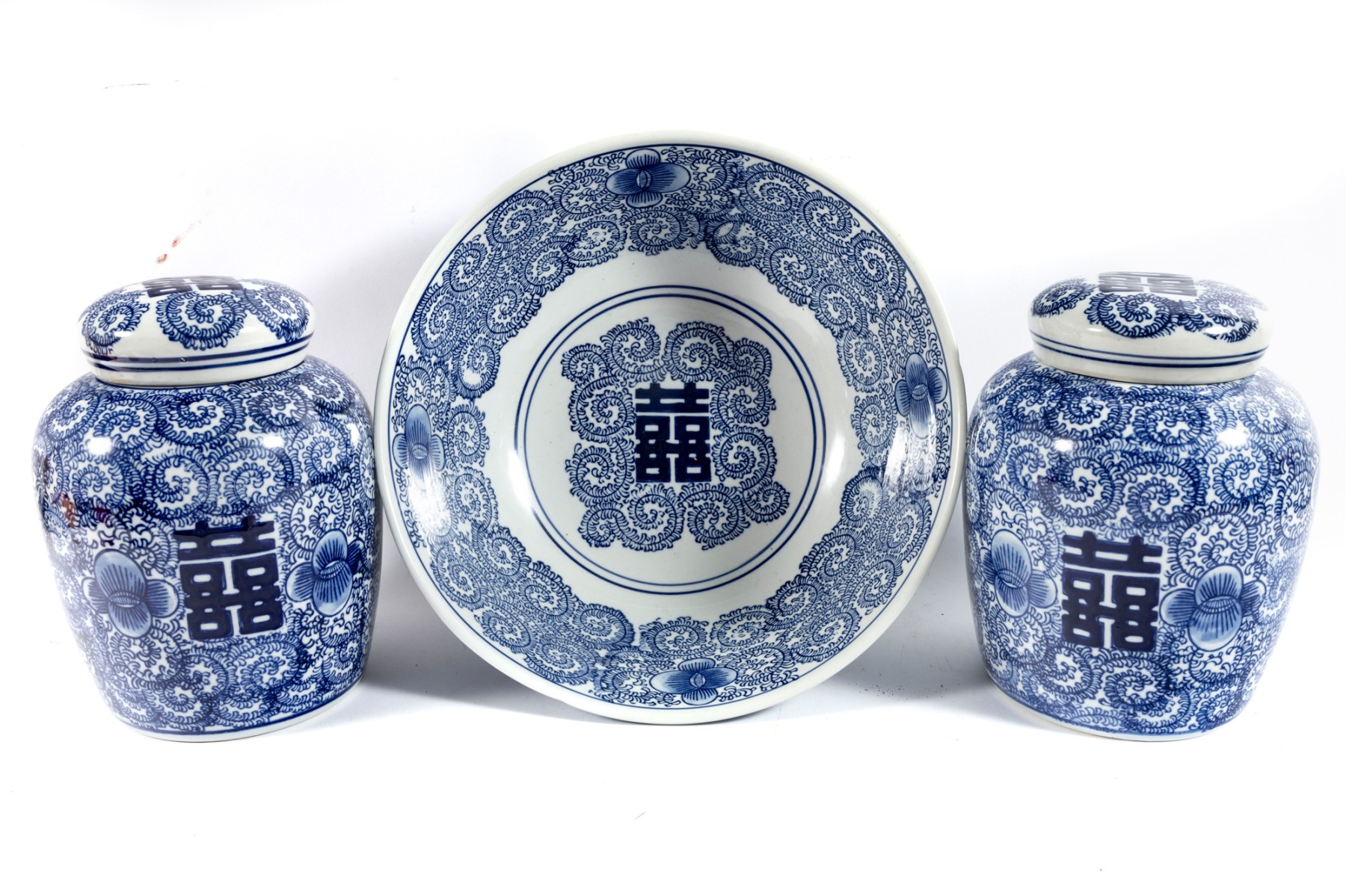 A set of contemporary blue on white willow-ware inspired pair of ginger jars with a coordinating 14" bowl, all of which are emboldened by the Chinese "Double Happiness" ligature characters.
