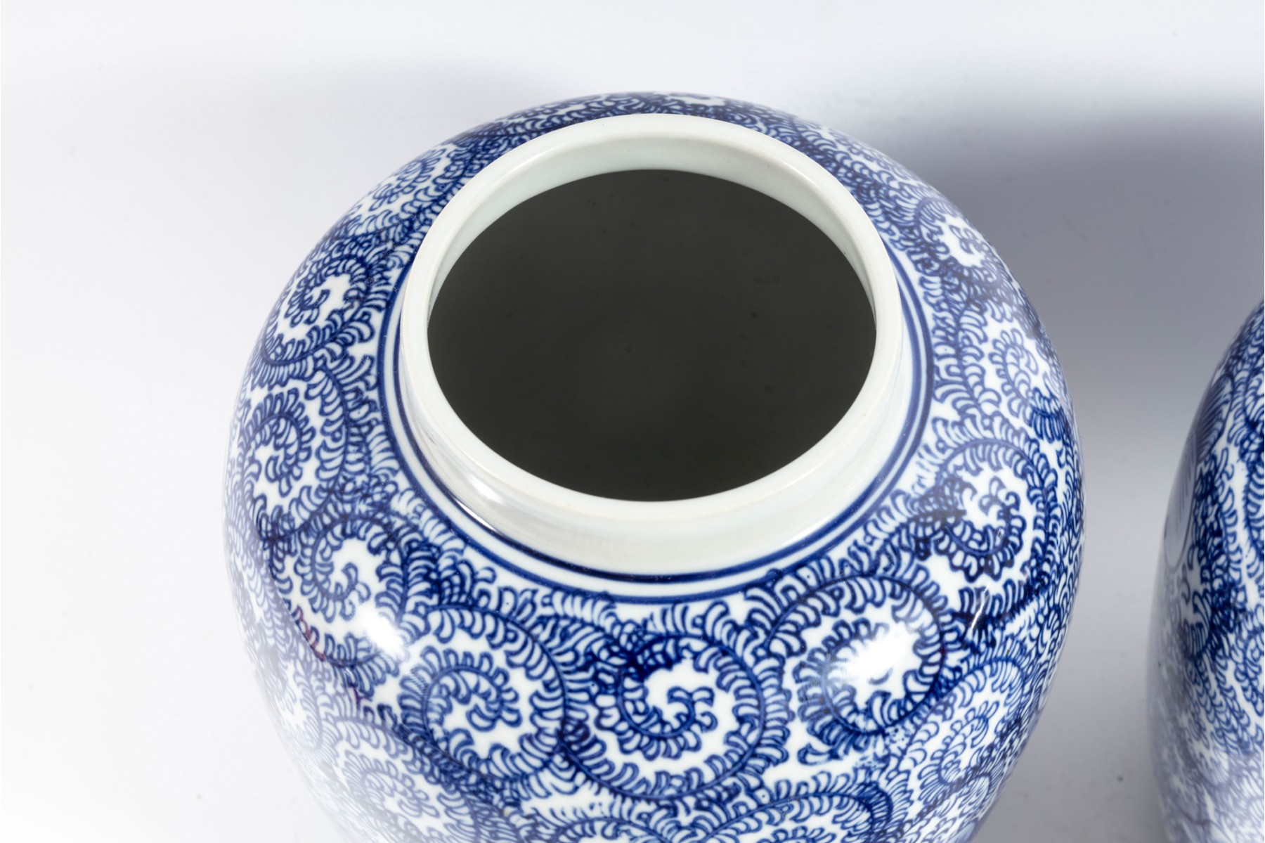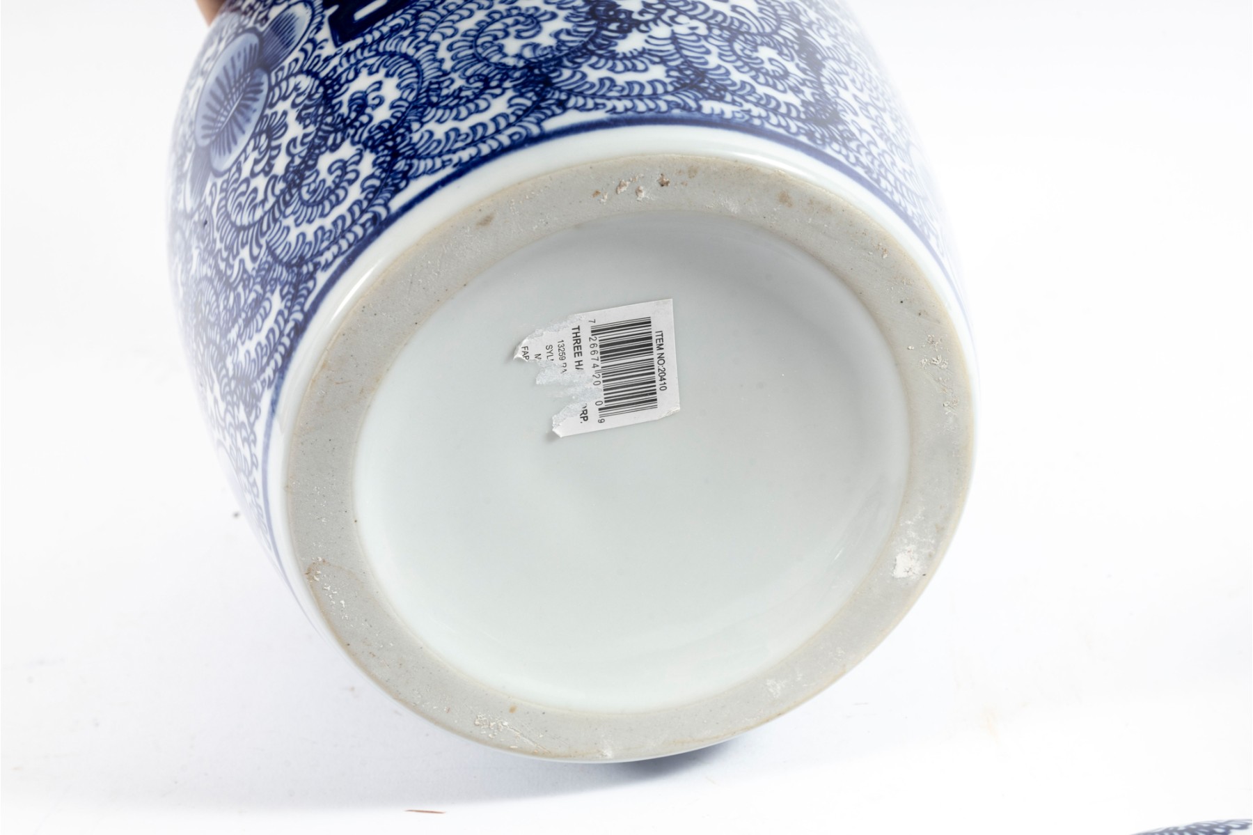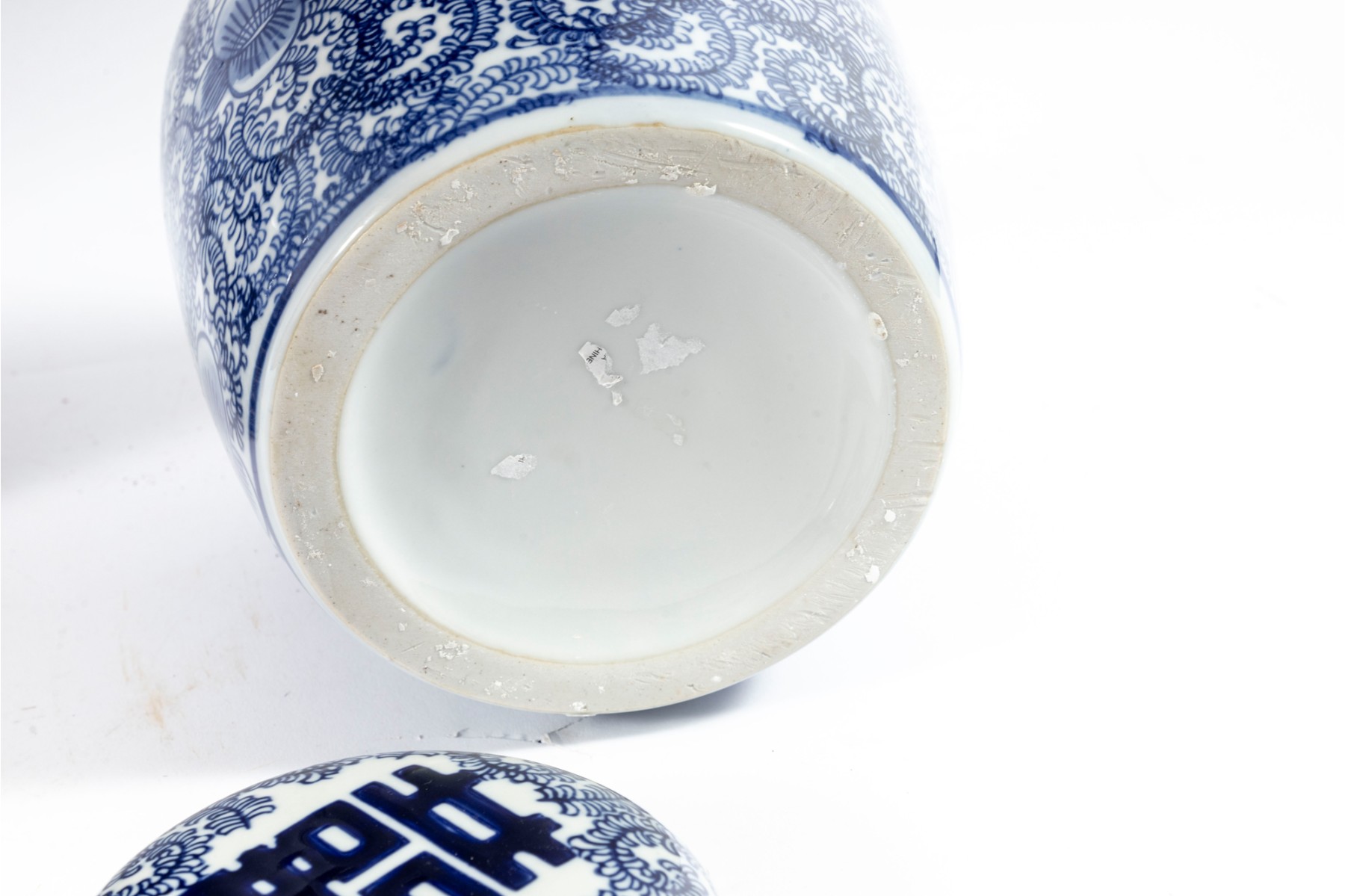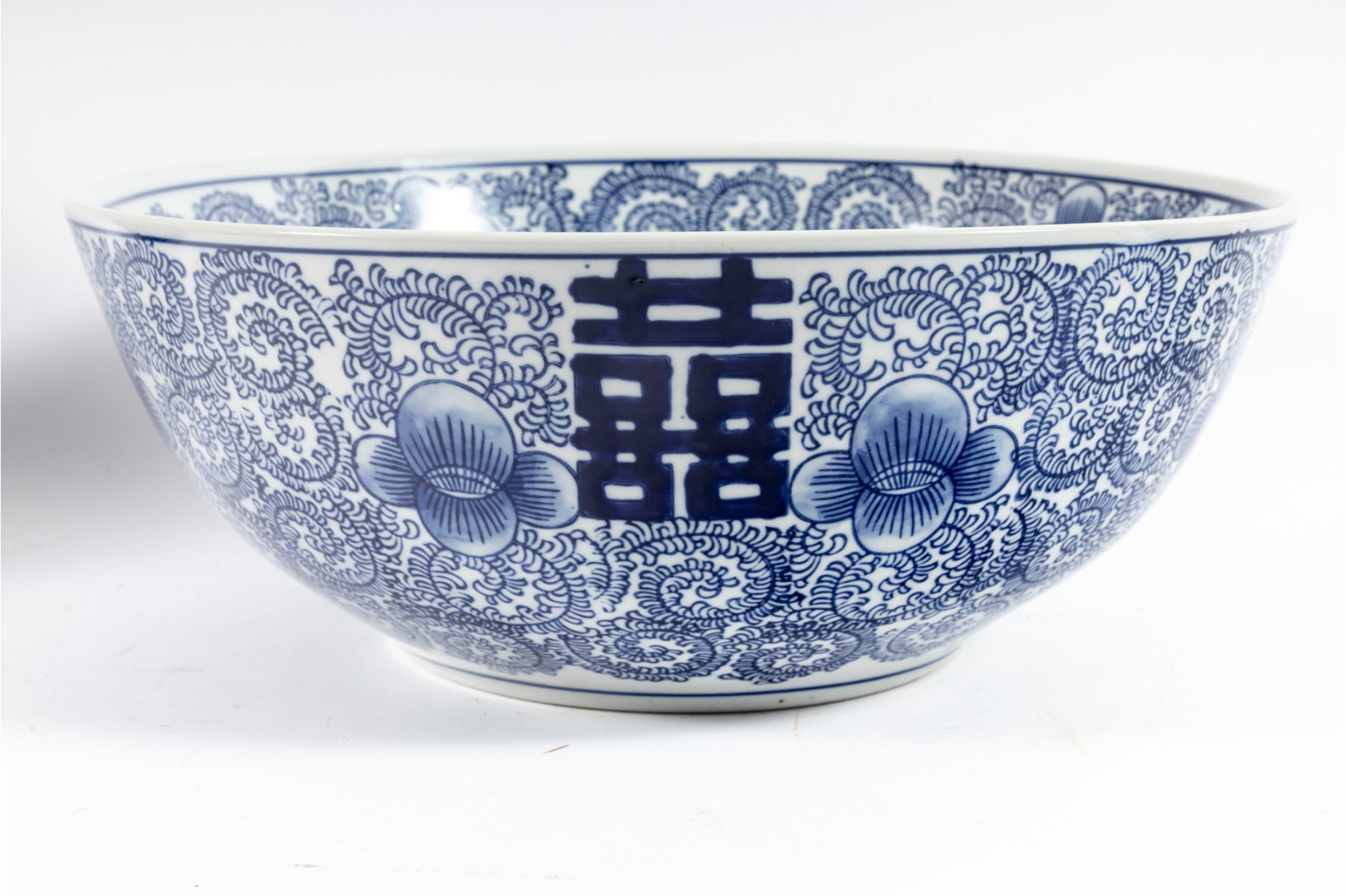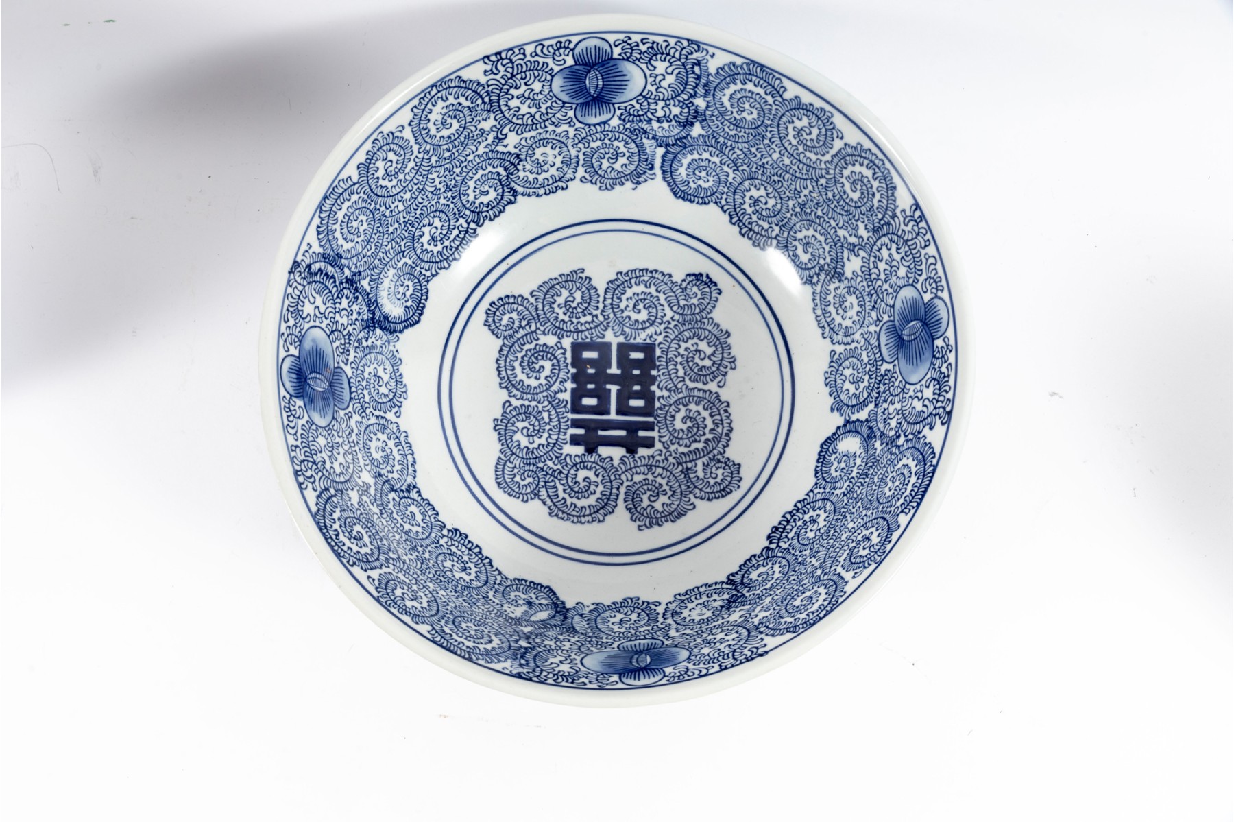 A set of contemporary blue on white willow-ware inspired pair of ginger jars with a coordinating 14" bowl, all of which are emboldened by the Chinese "Double Happiness" ligature characters.