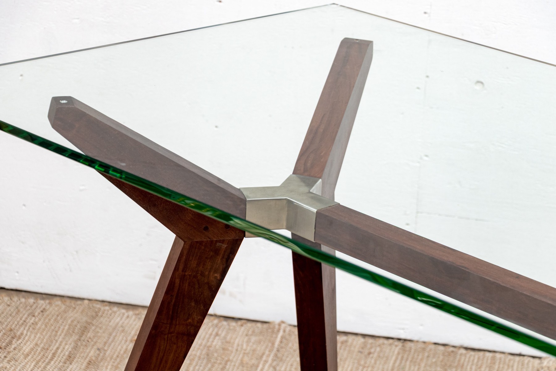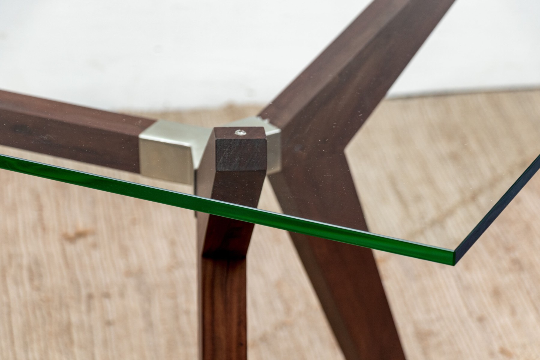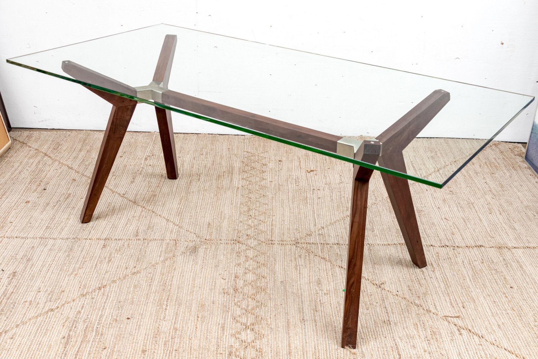The table with square cut X form supports for the legs and the top for the glass. The wood frame has Y shaped chrome fittings.