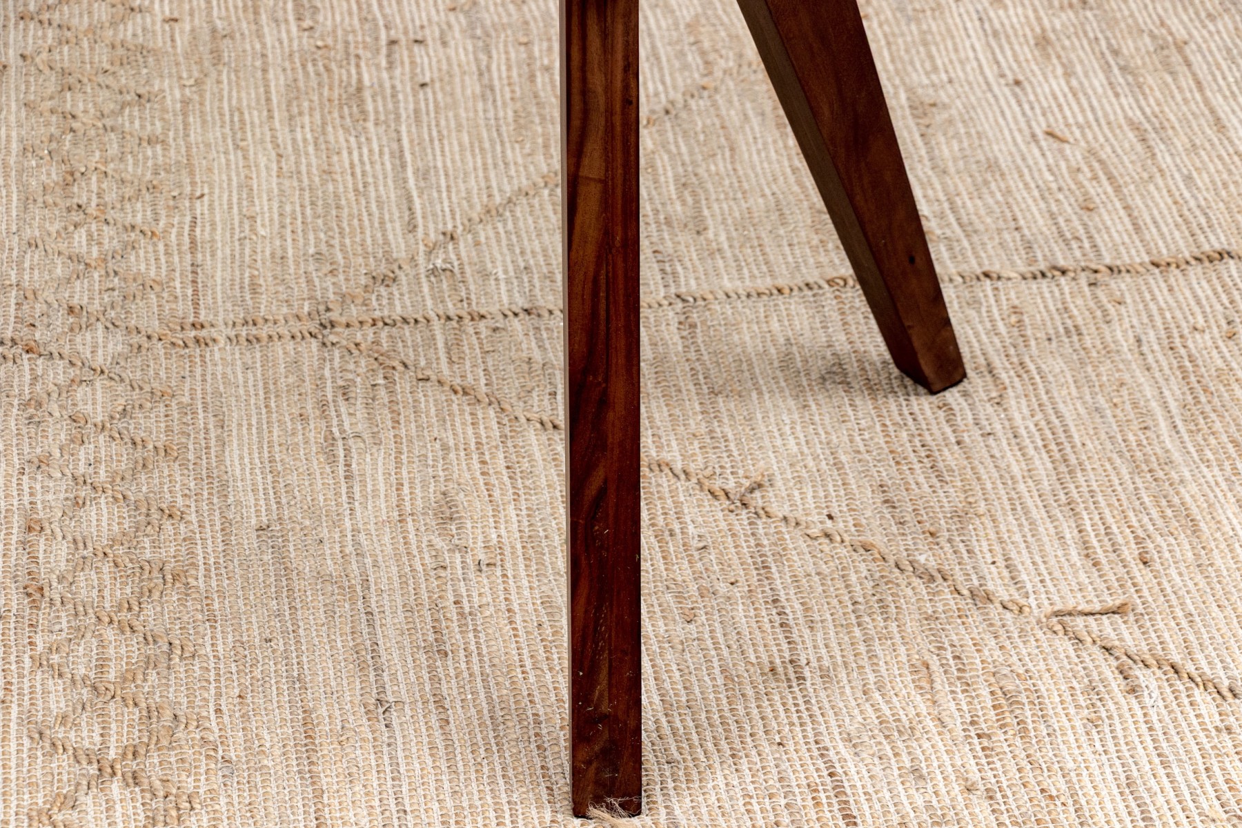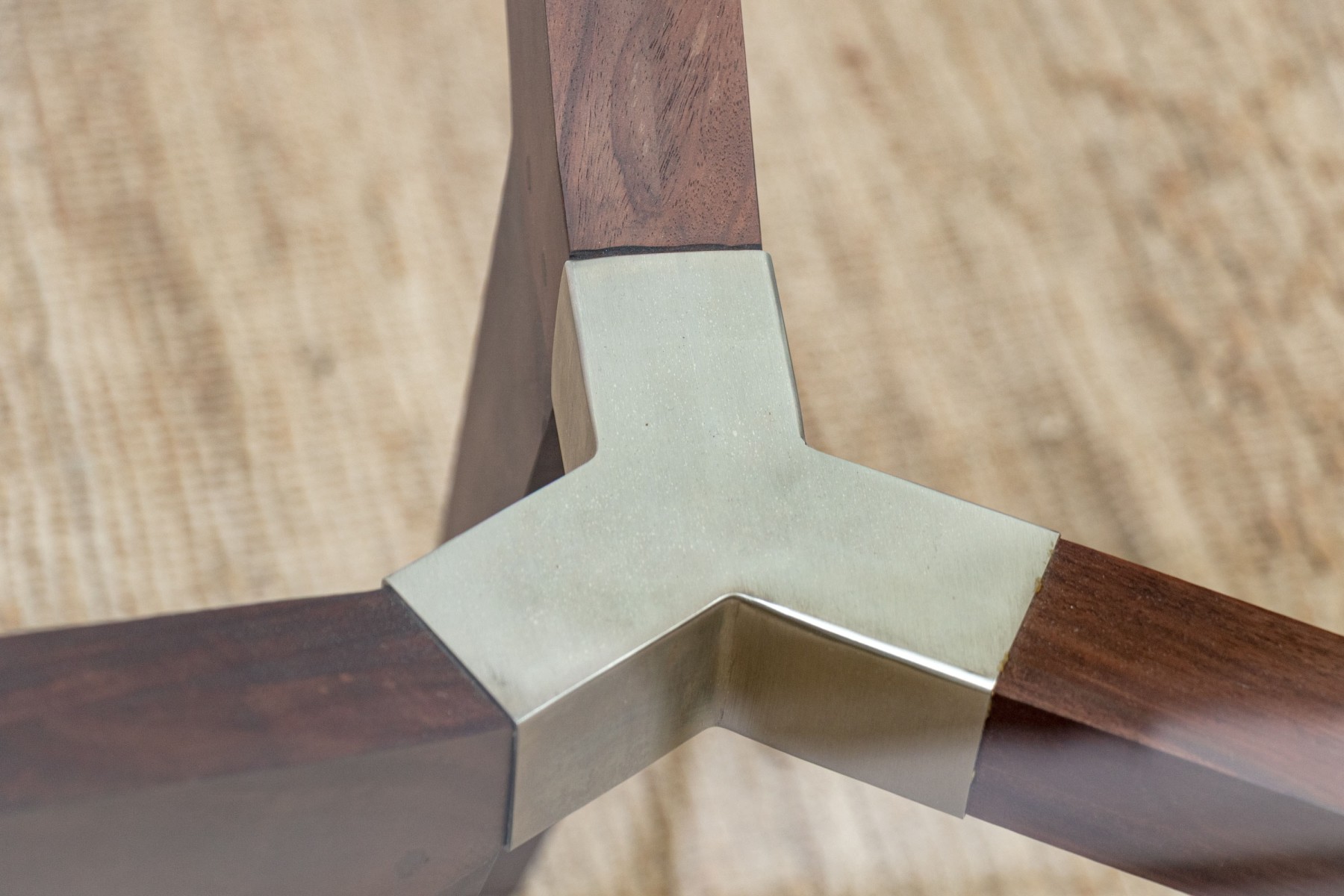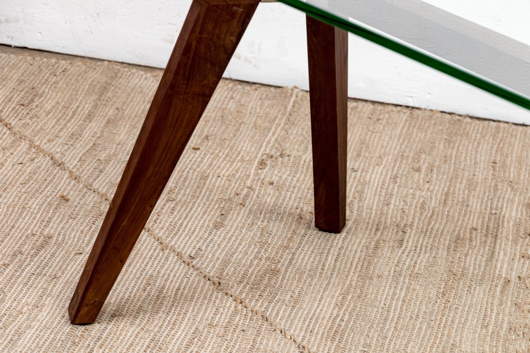 The table with square cut X form supports for the legs and the top for the glass. The wood frame has Y shaped chrome fittings.