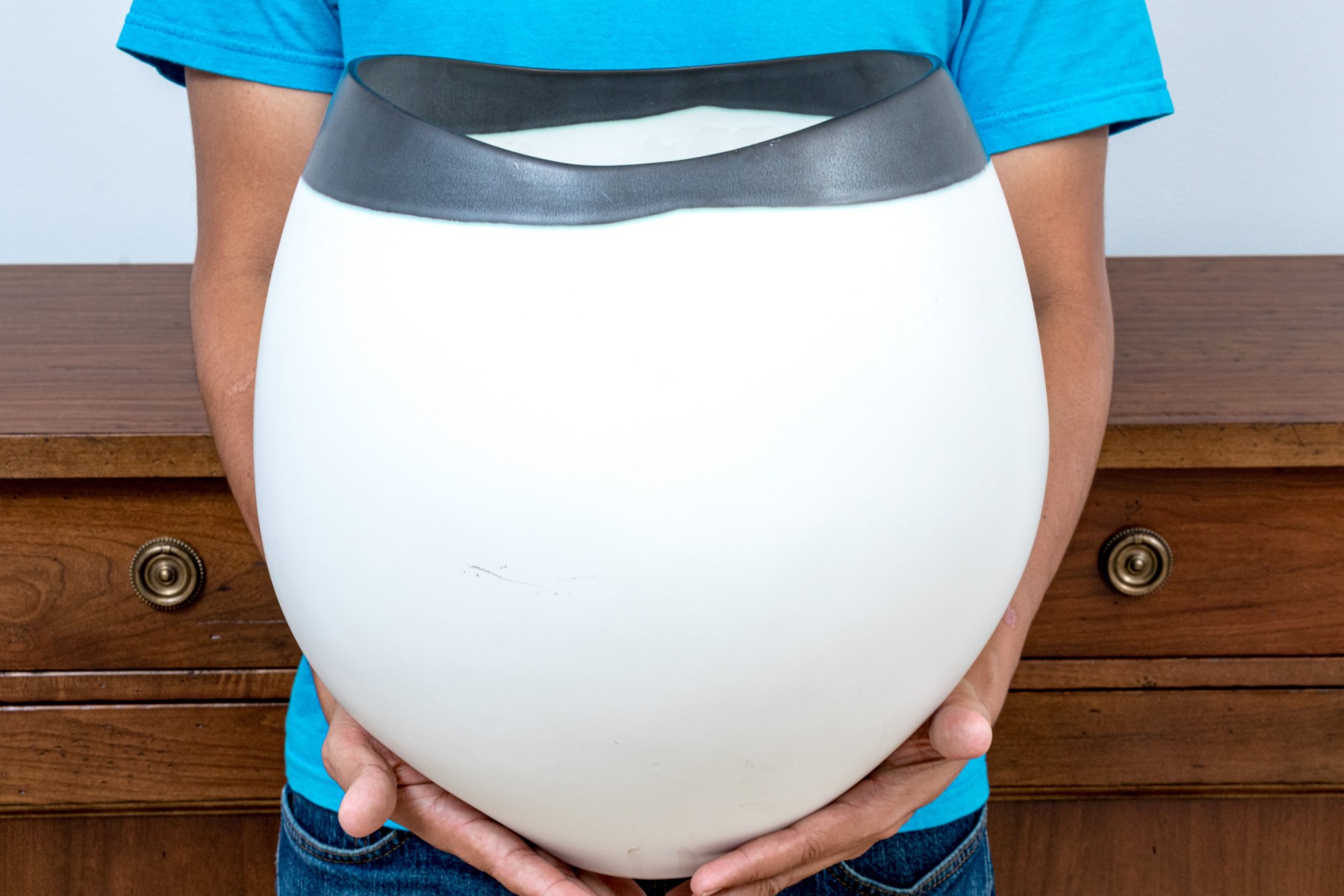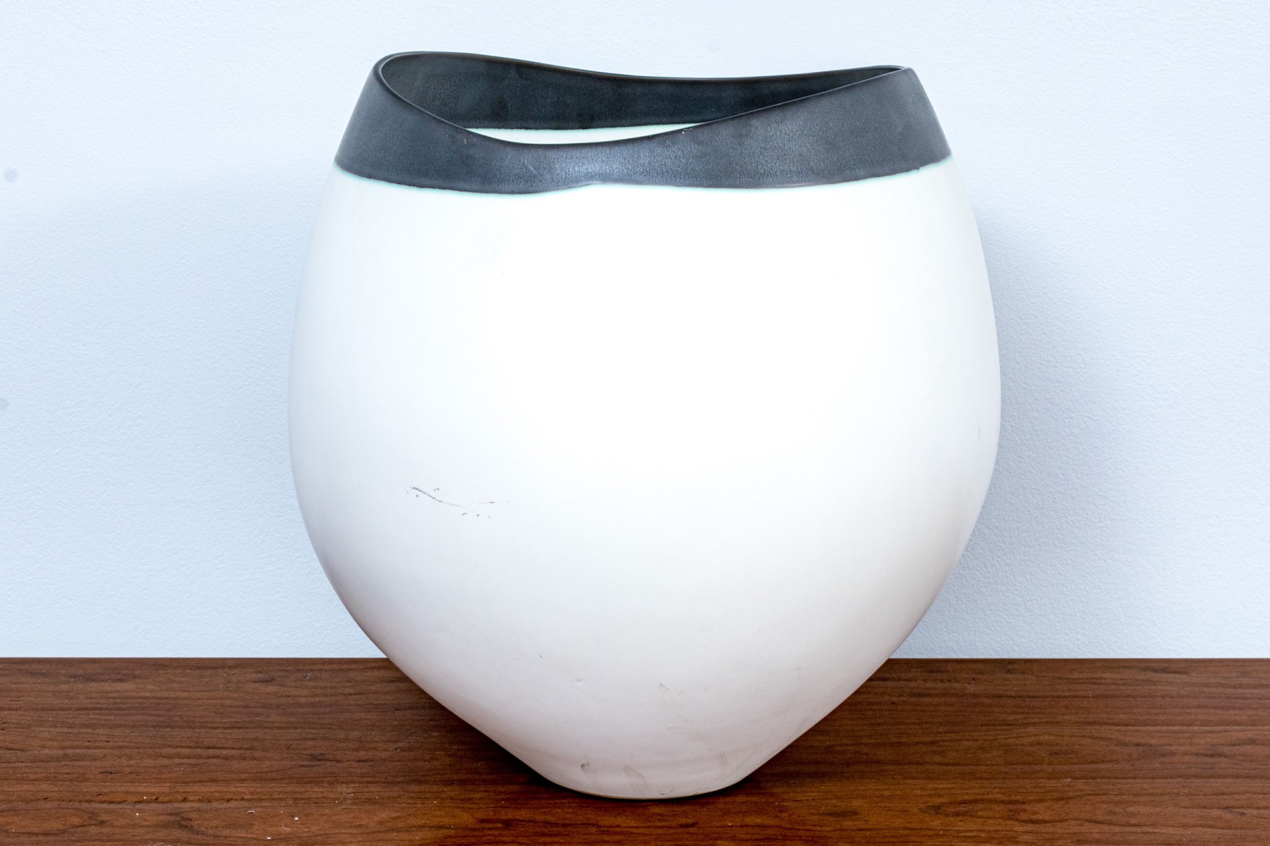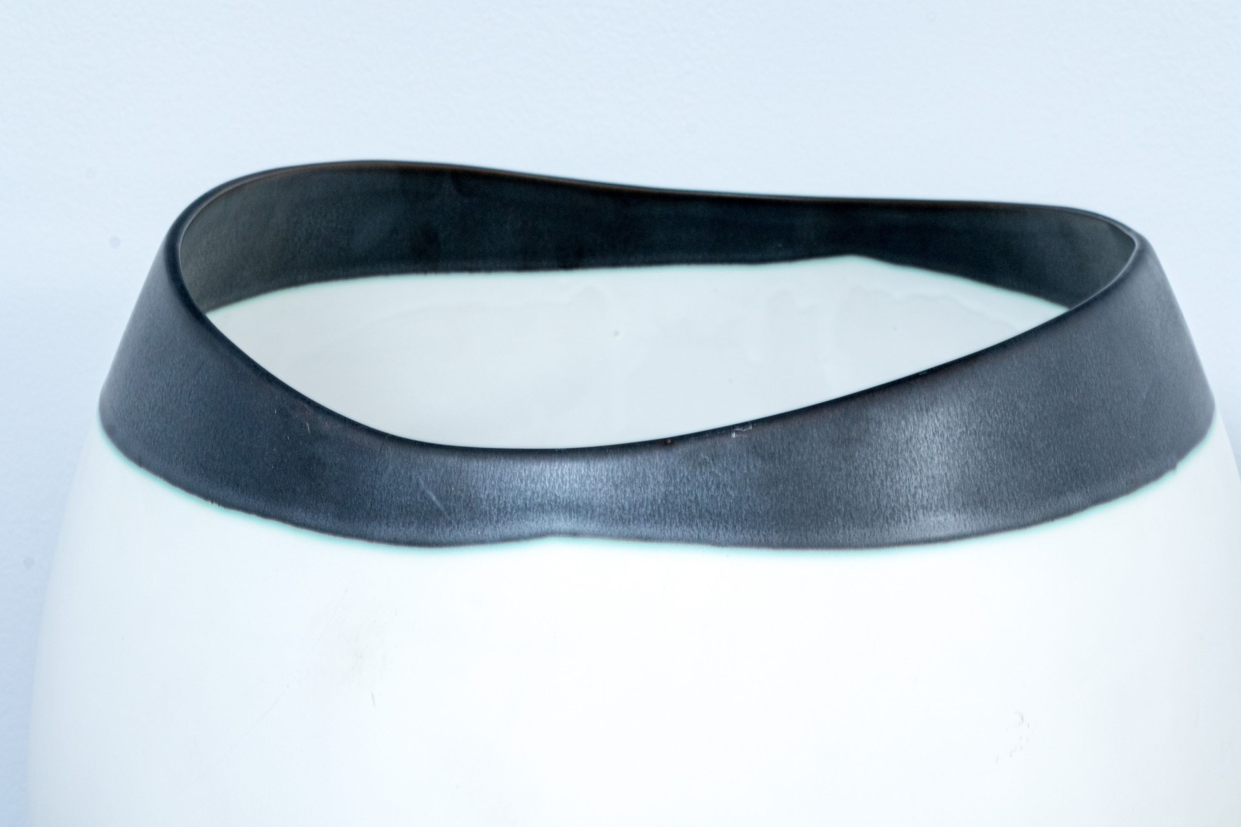 A stylish and contemporary large Zodax Tasso ceramic vase sporting a swooping rim accentuated by an organic and subtly asymmetrical black glazed trim over a bright white ovoid body. A striking piece balancing an eye-catching design with a neutral color palette to allow whatever floral arrangement adorns it to shine.