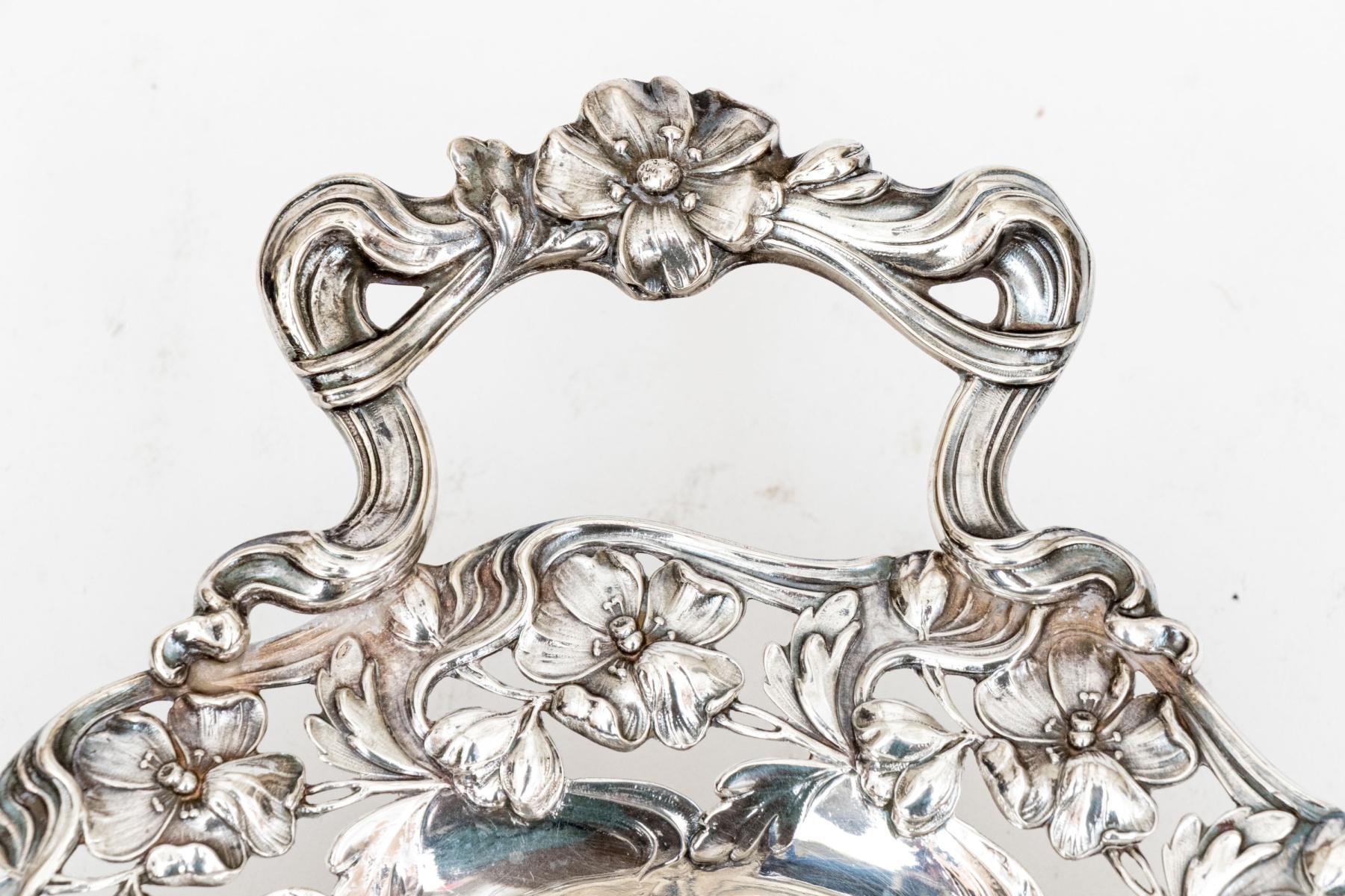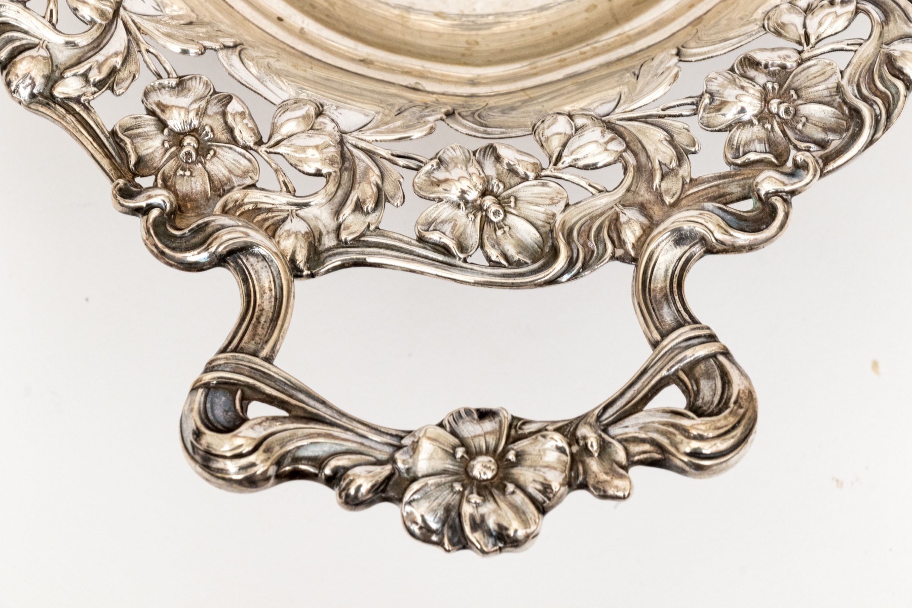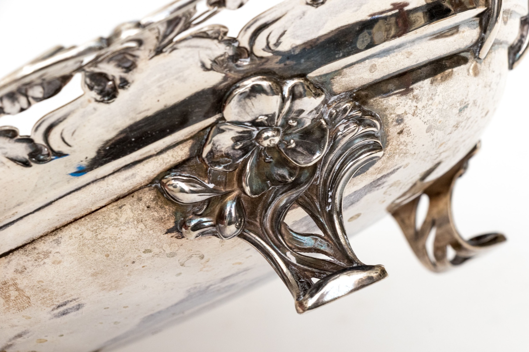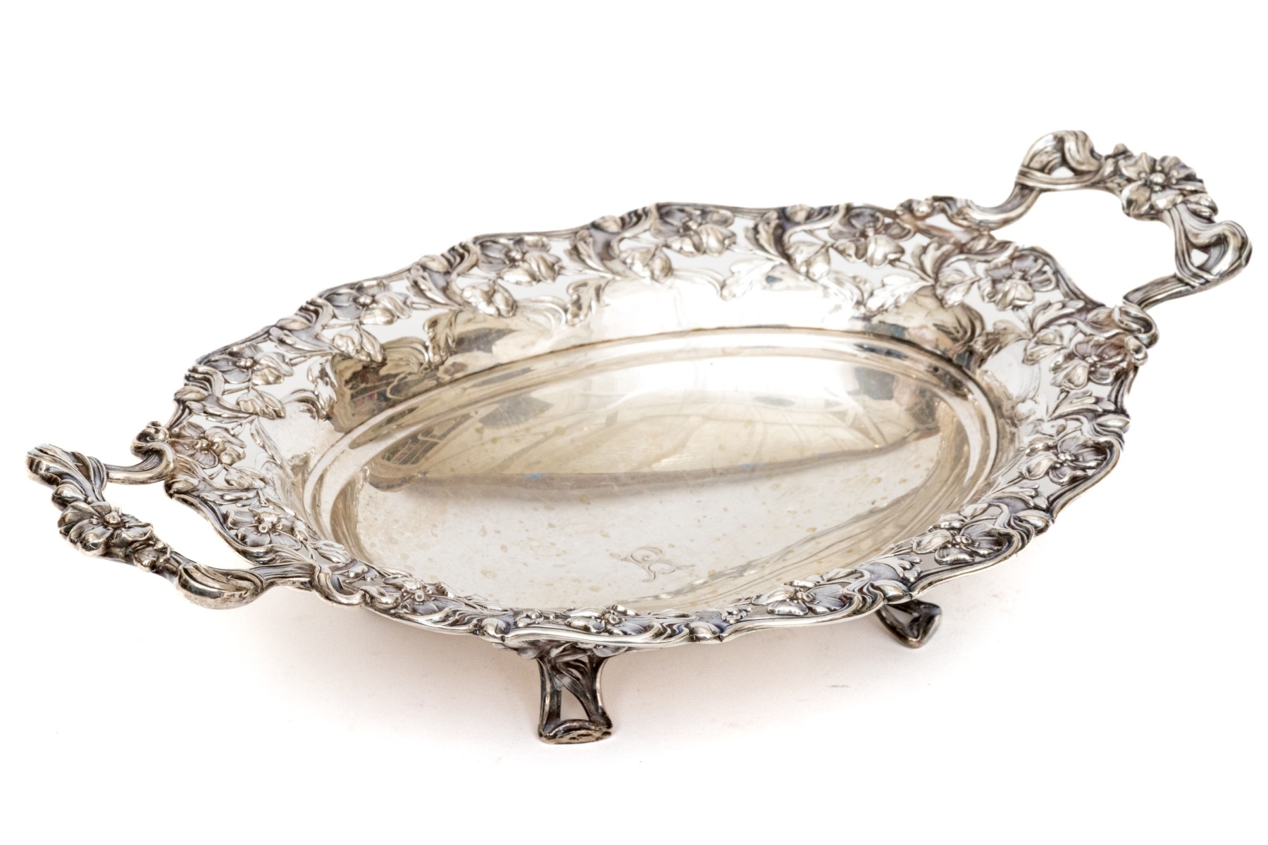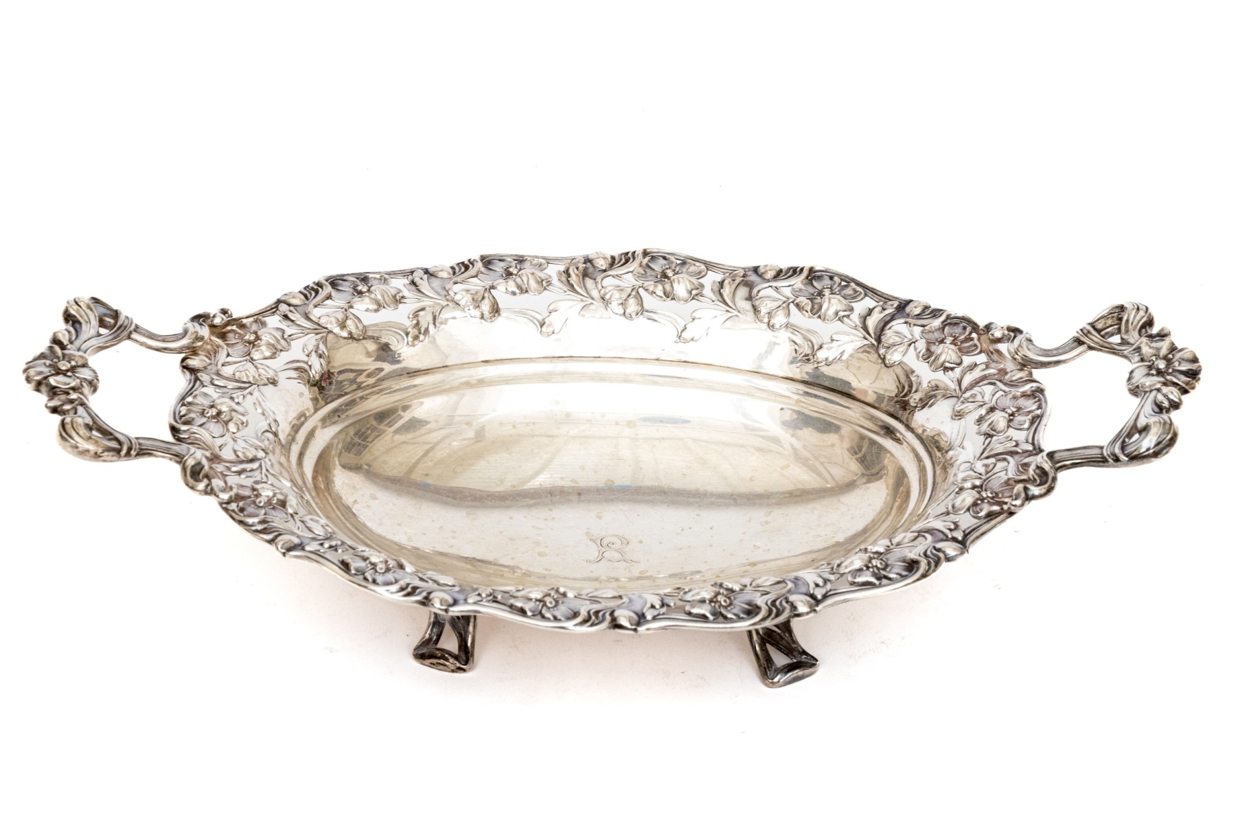A charming continental .800 silver centerpiece bowl showcasing a wide scalloped rim of decadent floral repousse flanked by large twin handles with wrapped ribbon and floral motifs adding to the elegant design. The oval bowl is raised on four openwork feet.