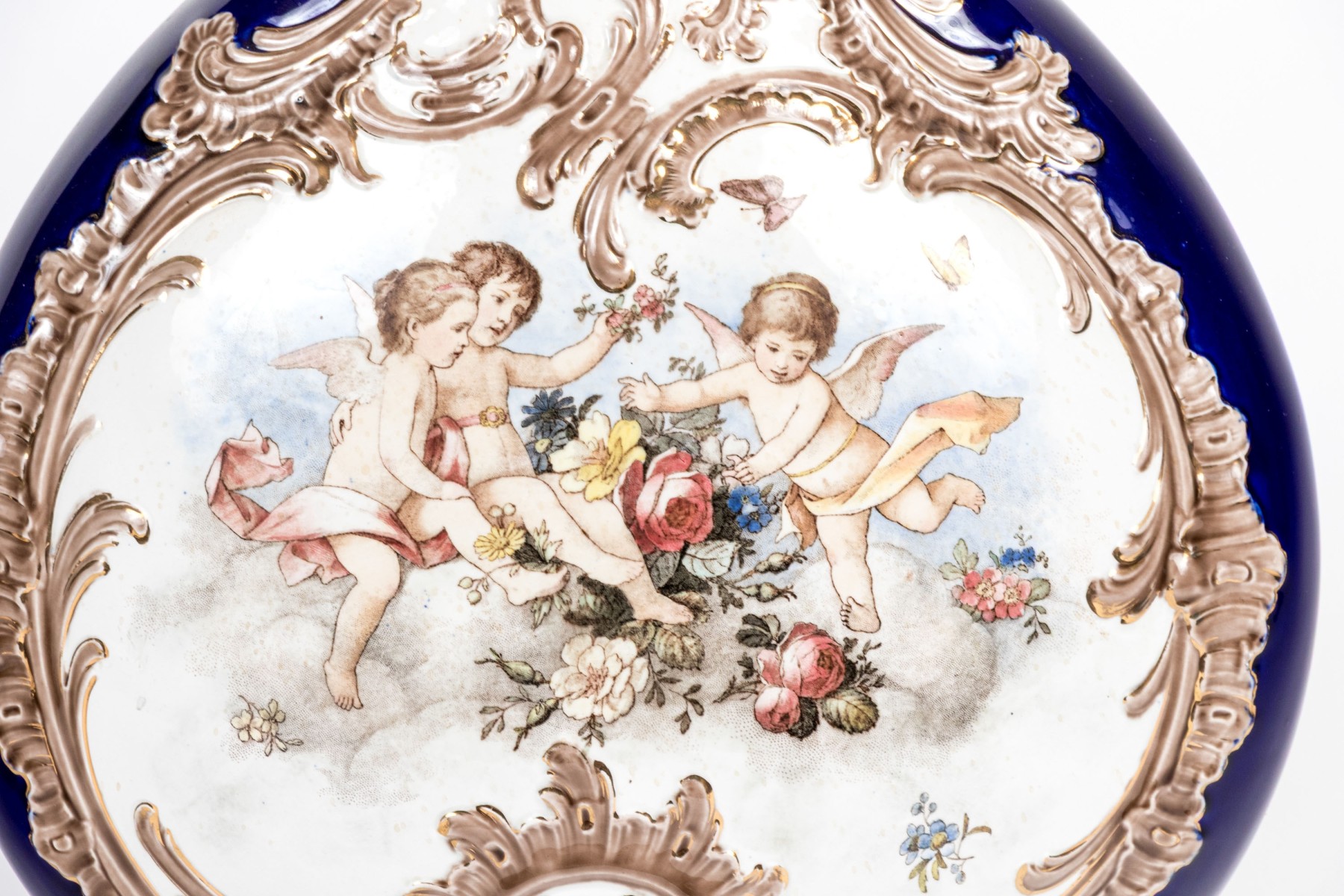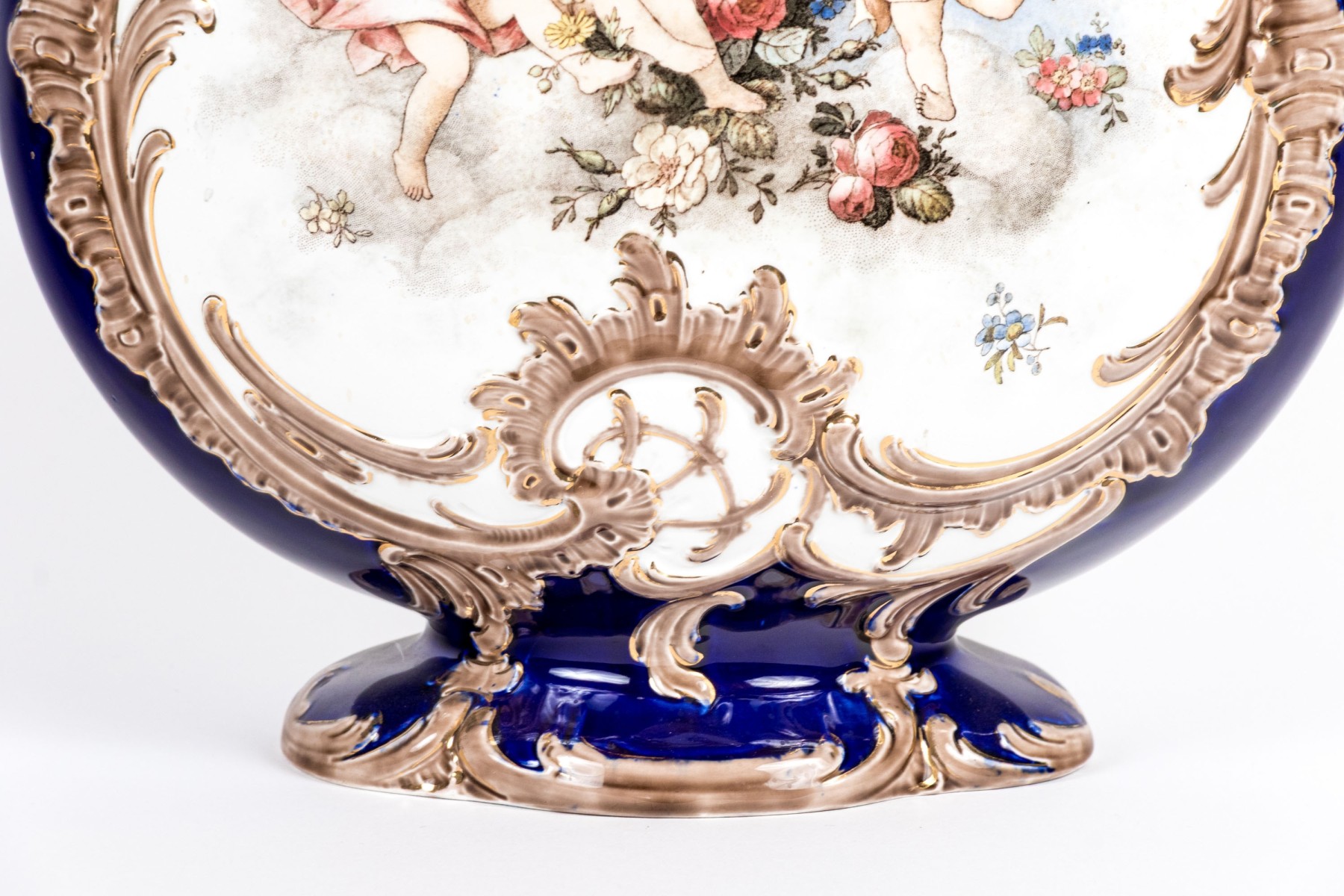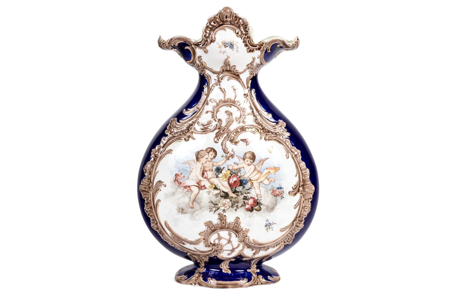 A stately continental ceramic vase designed with a shapely scalloped acanthus rim, pear form body, and quatrefoil base. Glazed in rich cobalt with gilt scrolled motifs. The flattened form body is hand-painted with cherubs in the sky within scrolled reserves. Marked underfoot.