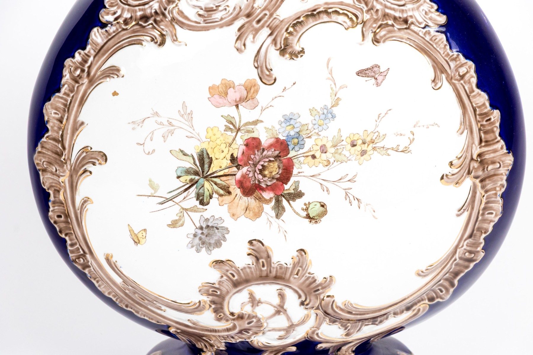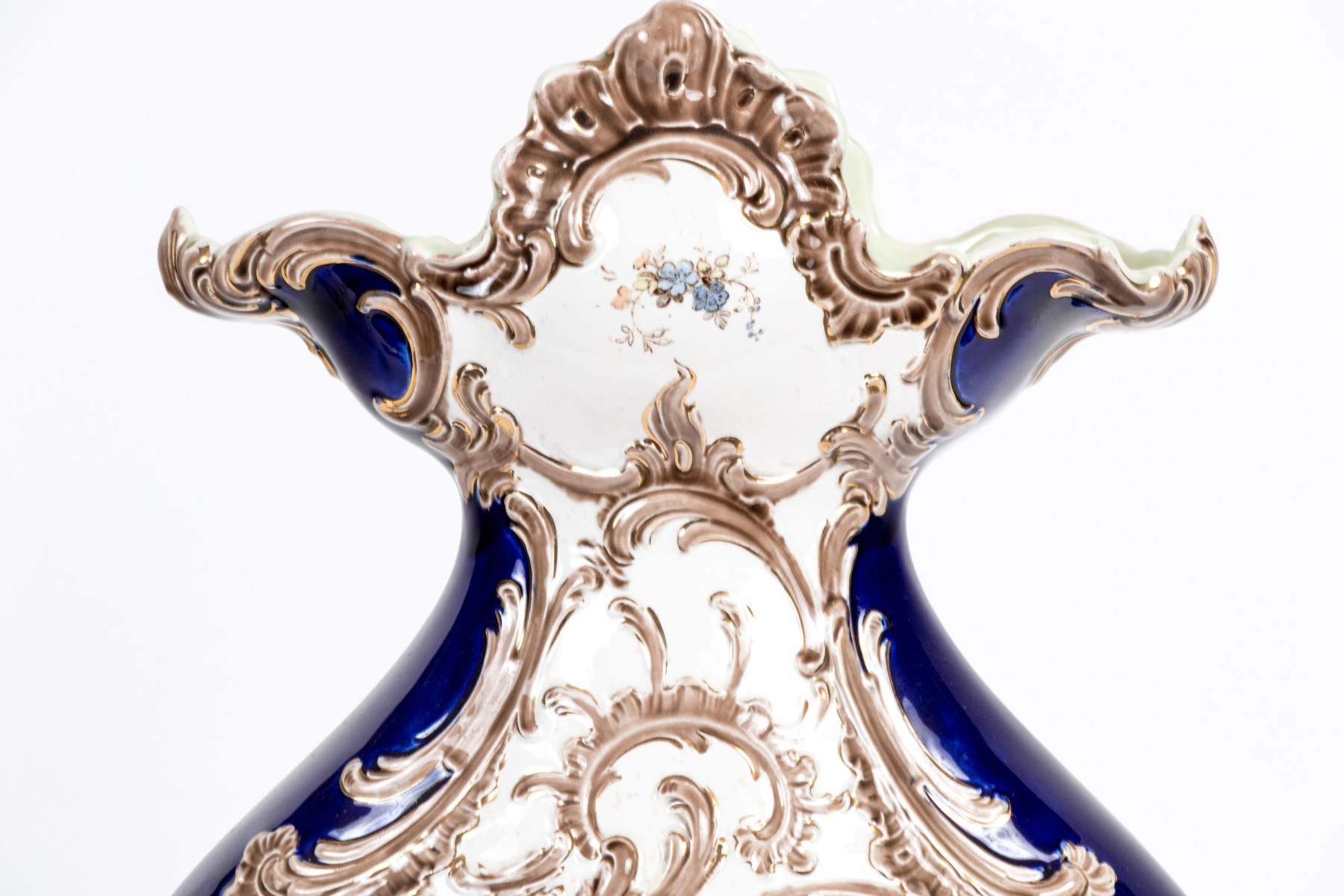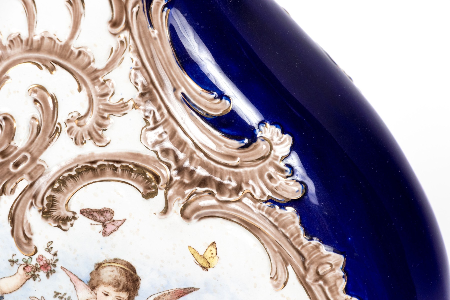 A stately continental ceramic vase designed with a shapely scalloped acanthus rim, pear form body, and quatrefoil base. Glazed in rich cobalt with gilt scrolled motifs. The flattened form body is hand-painted with cherubs in the sky within scrolled reserves. Marked underfoot.