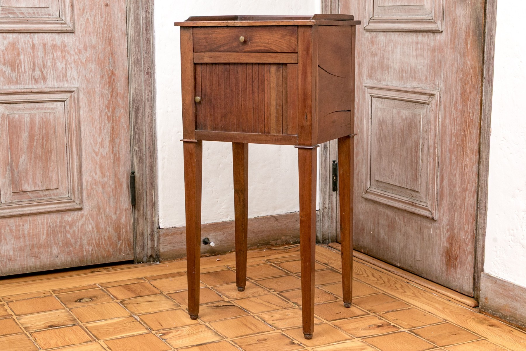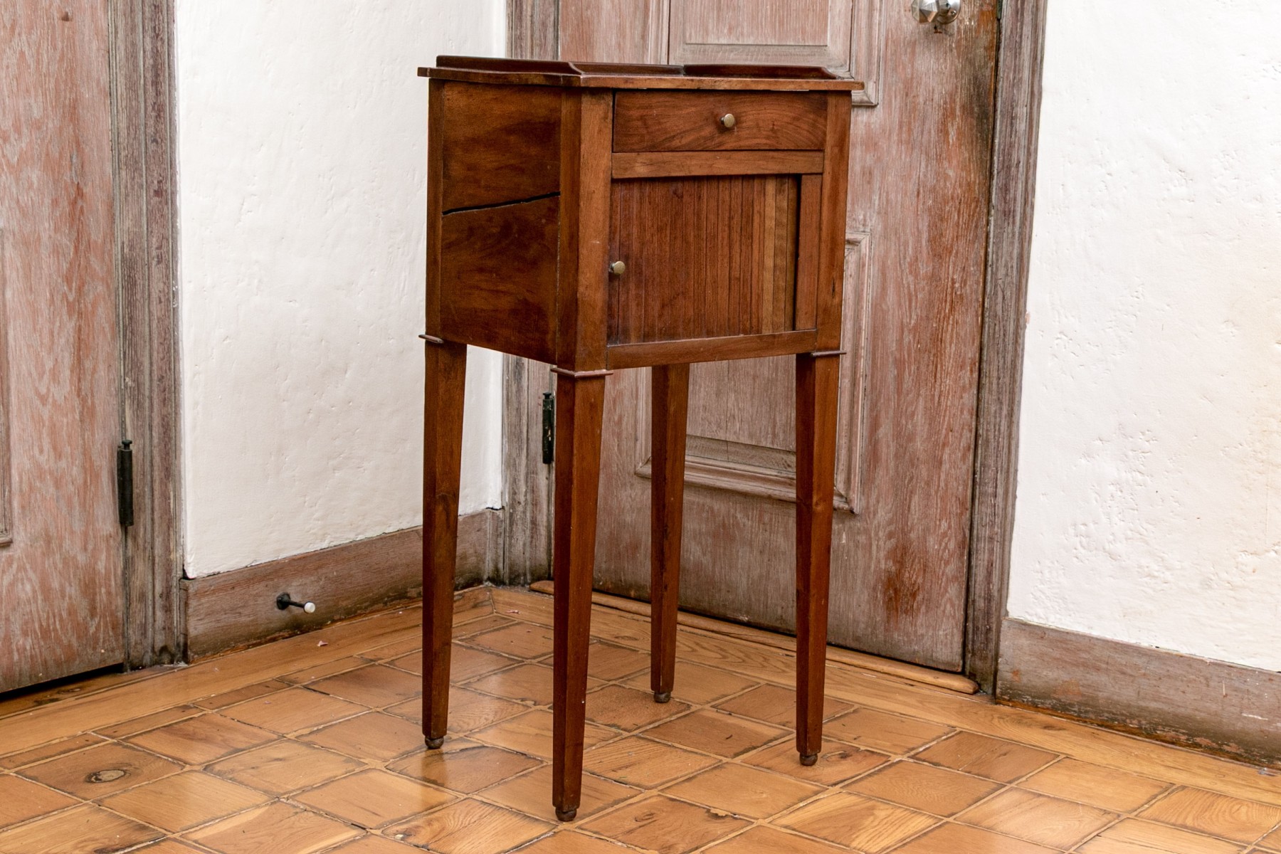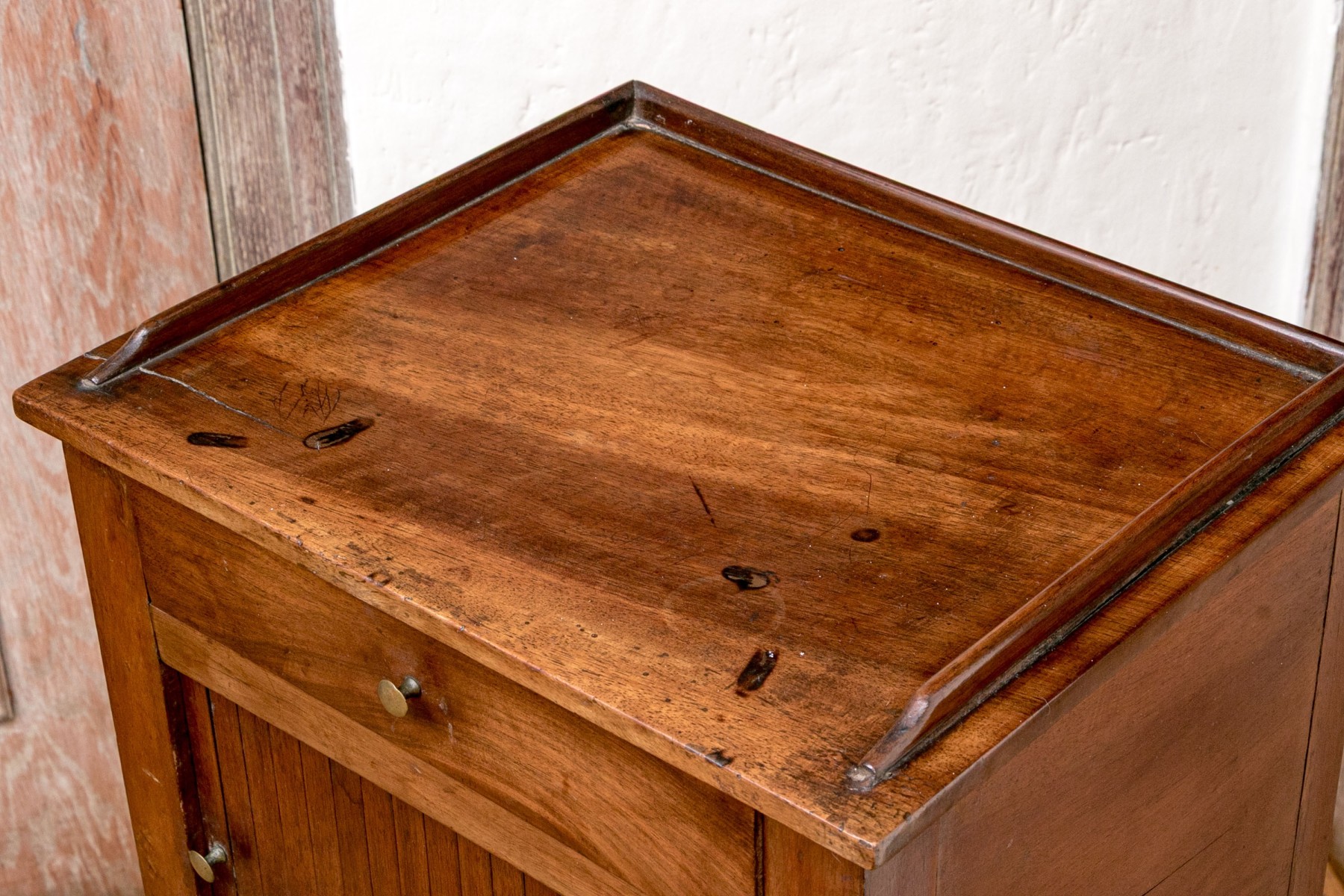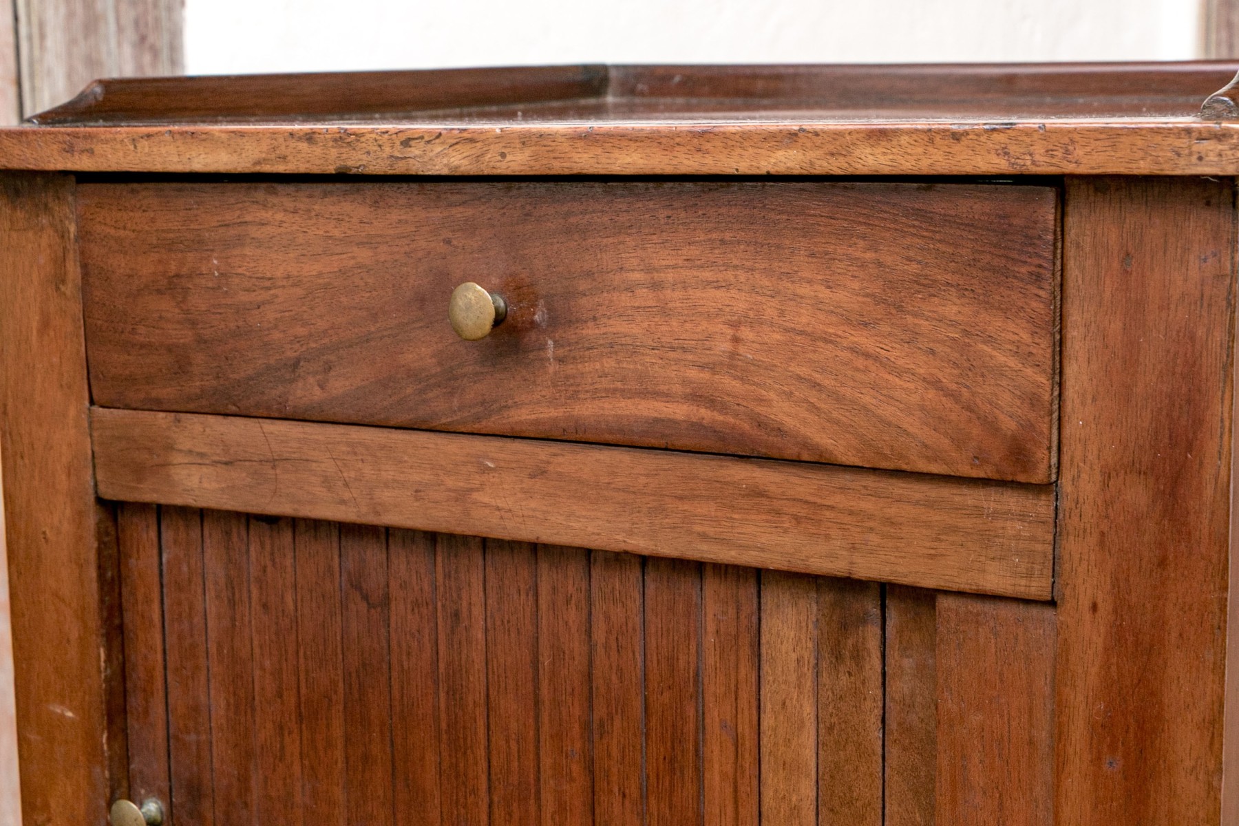 A wonderful antique end table in warm brown walnut, showcasing a short three-quarter gallery around the rectangular top. The body features a single drawer and tambour sliding door cabinet both adorned with simple circular brass knobs. The cabinet interior is detailed with a white and green fleur-de-lis motif liner. Raised on simple tapered legs with small bun feet.