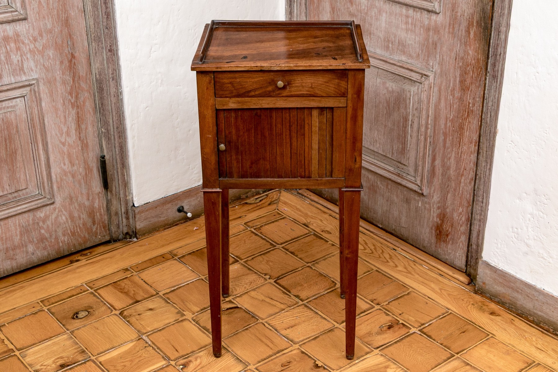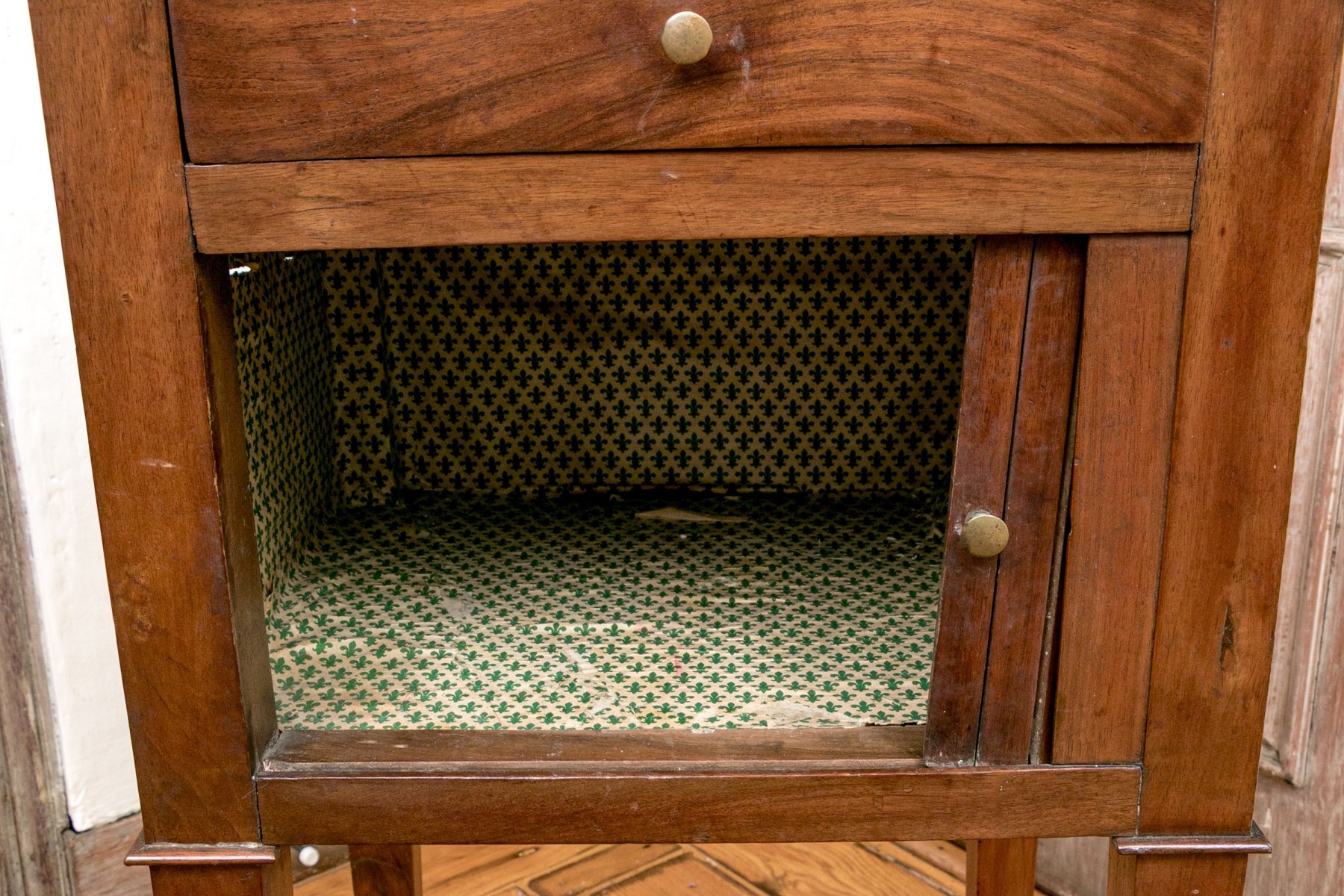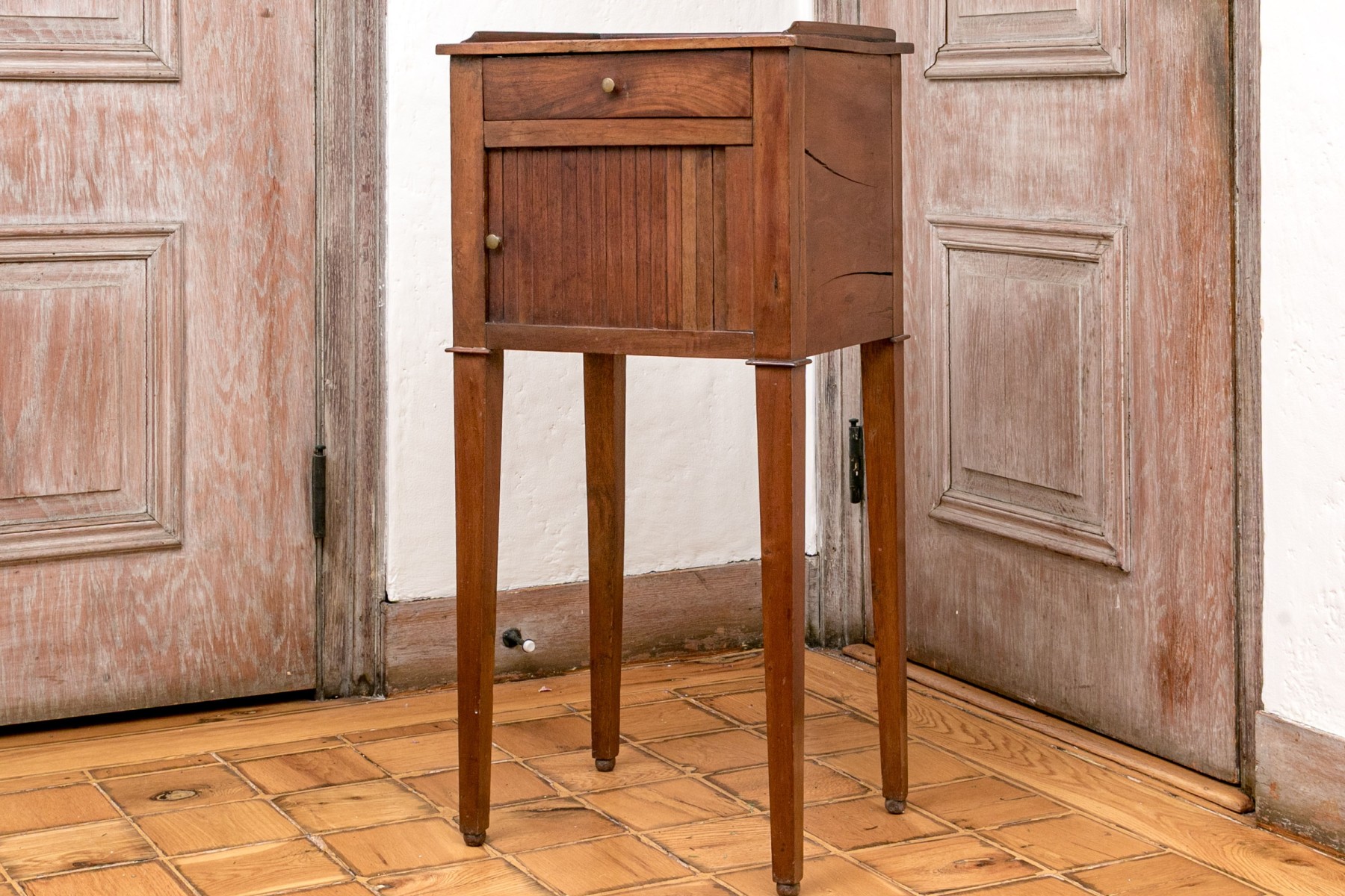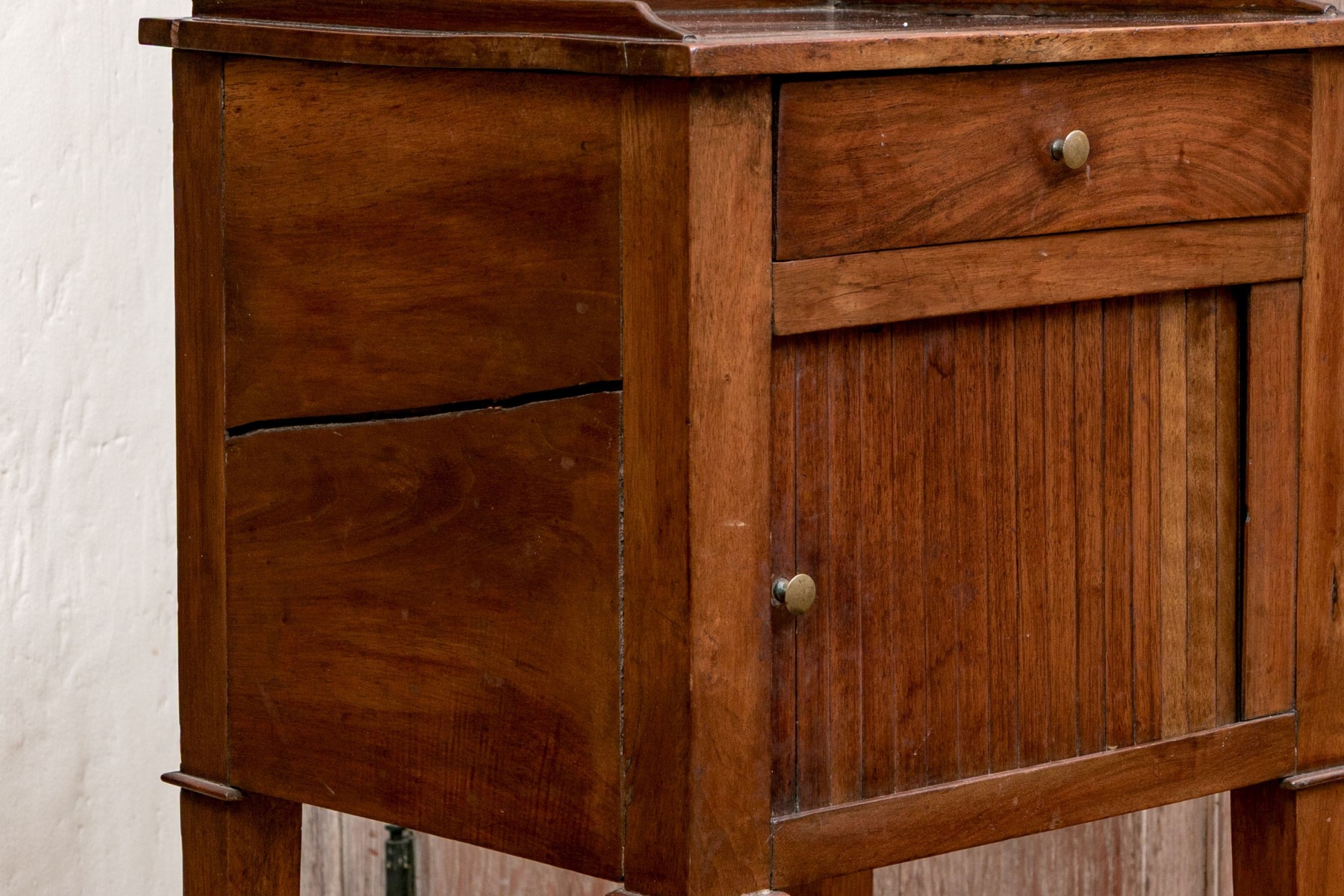 A wonderful antique end table in warm brown walnut, showcasing a short three-quarter gallery around the rectangular top. The body features a single drawer and tambour sliding door cabinet both adorned with simple circular brass knobs. The cabinet interior is detailed with a white and green fleur-de-lis motif liner. Raised on simple tapered legs with small bun feet.