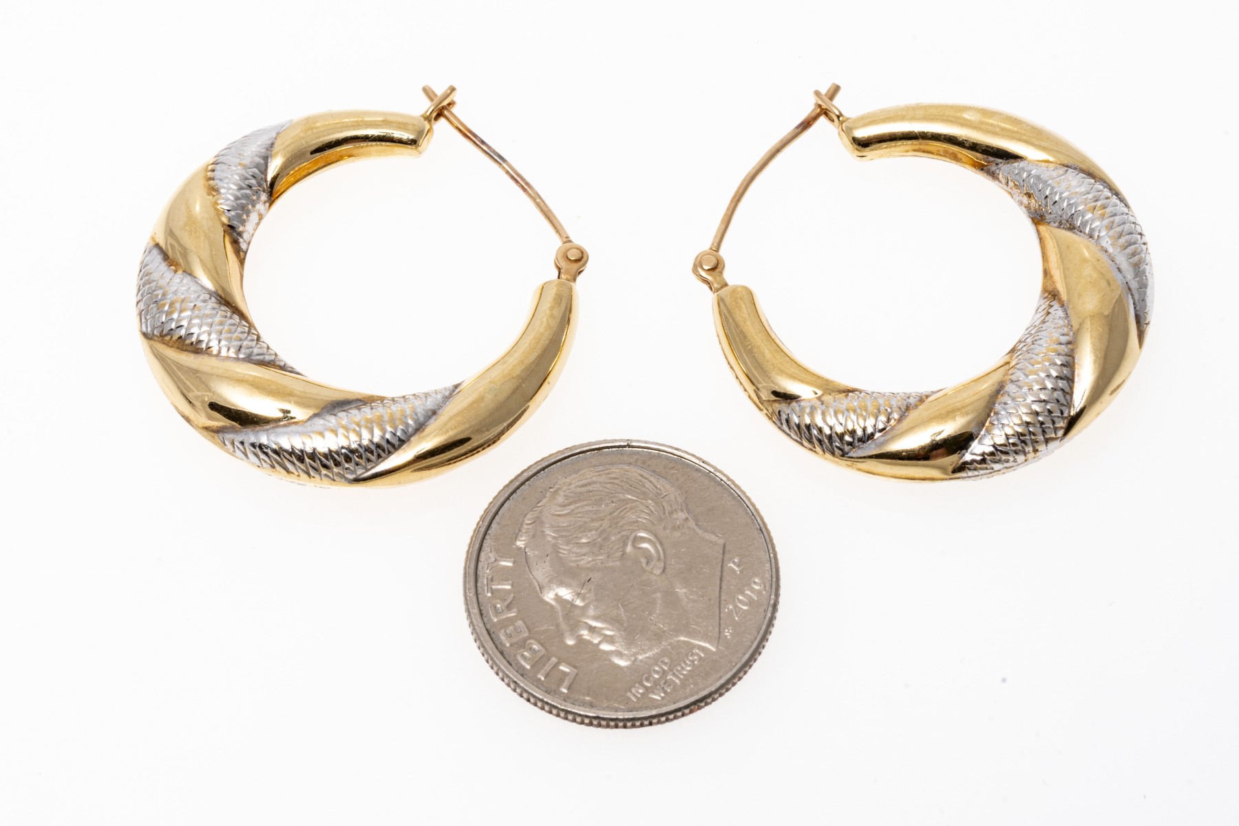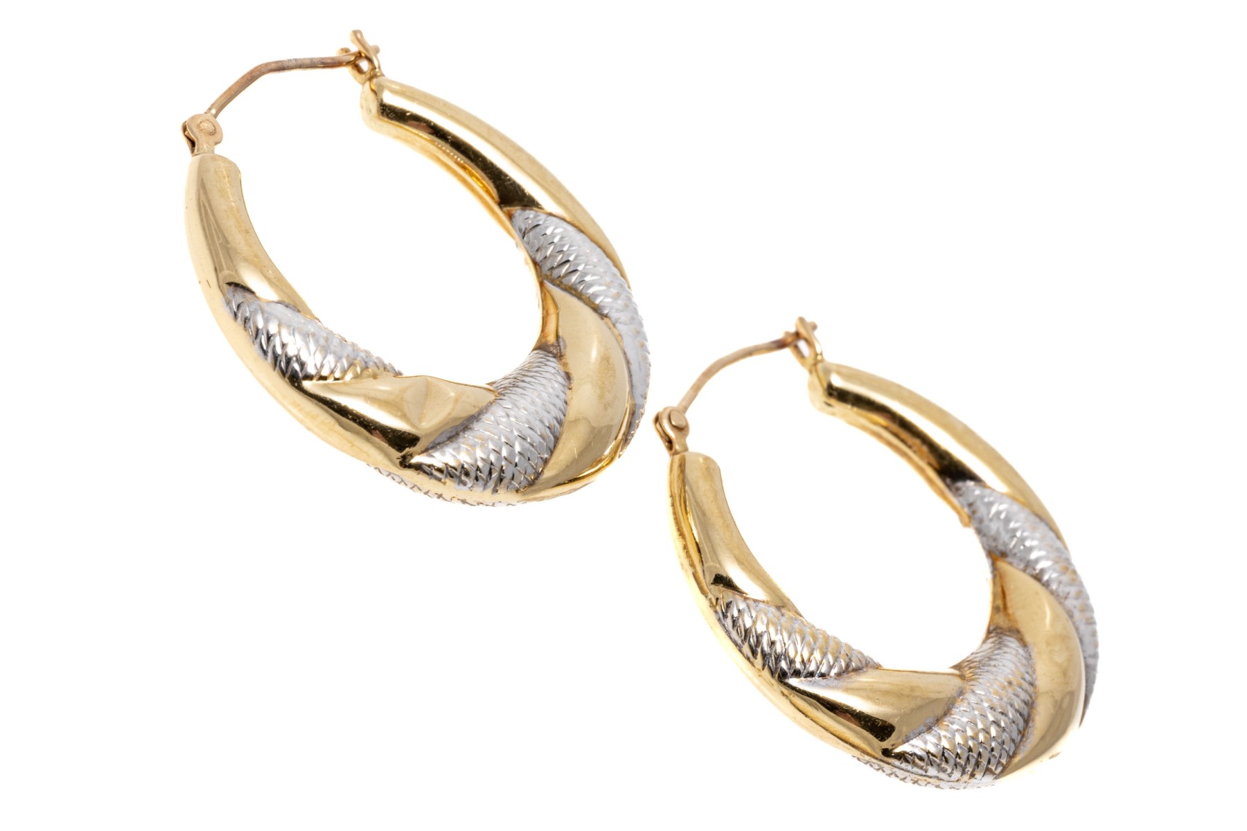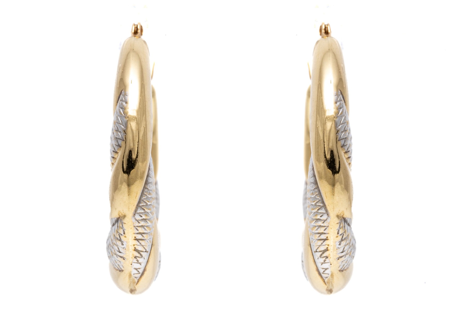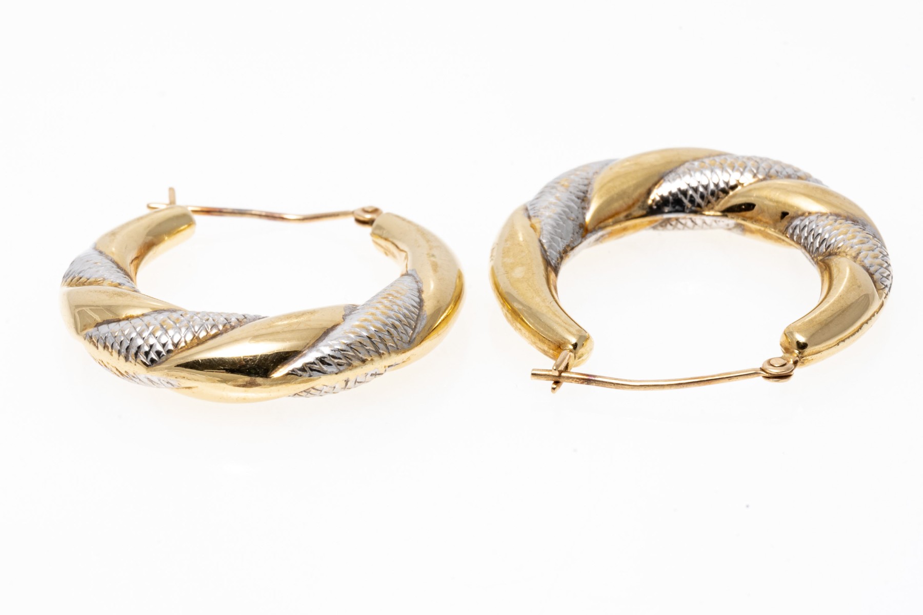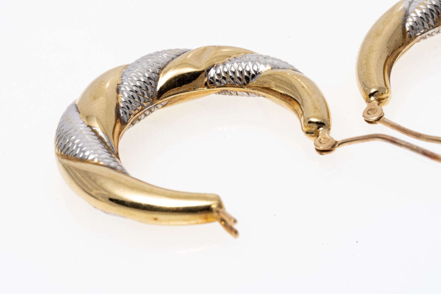 Contrasting 14K white and yellow gold hoop earrings. The earrings have puffed design with spiraled white and yellow design. Leaver post backings.