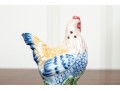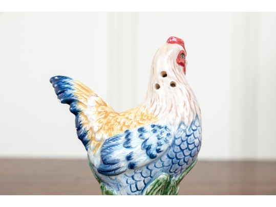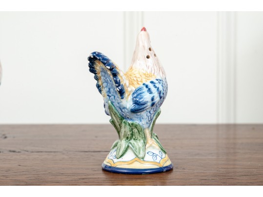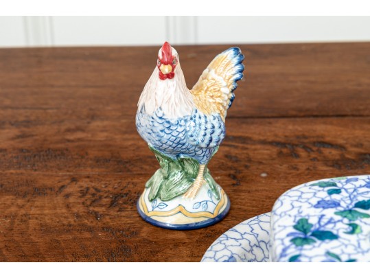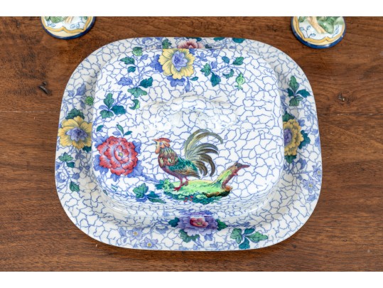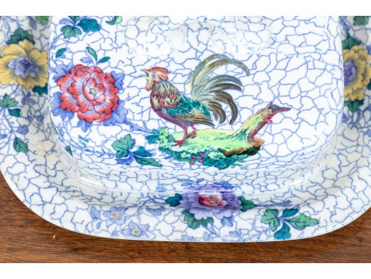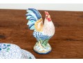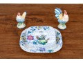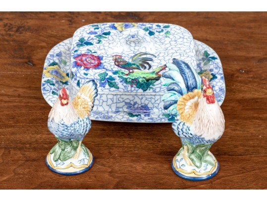 Copeland Spode "Chanticleer" lidded butter dish together with Fitz and Floyd Rooster Salt&pepper. items show signs of wear expected with use. Salt and pepper have contents inside. Butter dish has discoloration and crazing from age and use. Cute table top serving items.