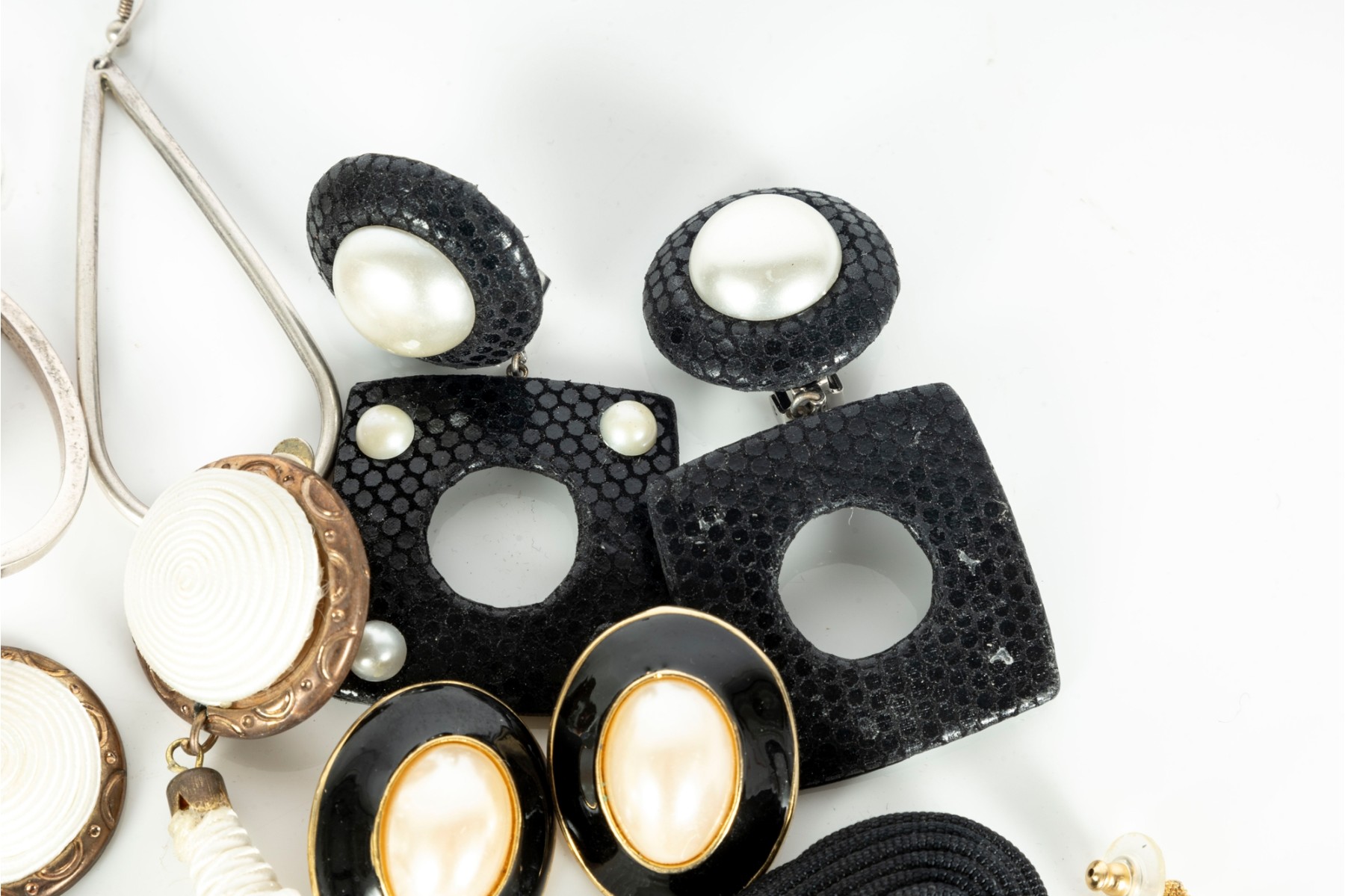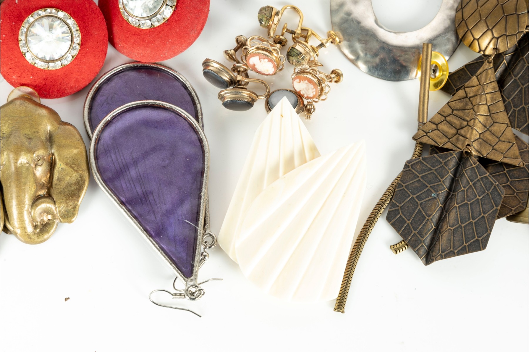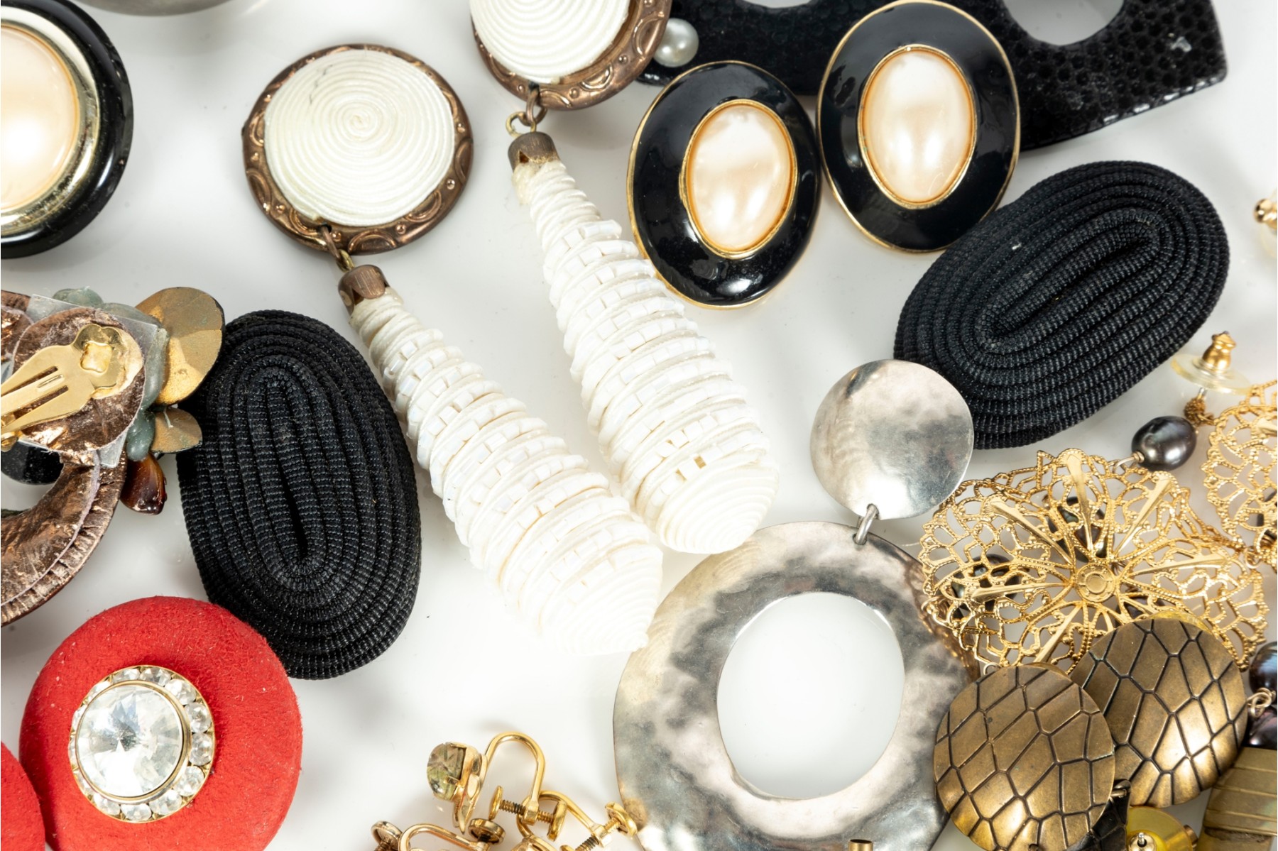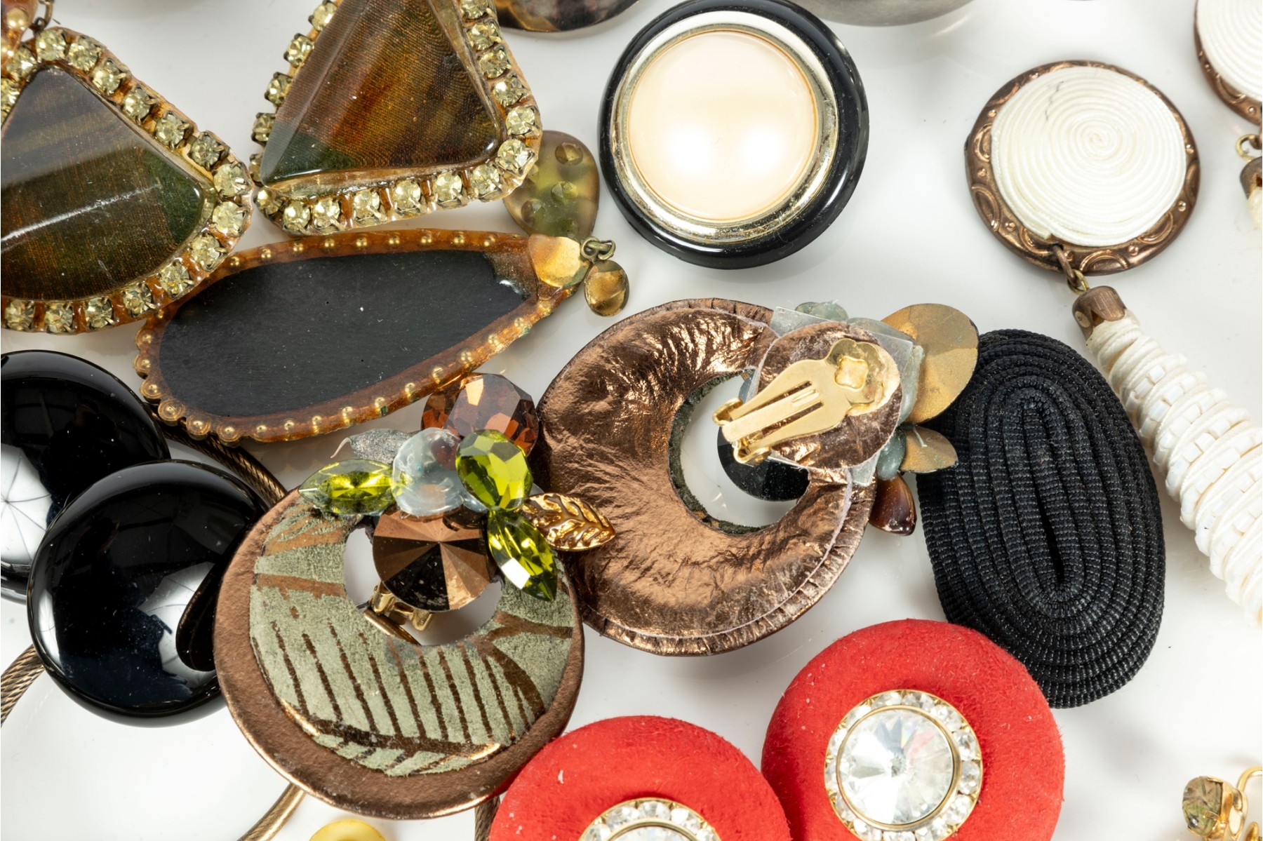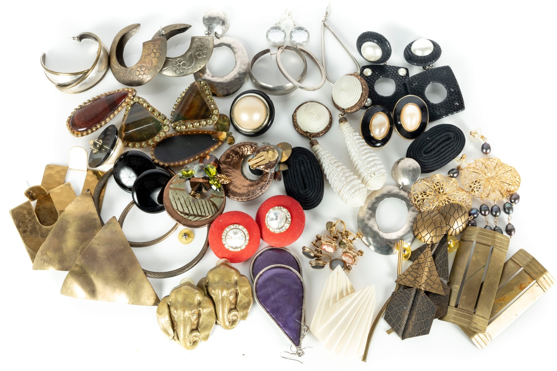 A small collection of intriguing costume jewelry earrings of varying designs. Cotents as shown and sold as is,see photos for details.