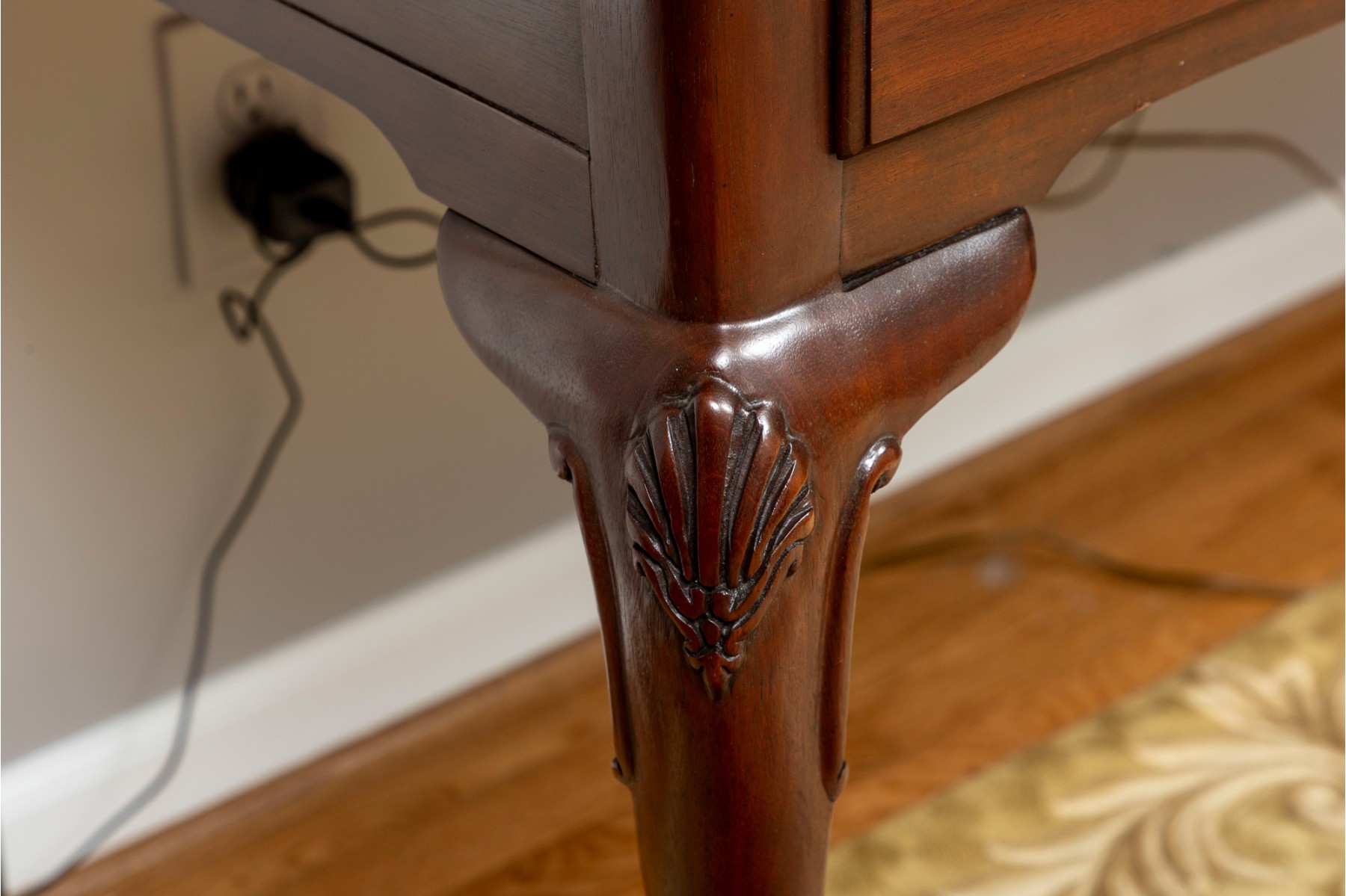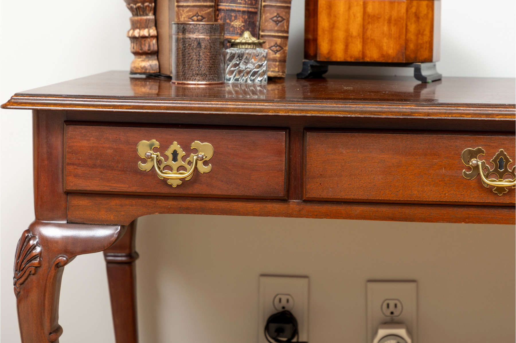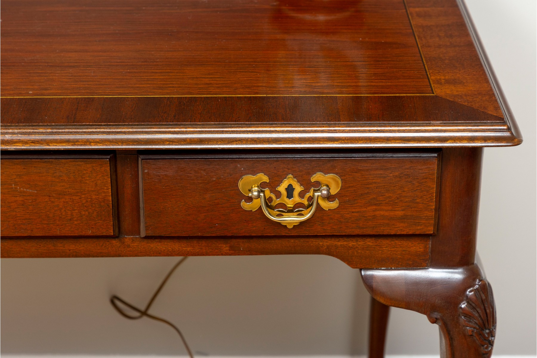 A Queen Anne style cherry writer's desk with inlaid marquetry trim and English cabriole legs ending on pad feet. Procured locally from Councill Craftsmen Furnishings of Denton, North Carolina.