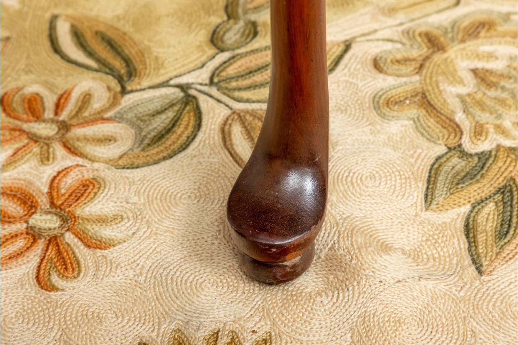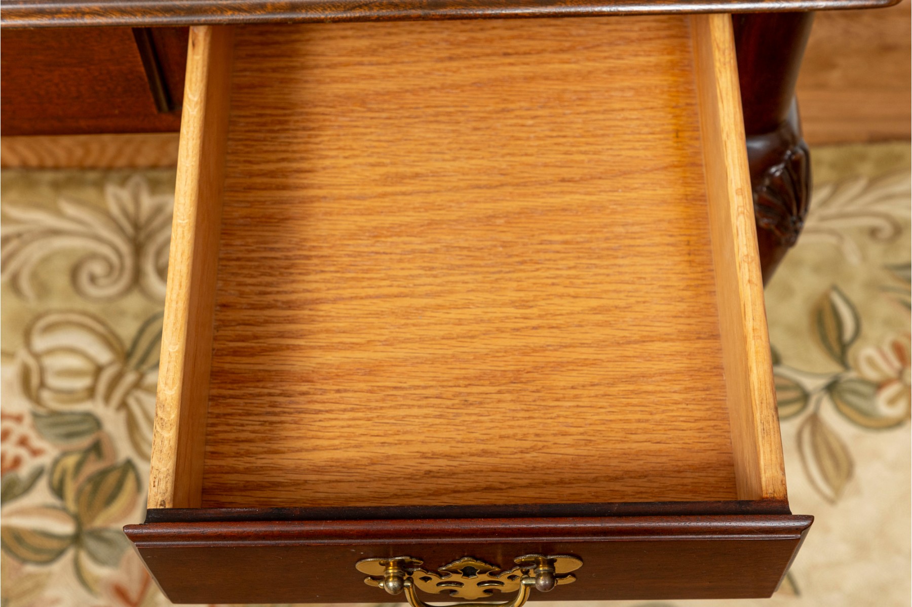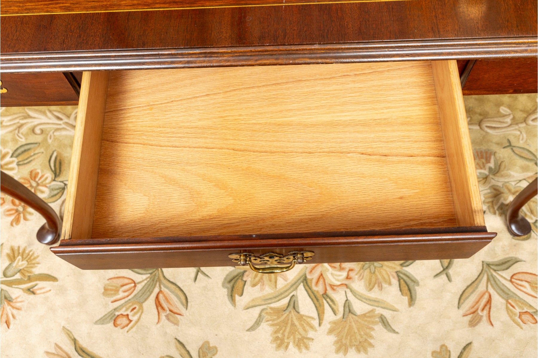 A Queen Anne style cherry writer's desk with inlaid marquetry trim and English cabriole legs ending on pad feet. Procured locally from Councill Craftsmen Furnishings of Denton, North Carolina.