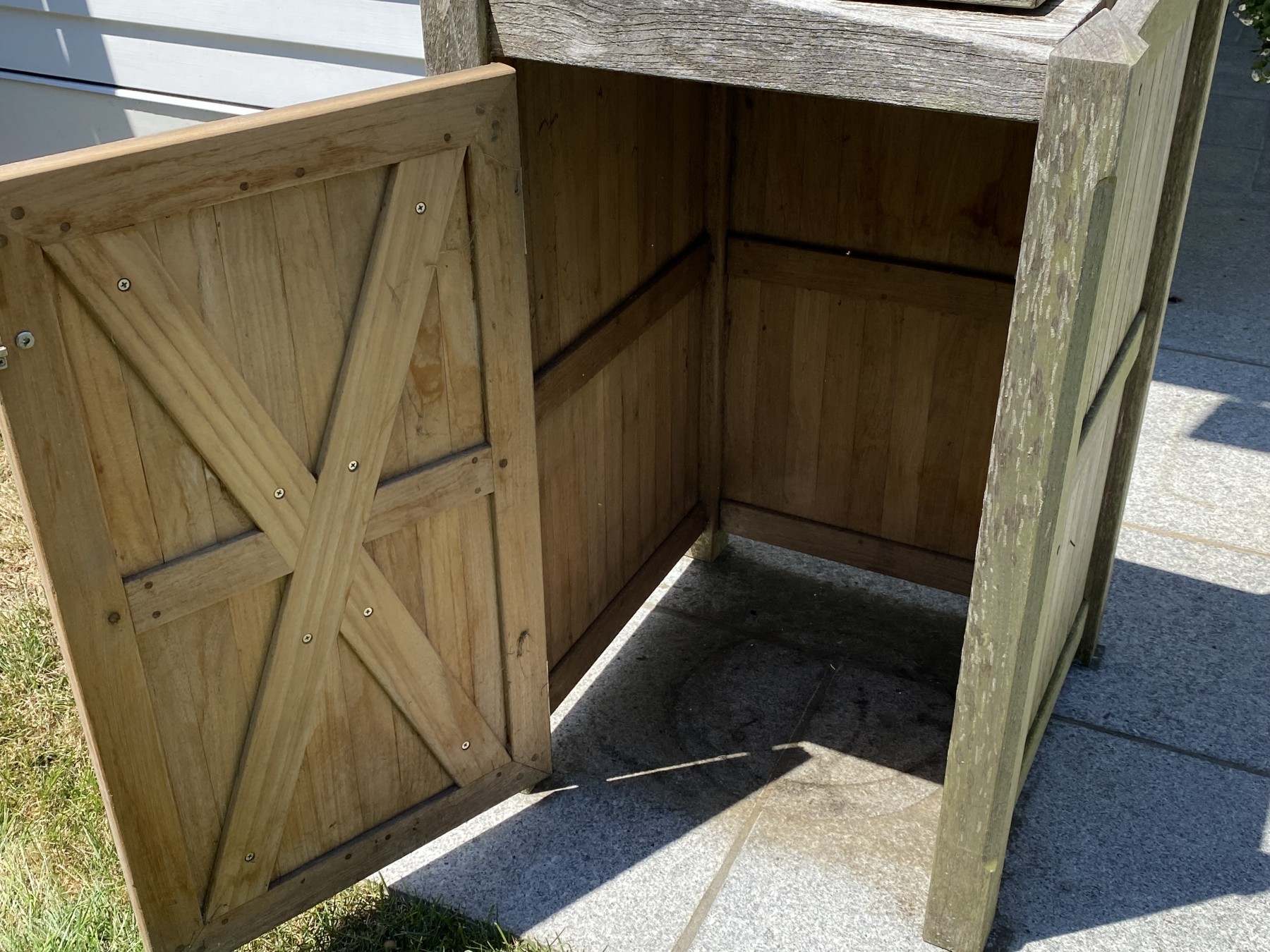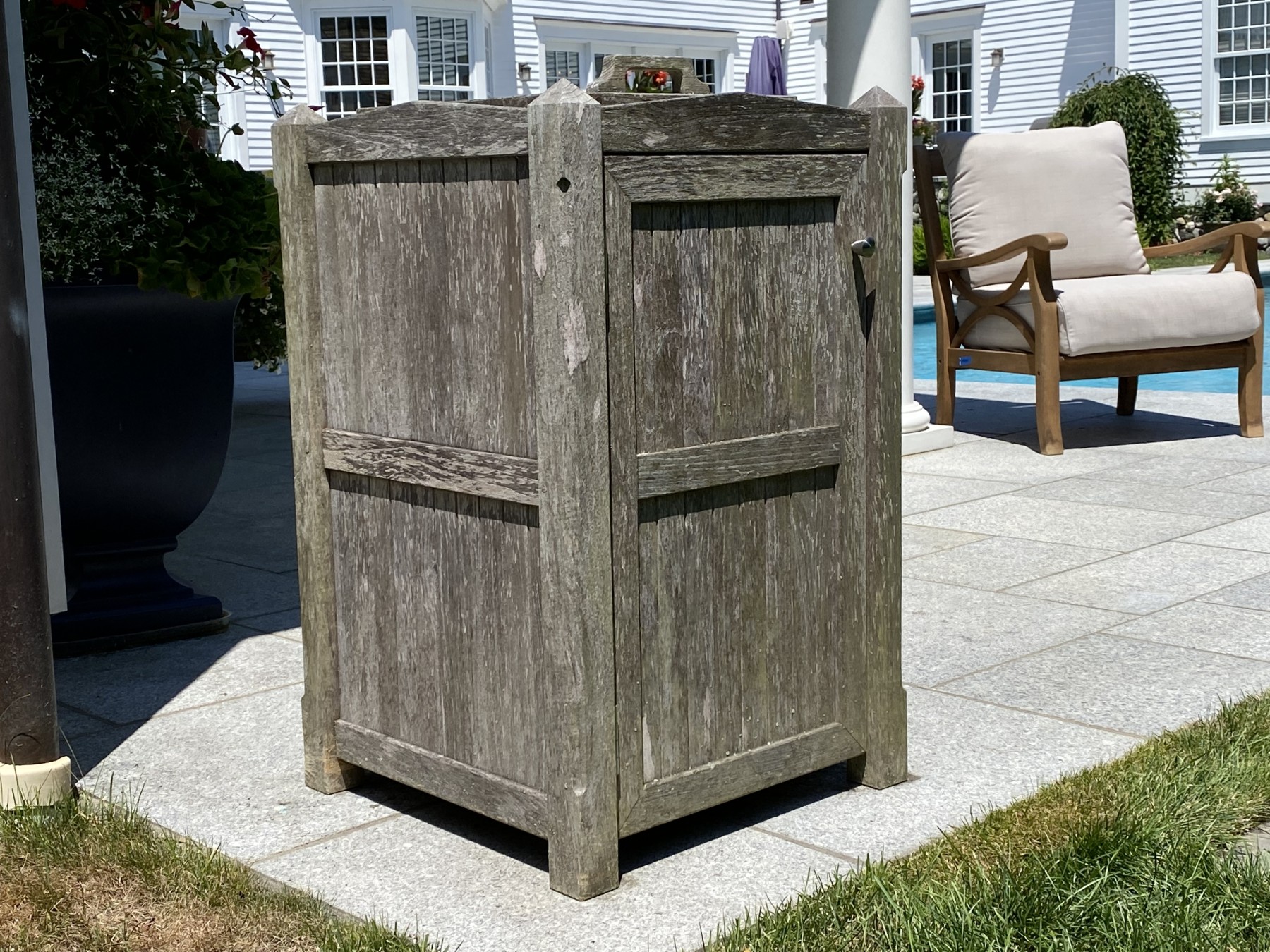 The Teak framed garbage can container is raised on four legs with hinged front door and additional hinged top with handle. No base so that a garbage can go underneath.