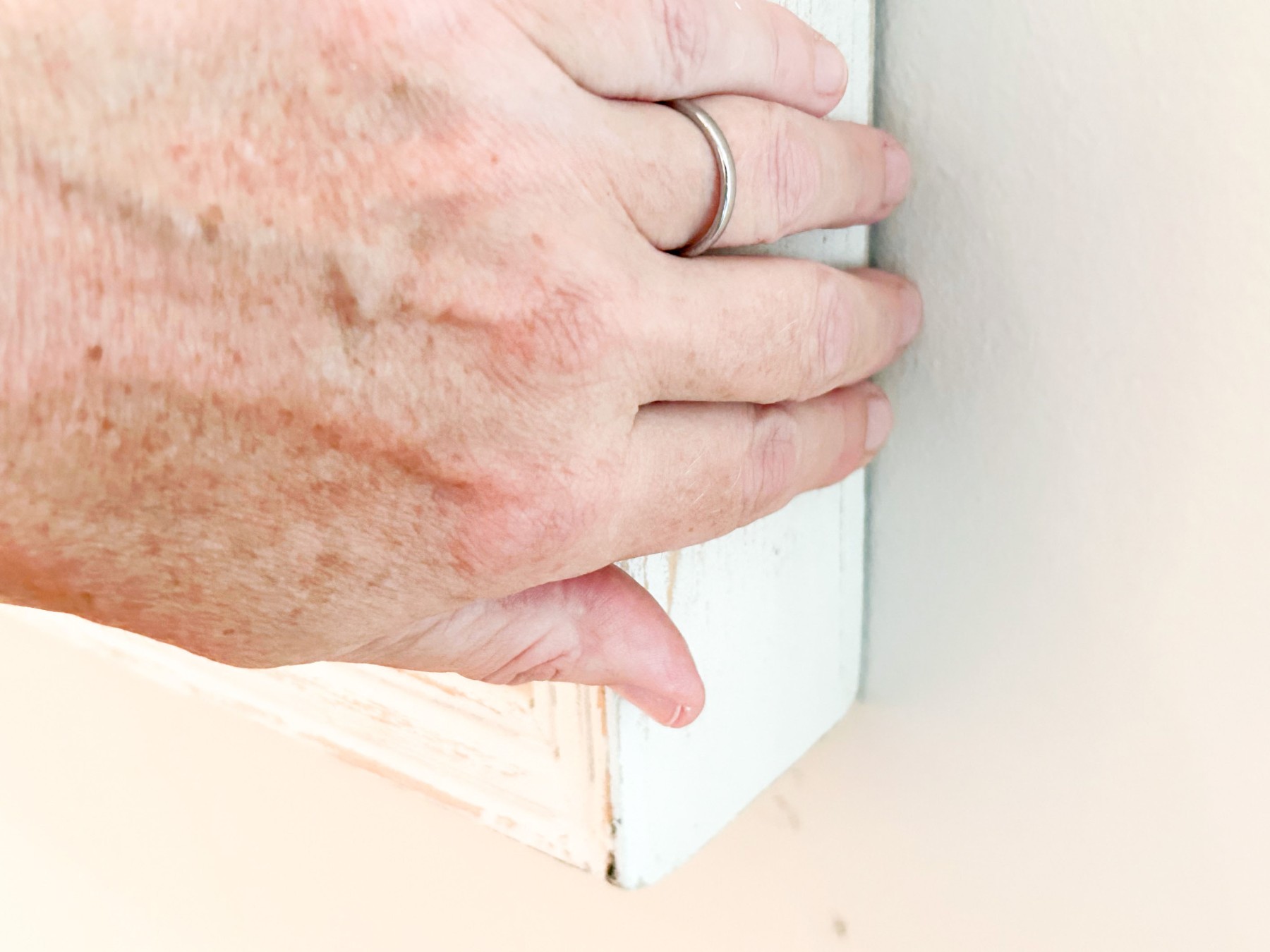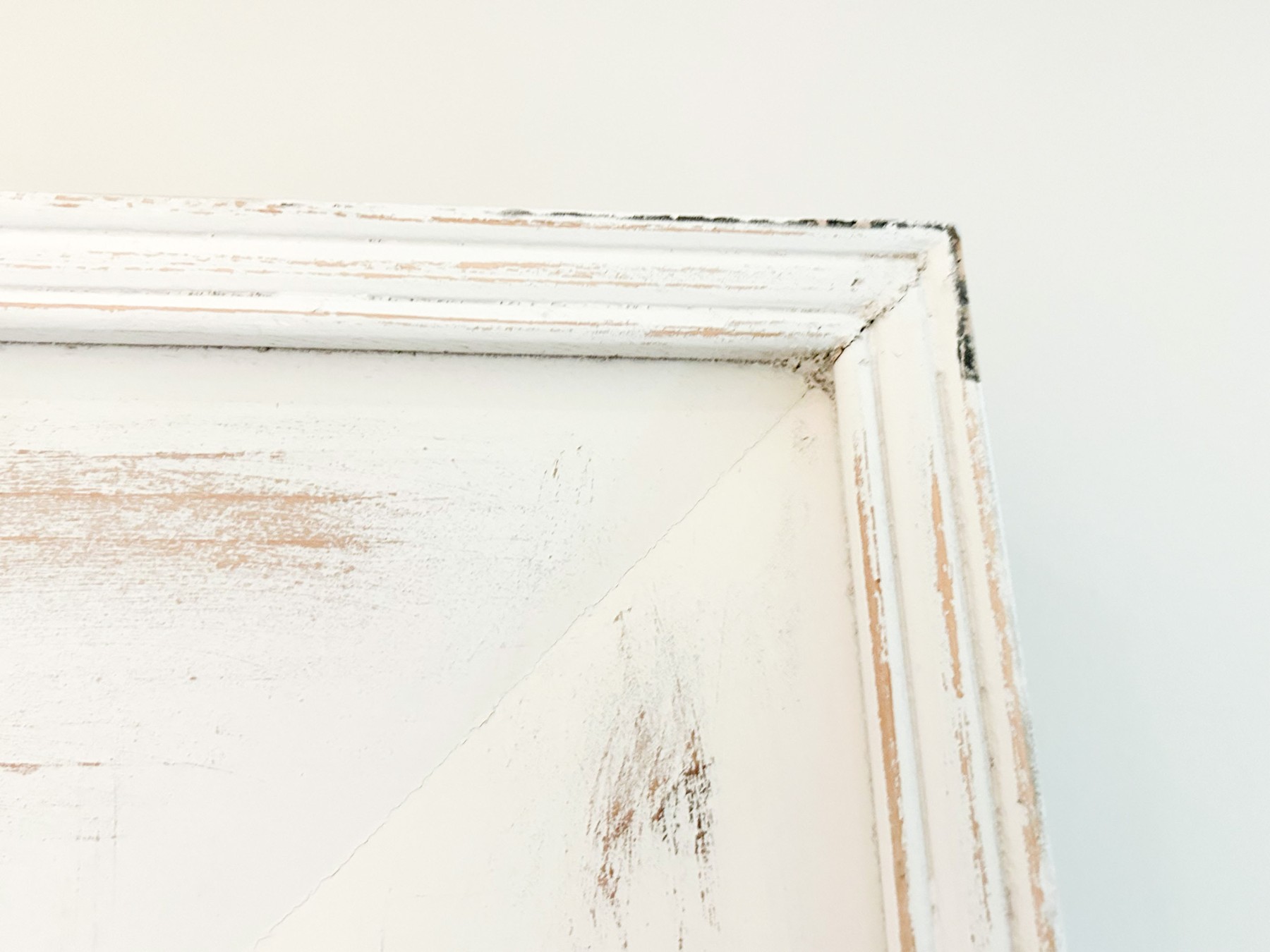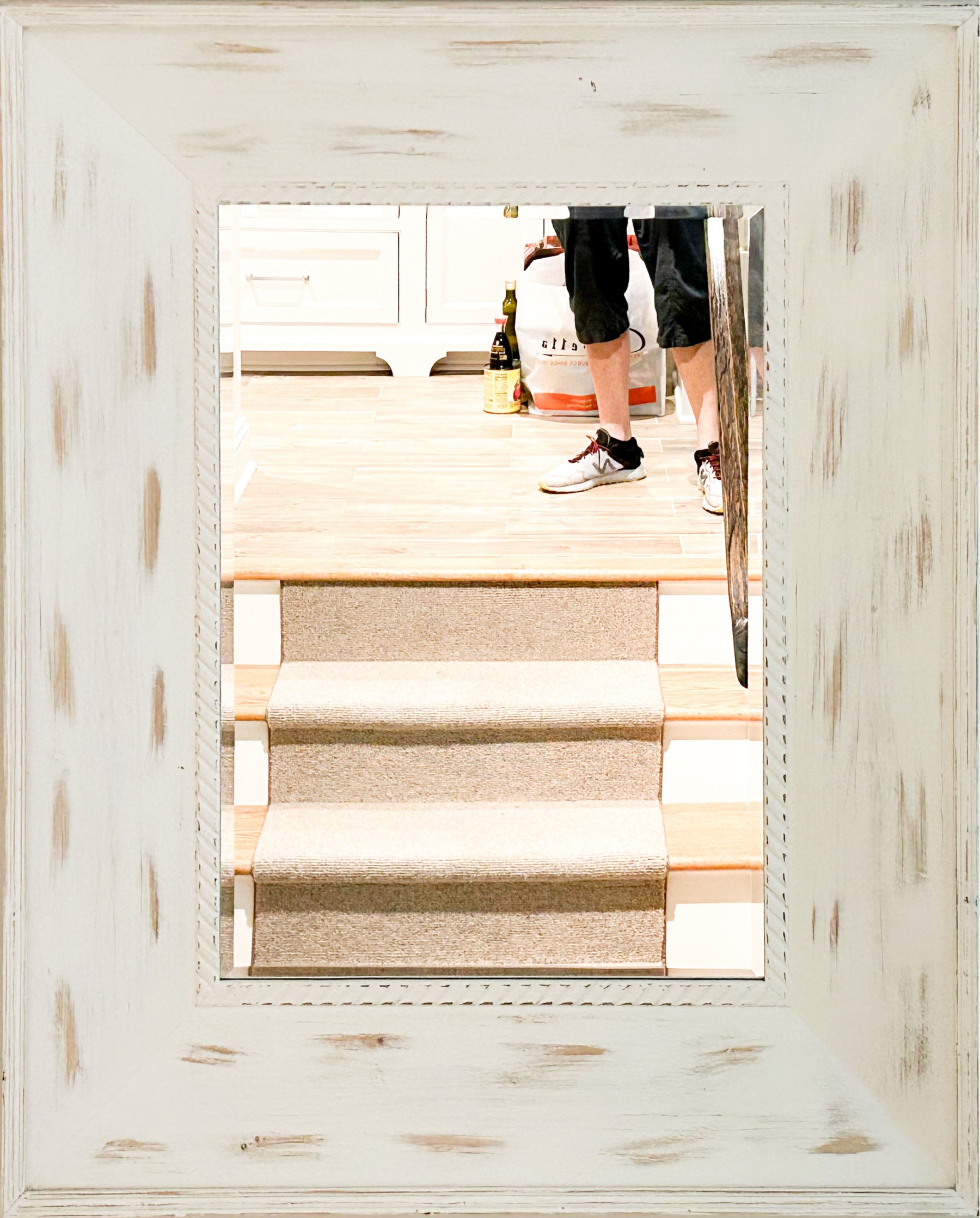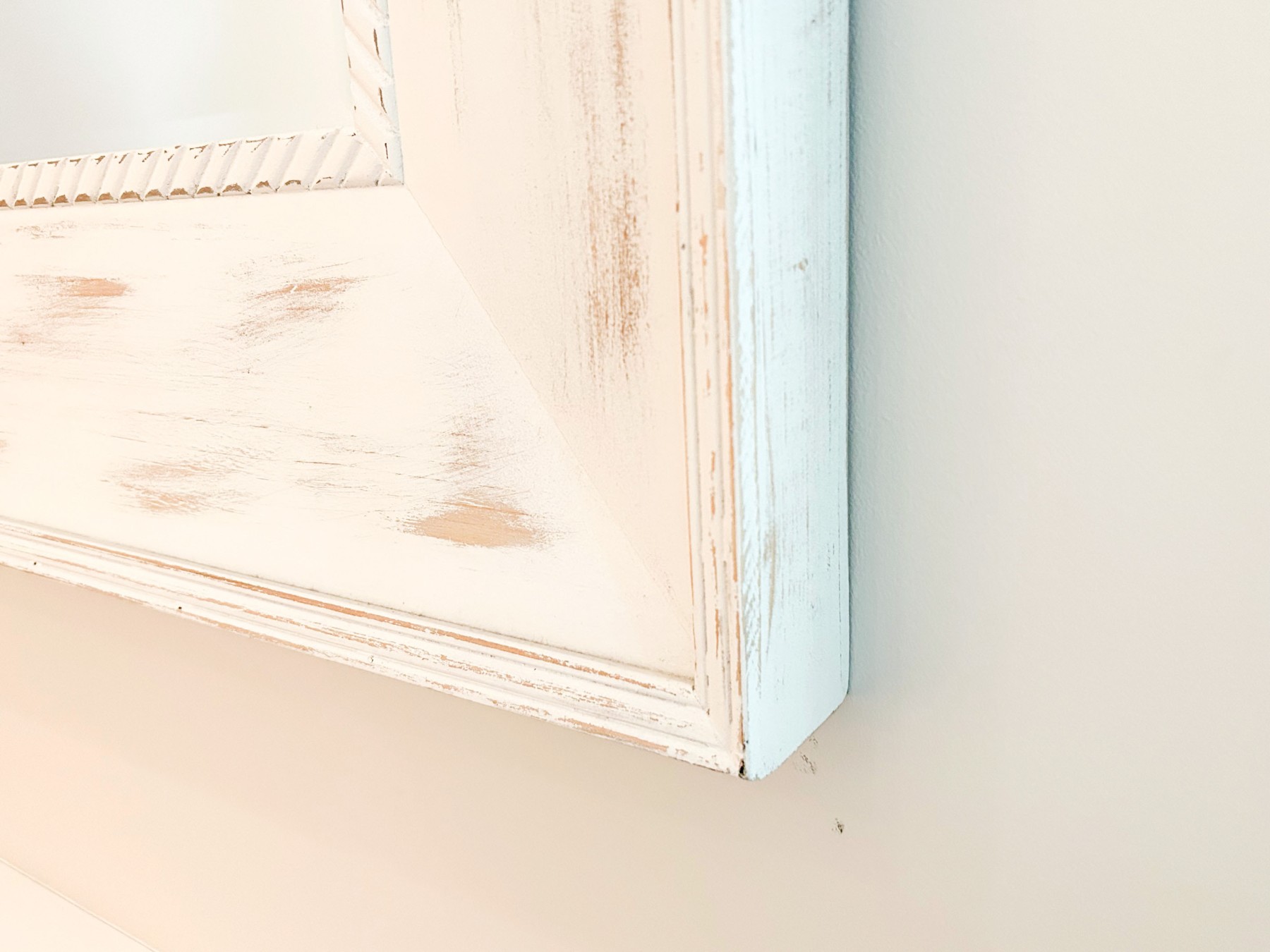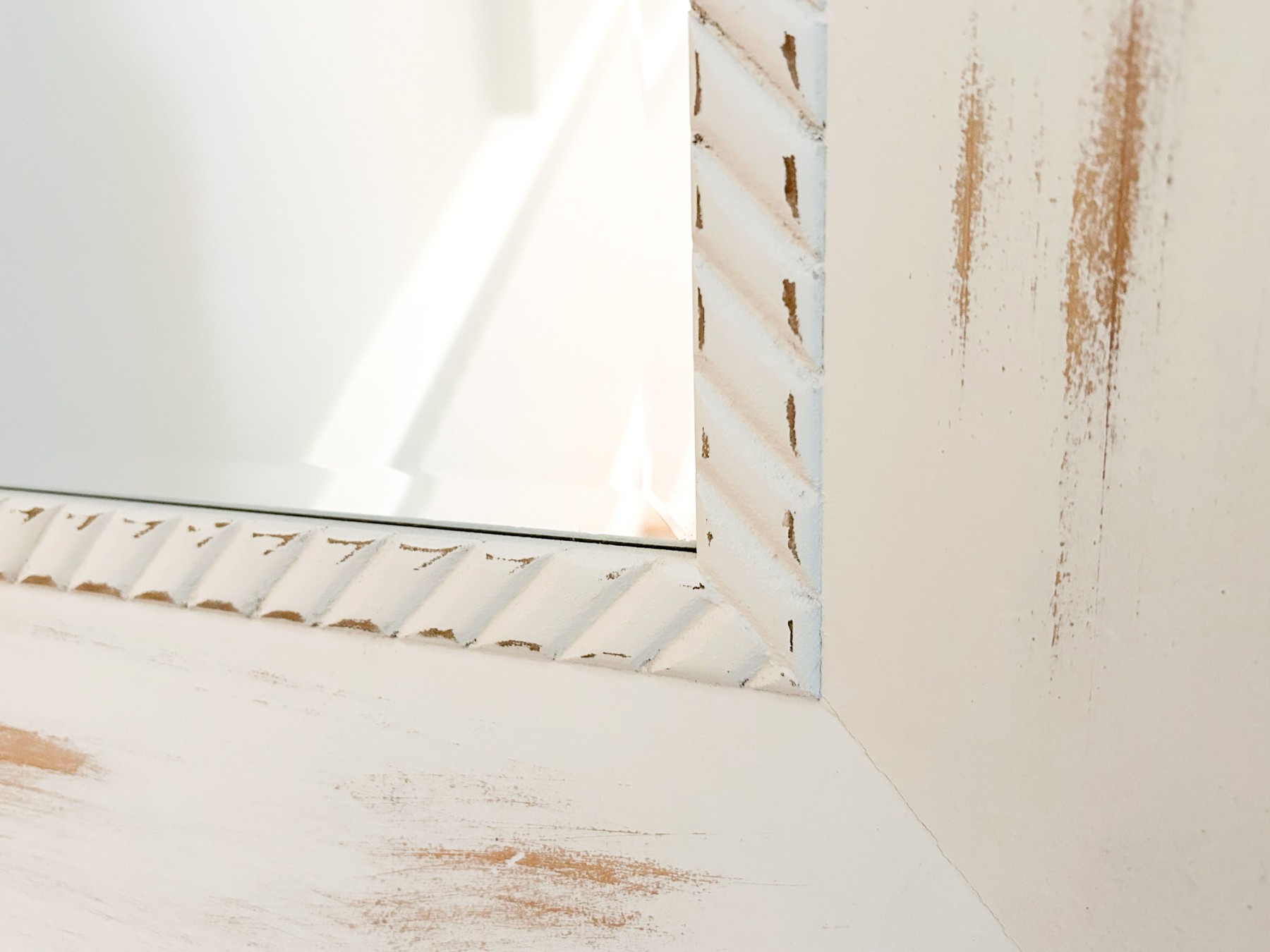 A fabulous rectangular beveled mirror in a cream white painted frame with stylistic antiquing creating a unique, country chic appearance.