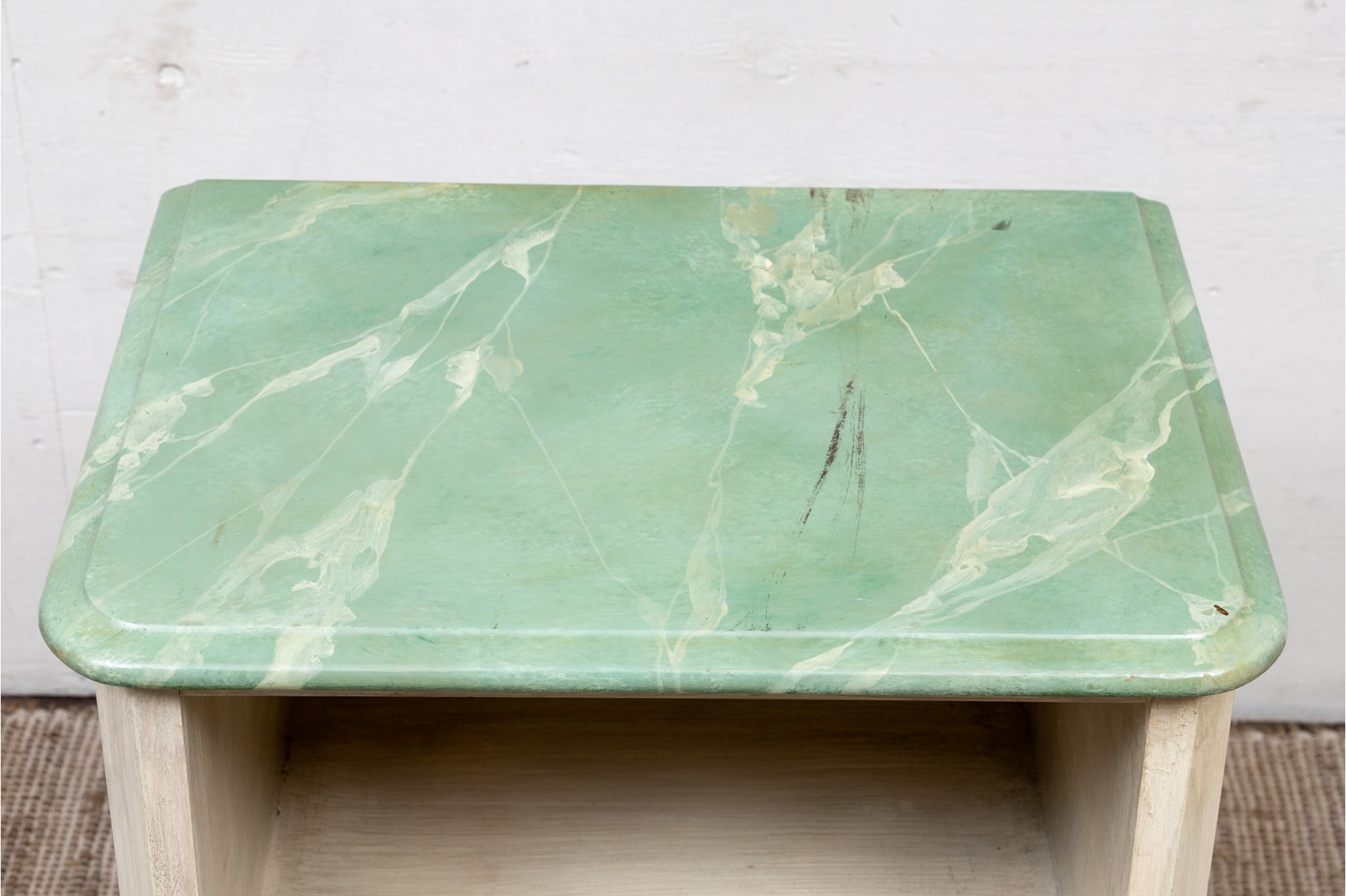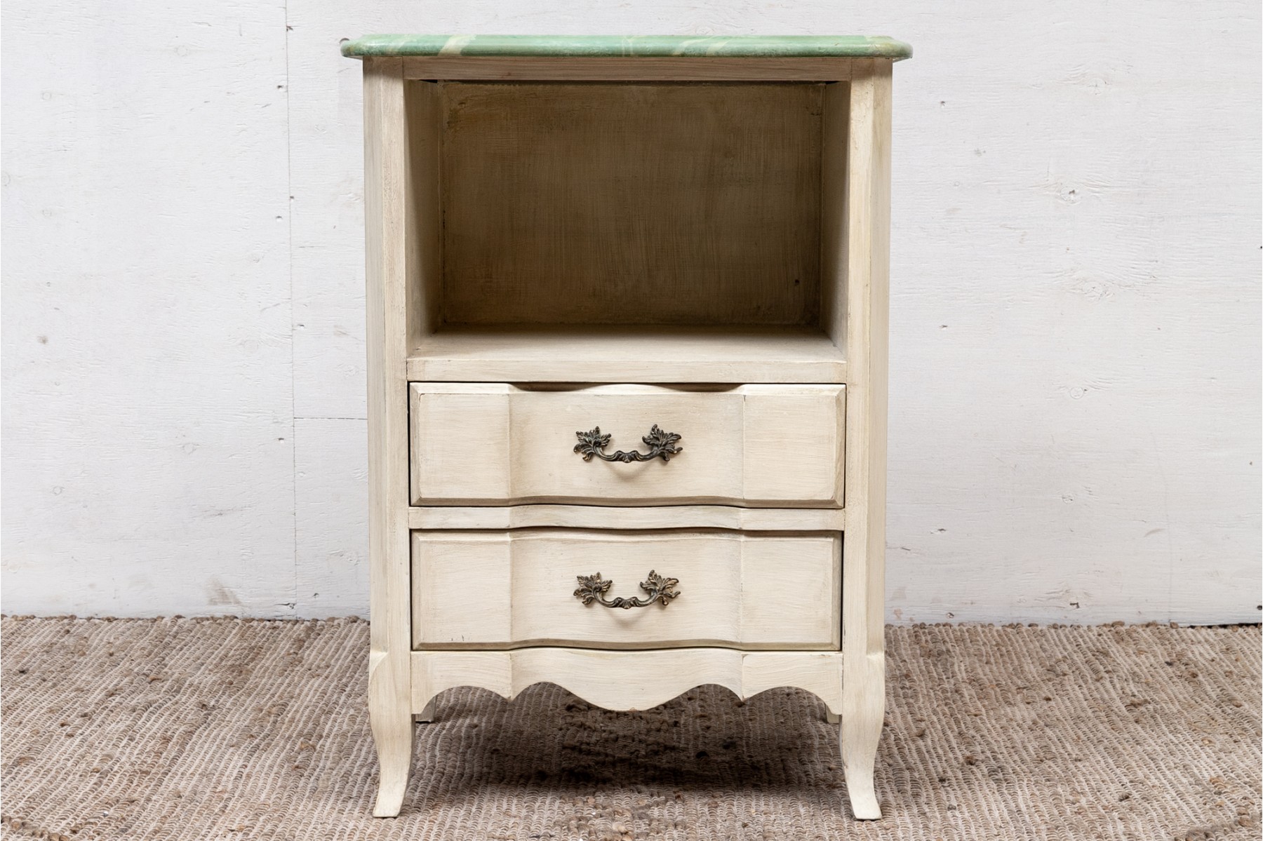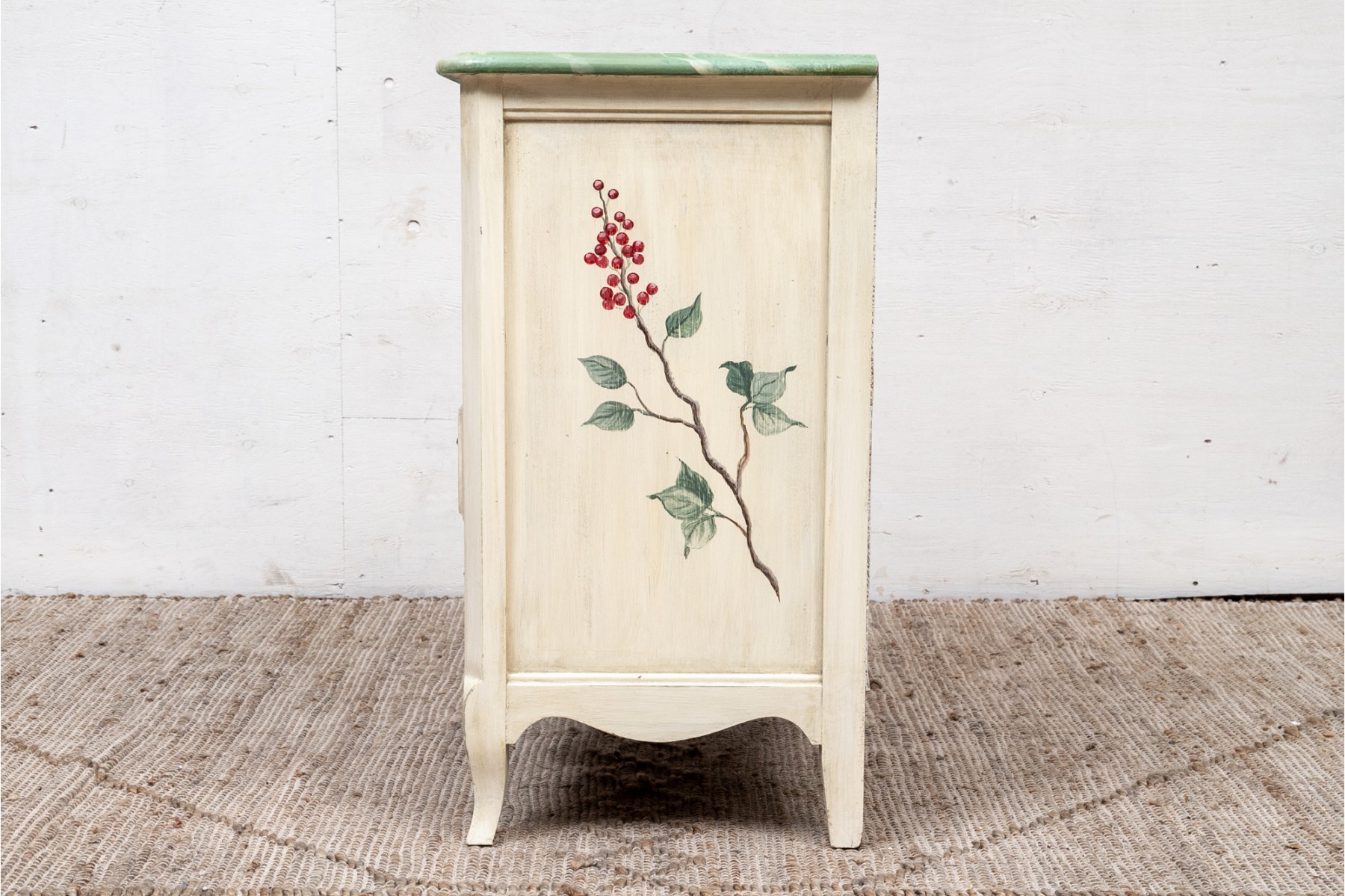 The stand with a green painted faux marble top over an off- white painted case. With an open compartment and two lower shaped frame and drawers with French style metal pulls. The sides with painted red berries on a branch.