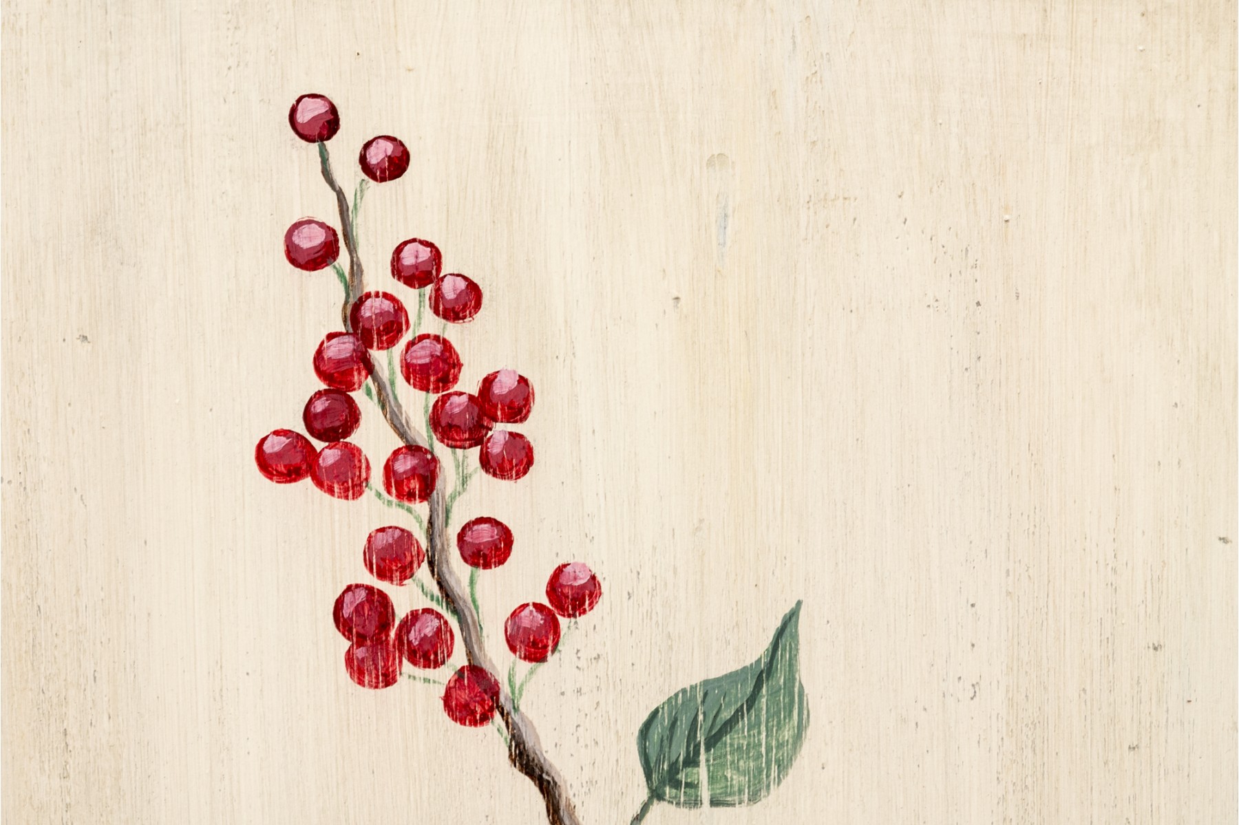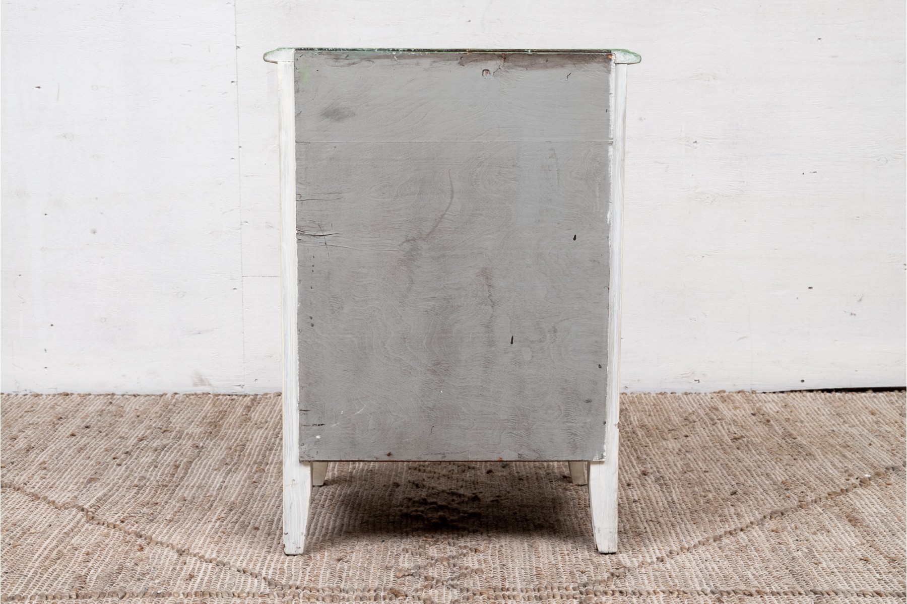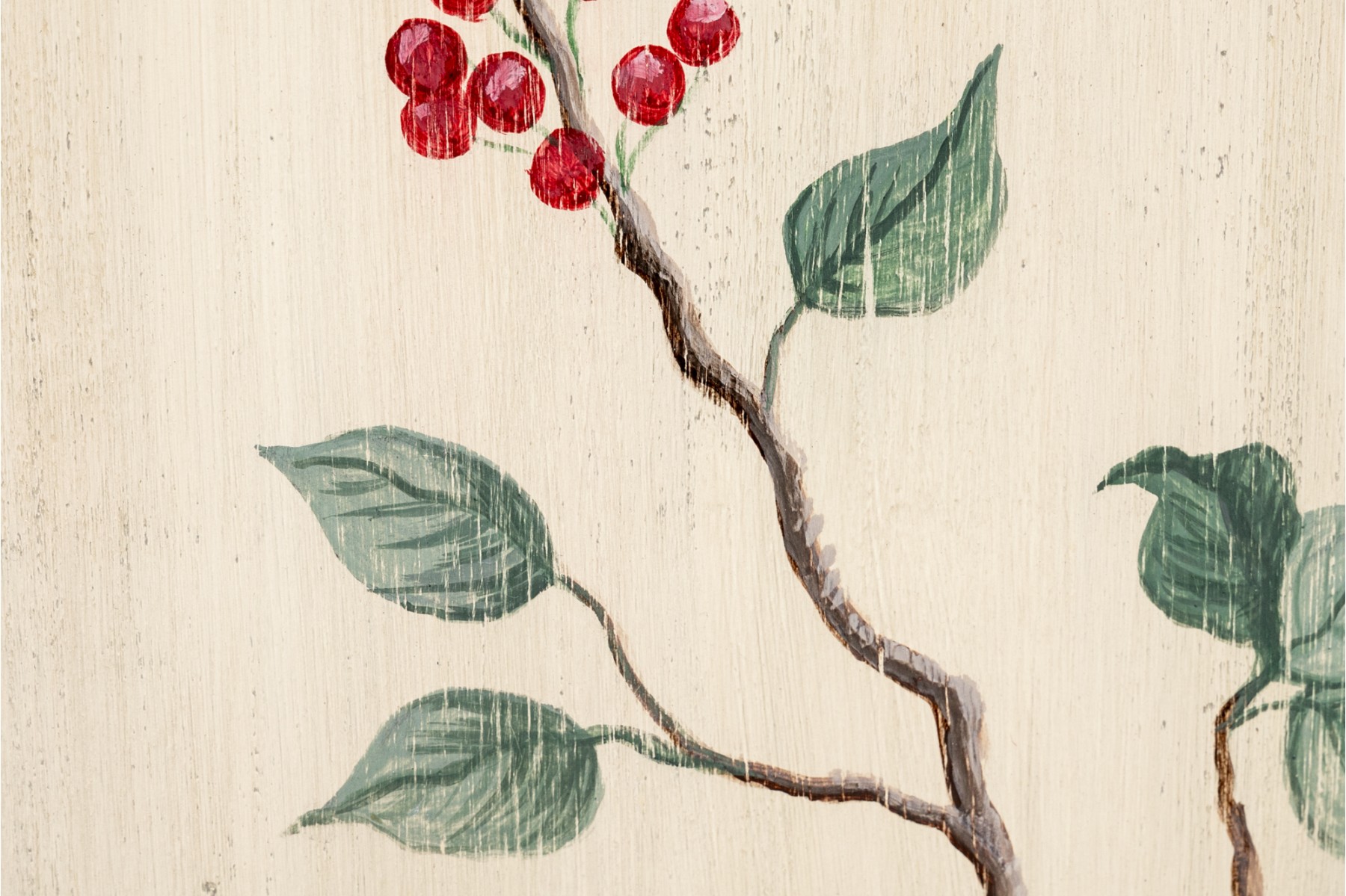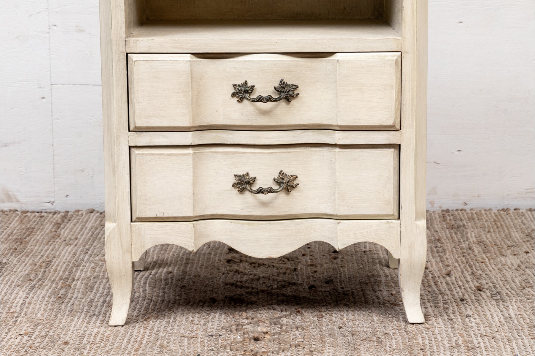 The stand with a green painted faux marble top over an off- white painted case. With an open compartment and two lower shaped frame and drawers with French style metal pulls. The sides with painted red berries on a branch.