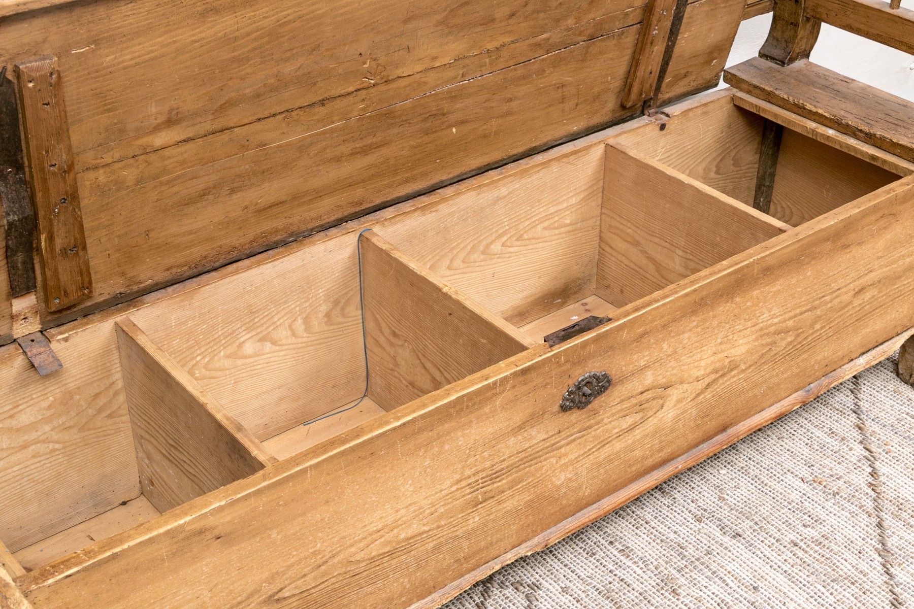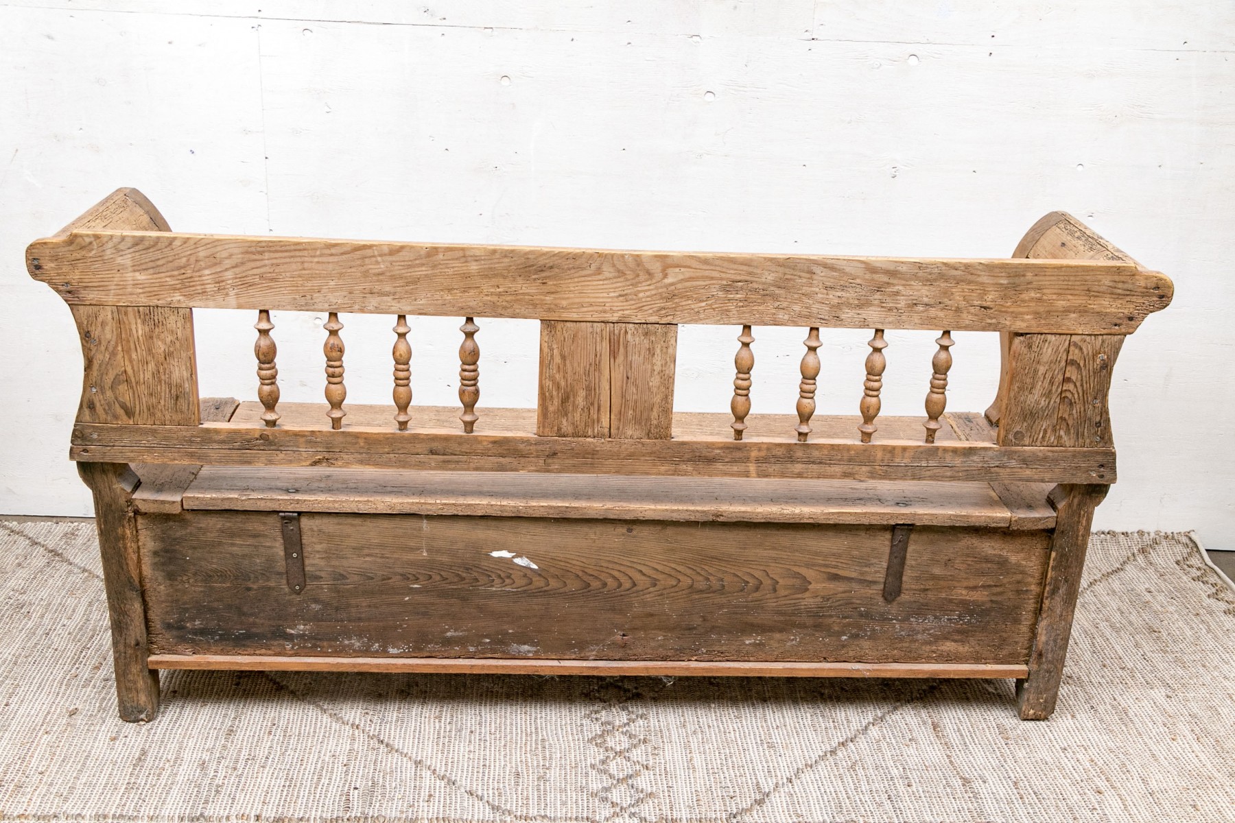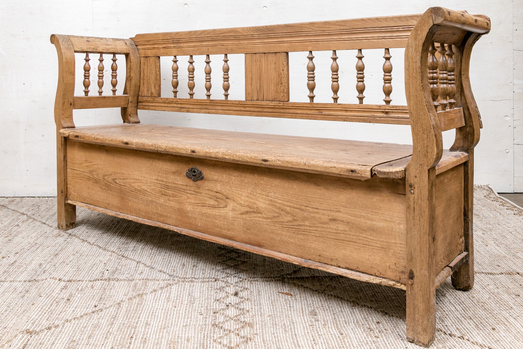 The bench with spindle back and curved sides, the seat lifts as the lid for the trunk below with compartments. Raised on square legs.