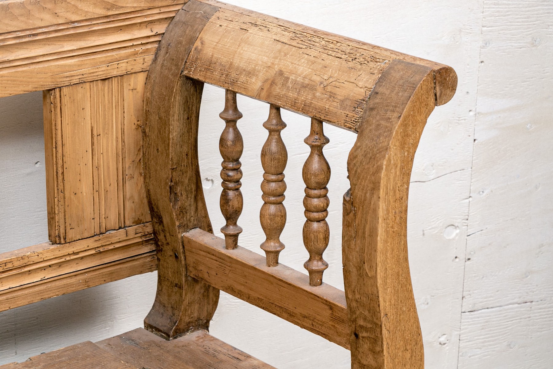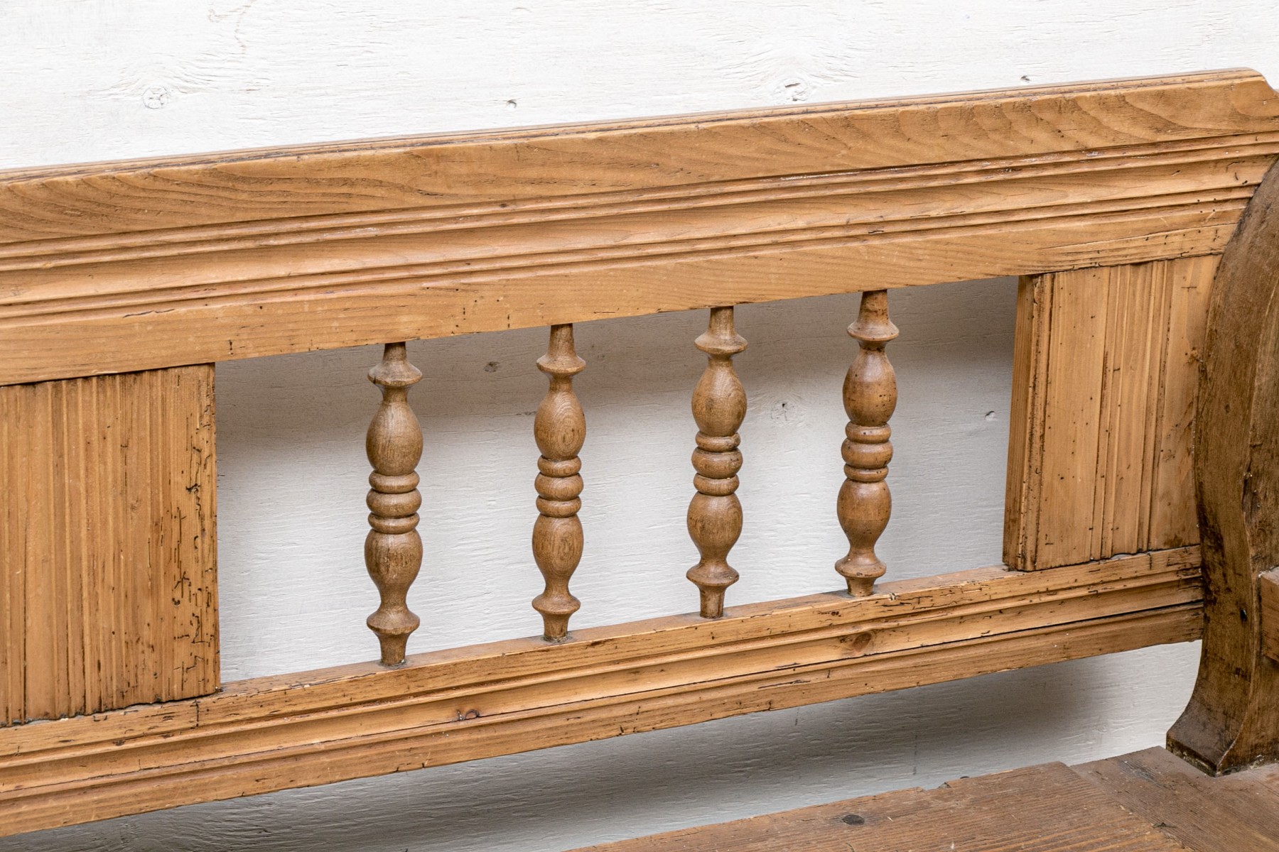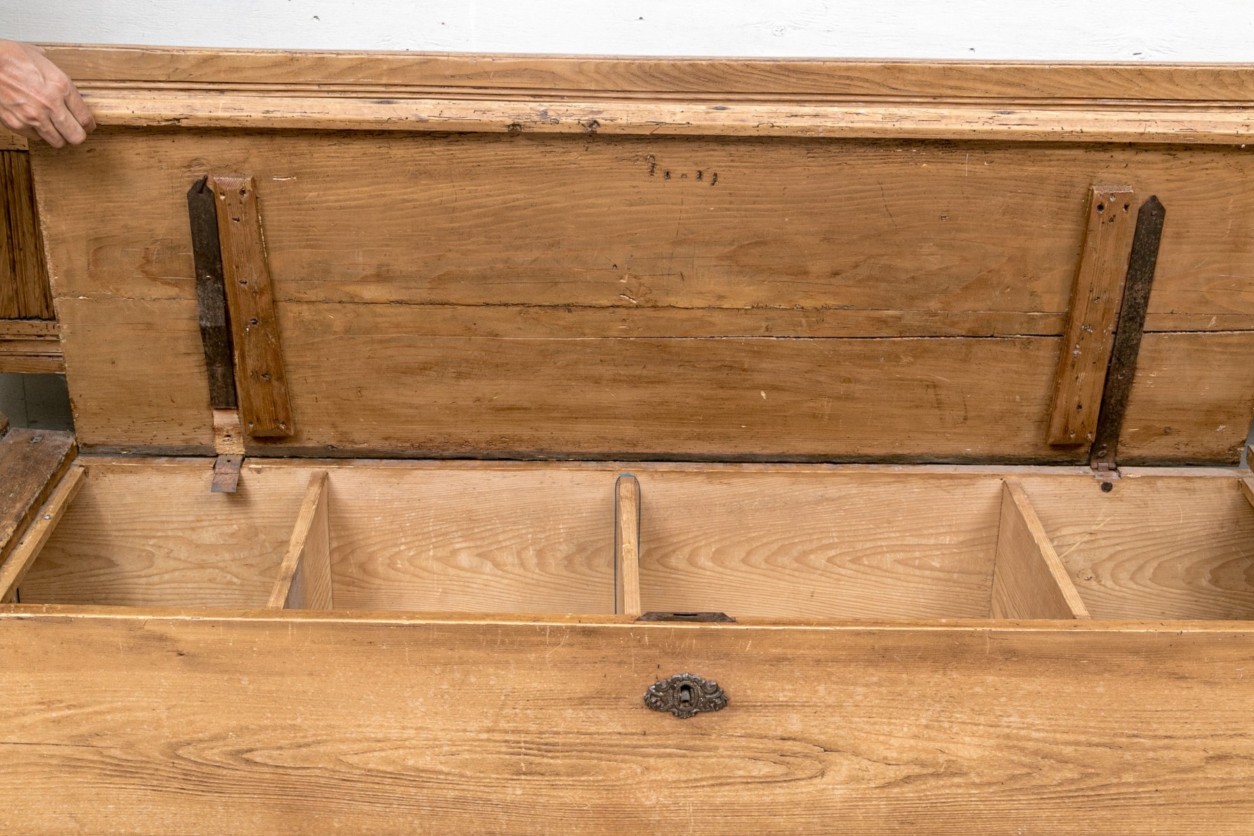The bench with spindle back and curved sides, the seat lifts as the lid for the trunk below with compartments. Raised on square legs.