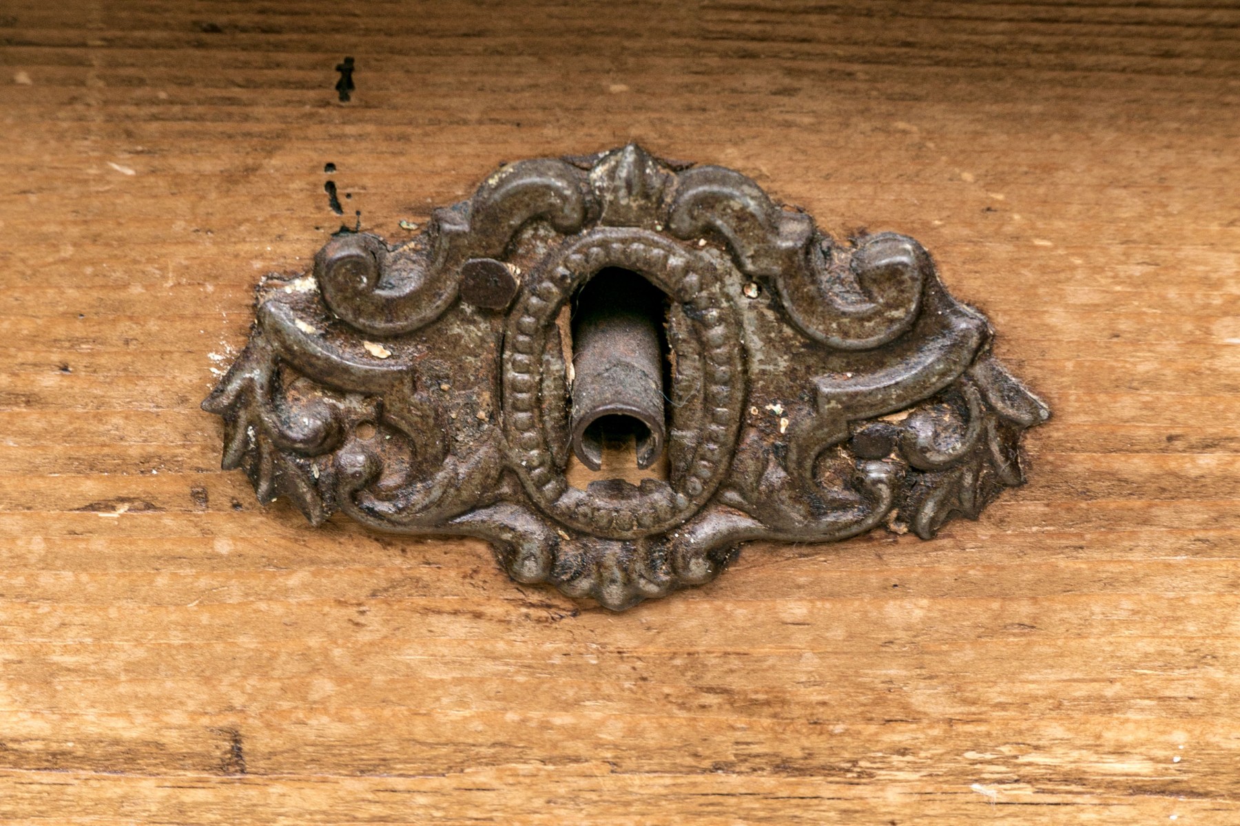 Condition: lacking a key, wear to the legs, spots on the front, some loss to the lower molding, worn seat. Please review the photos as they are part of the condition report.