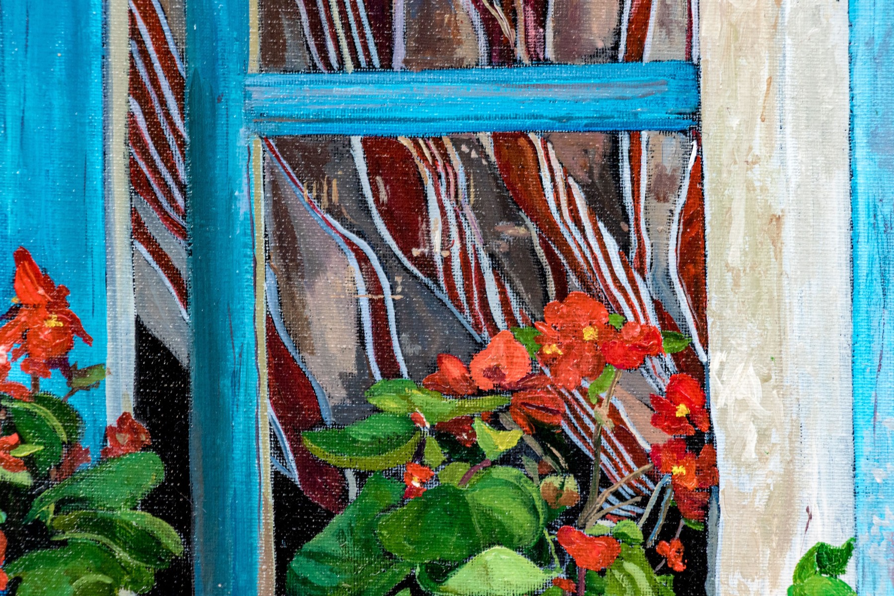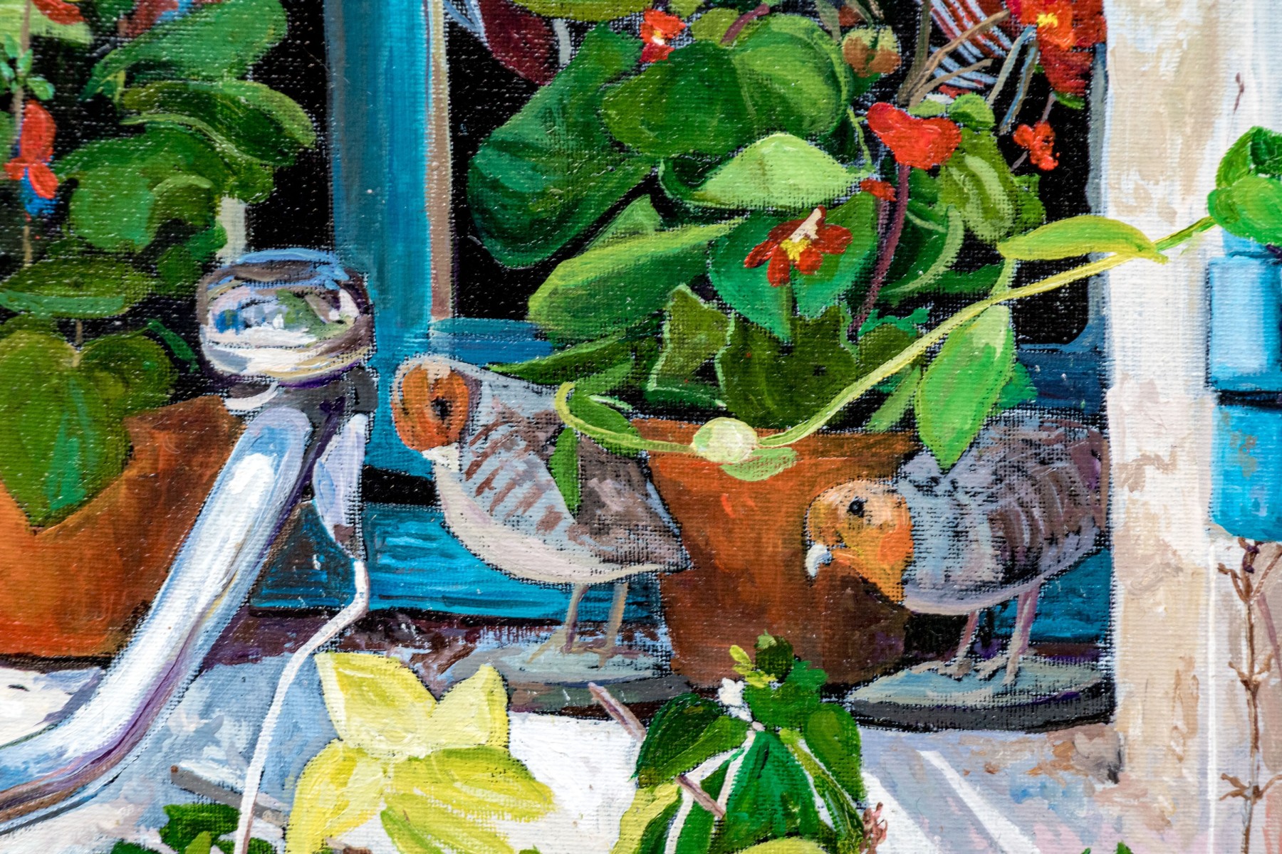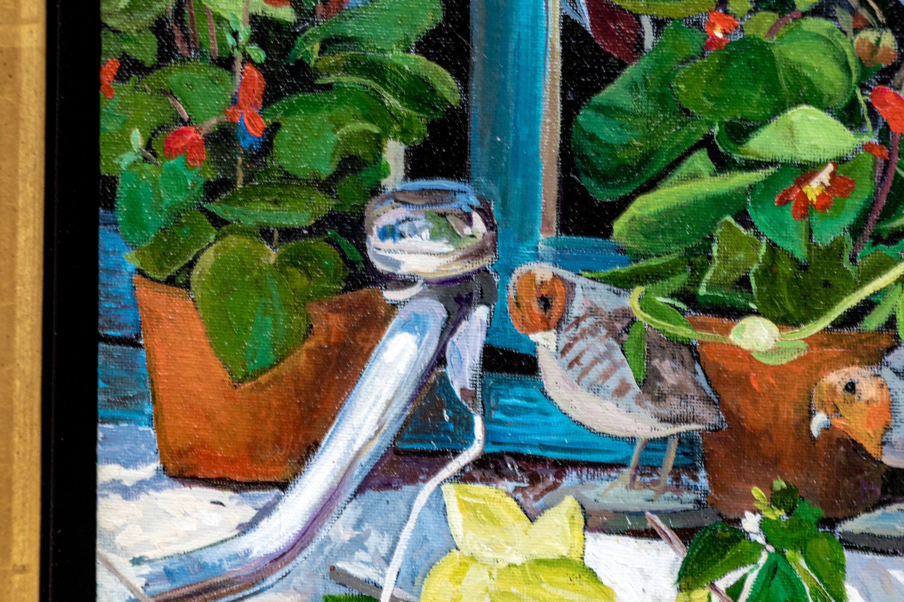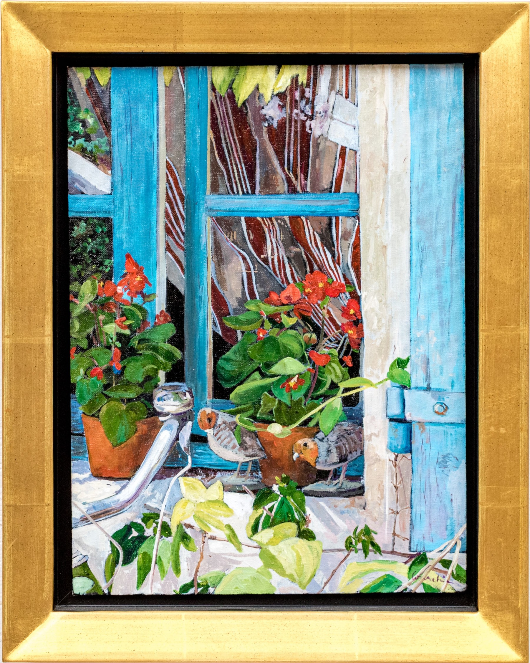 Signed lower right, and additionally signed and titled in marker on verso to canvas board. Depicting a charming image of two birds perched on a window sill with blue painted frame and blue shudders. A pair of terracotta planters with flowers can also be seen. The work has wonderful depth and vibrant colors.
