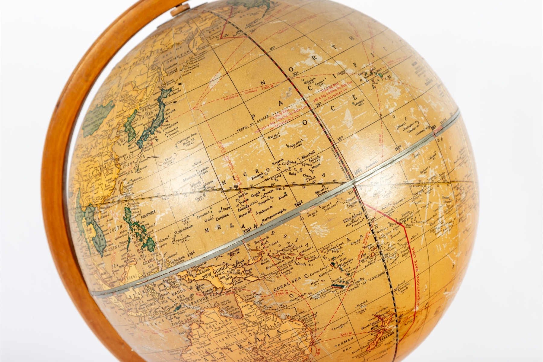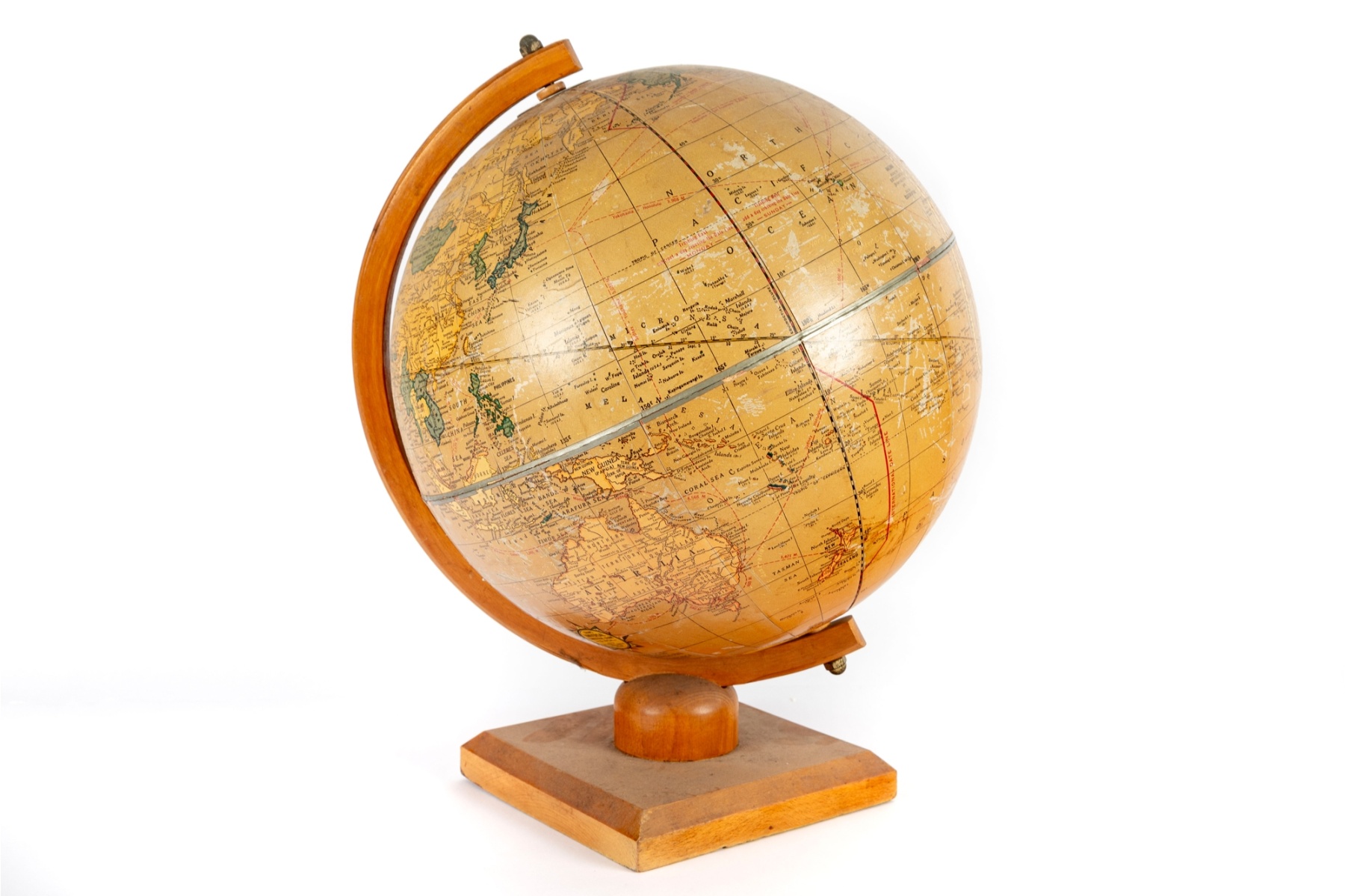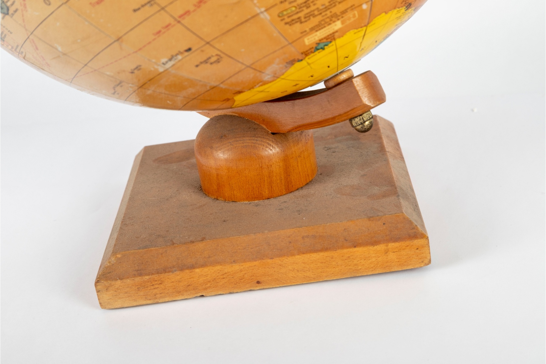 Vintage 12-inch terrestrial globe by the George F. Cram Co. Featues classic cartographic detailing and warm-toned coloration. Mounted on a wooden meridian and base, the globe displays geographic borders, oceans, and trade routes typical of mid-20th-century design.