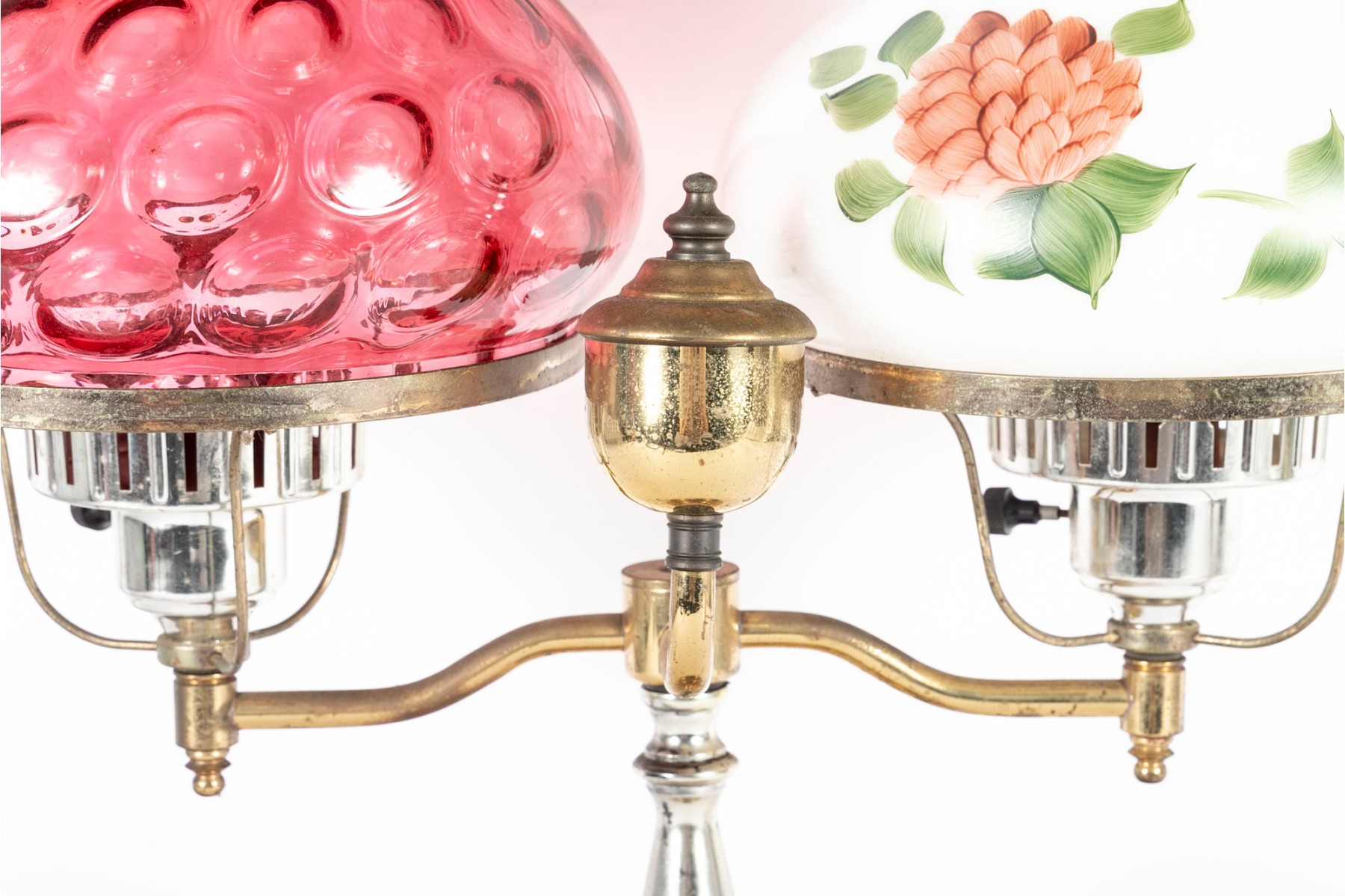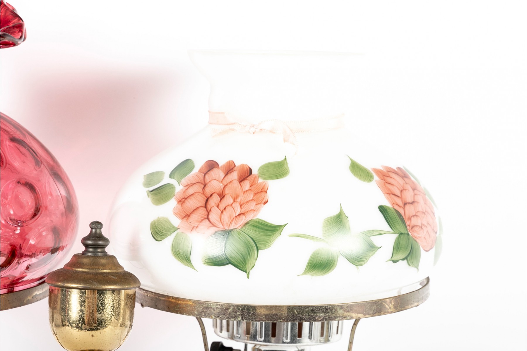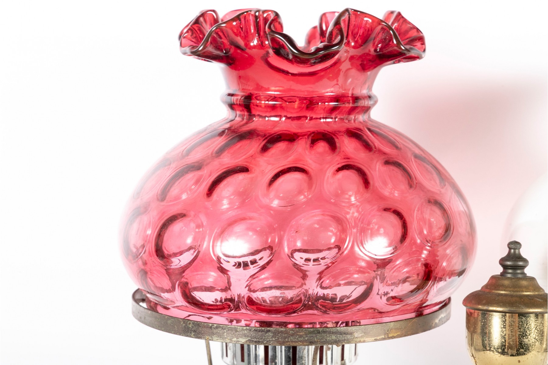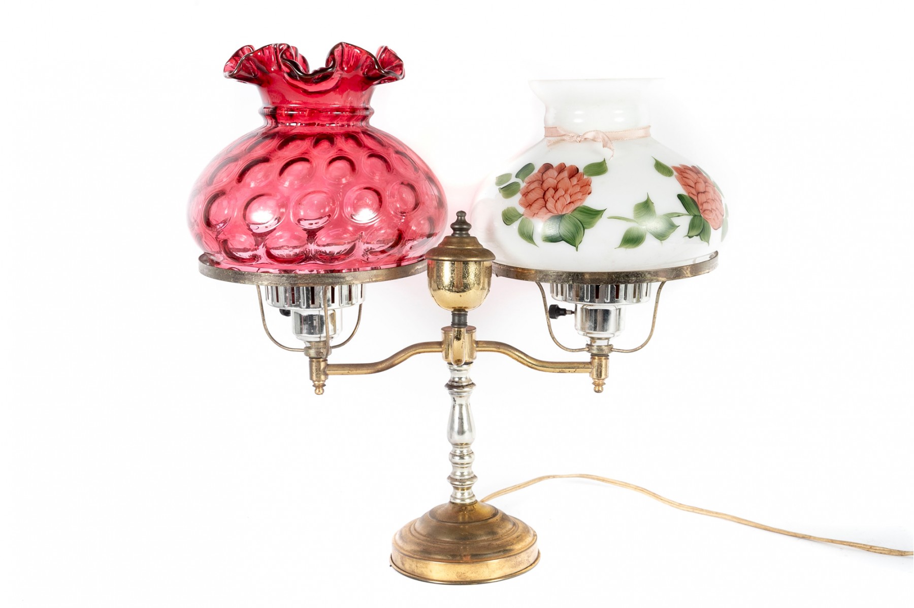 An electrified student lamp displaying a coin cranberry shade with a ruffled top, and a white milk glass shade painted with florals.