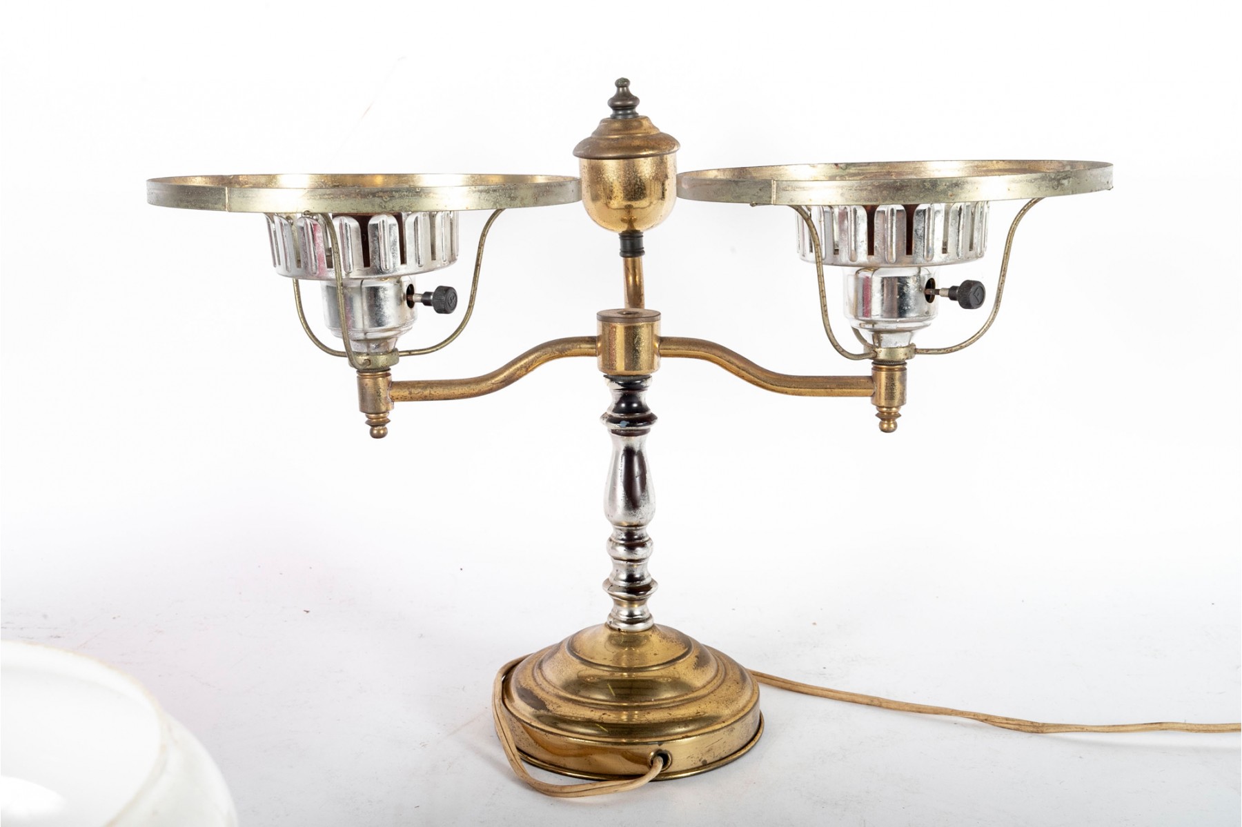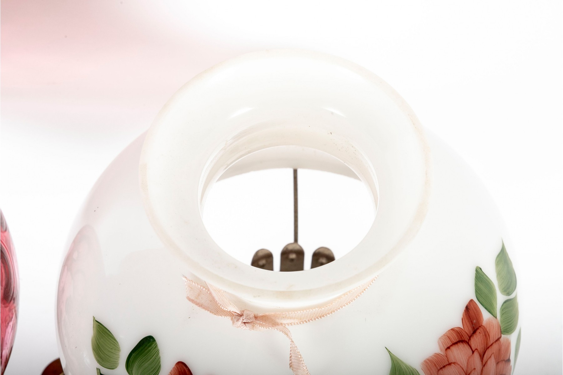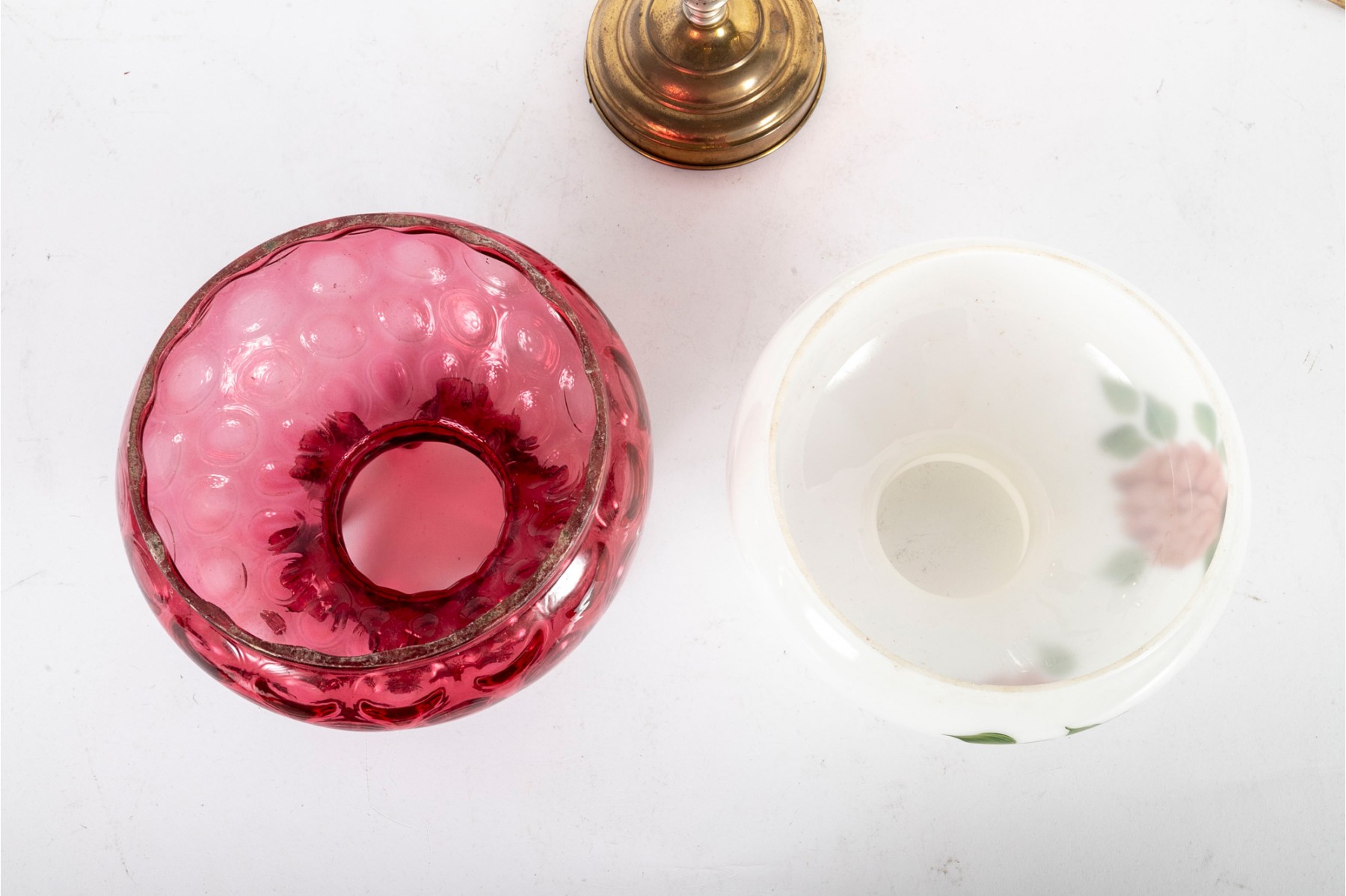 An electrified student lamp displaying a coin cranberry shade with a ruffled top, and a white milk glass shade painted with florals.