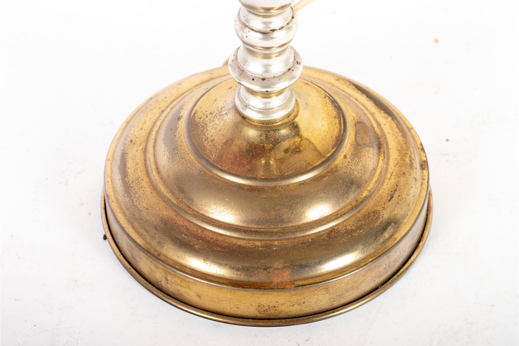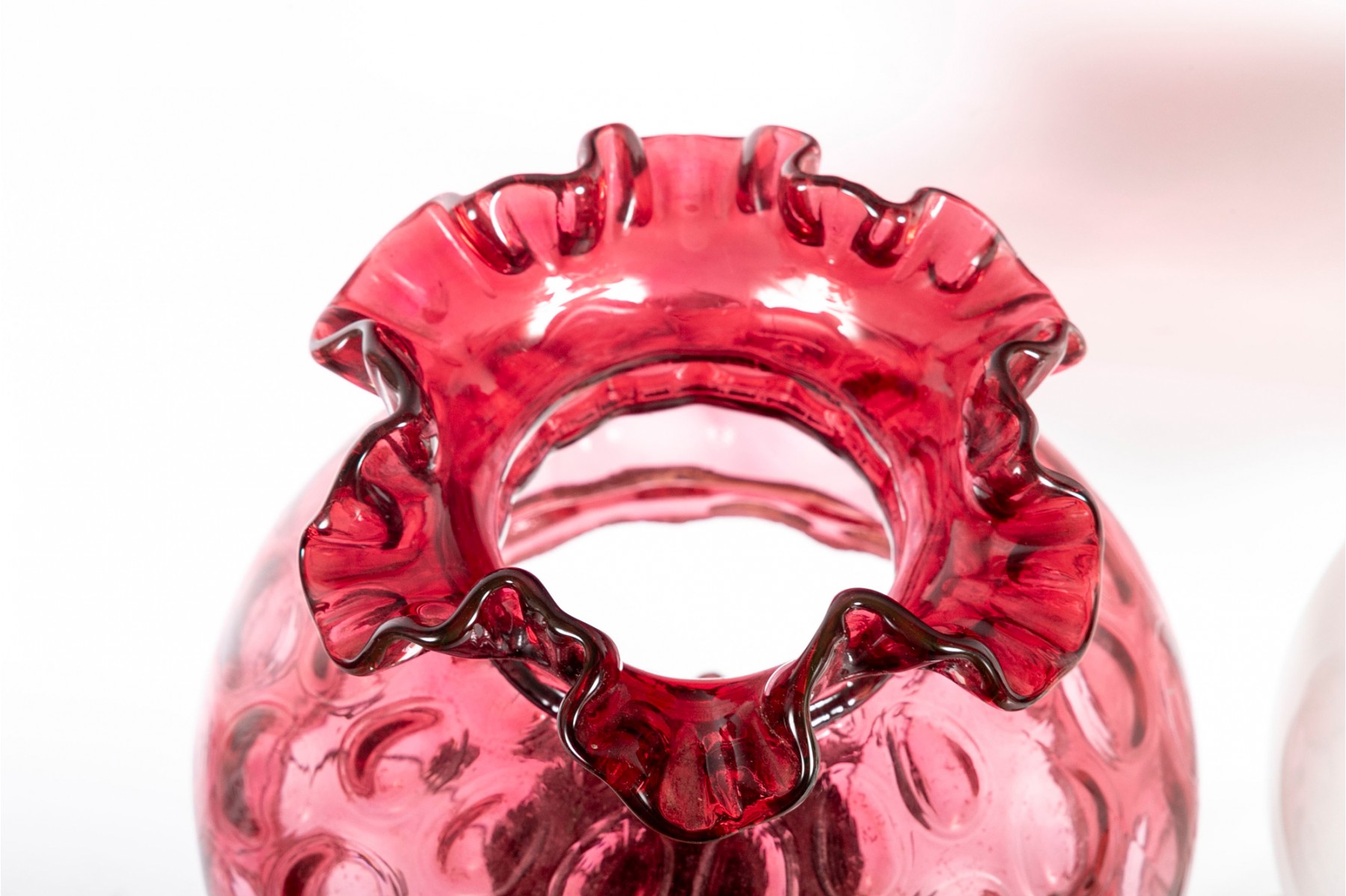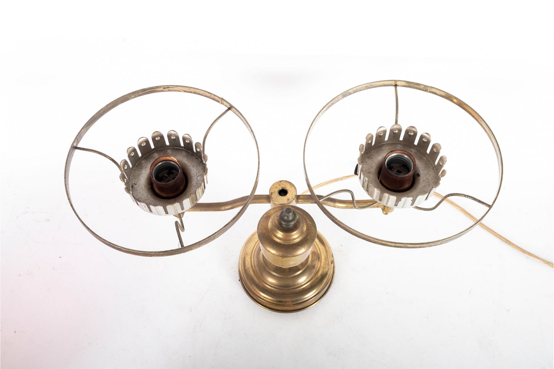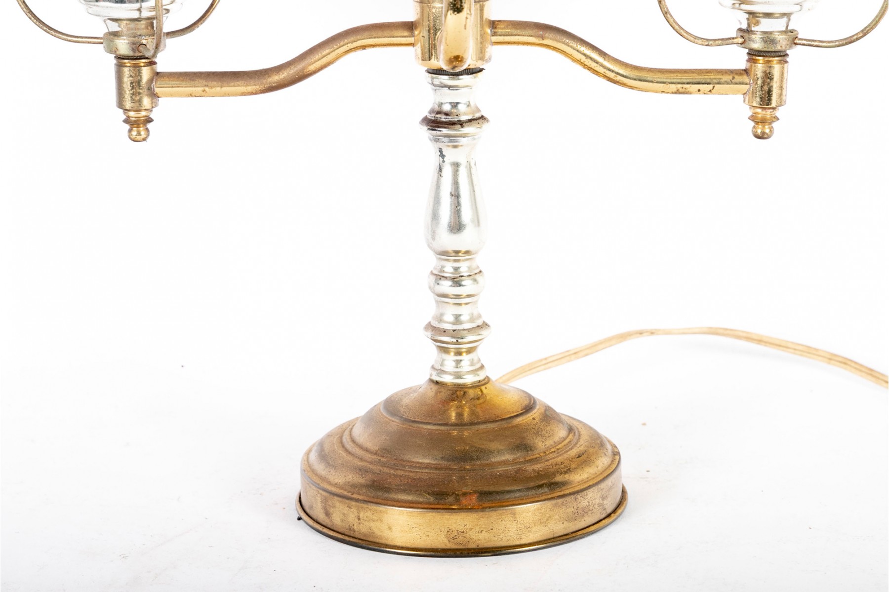An electrified student lamp displaying a coin cranberry shade with a ruffled top, and a white milk glass shade painted with florals.