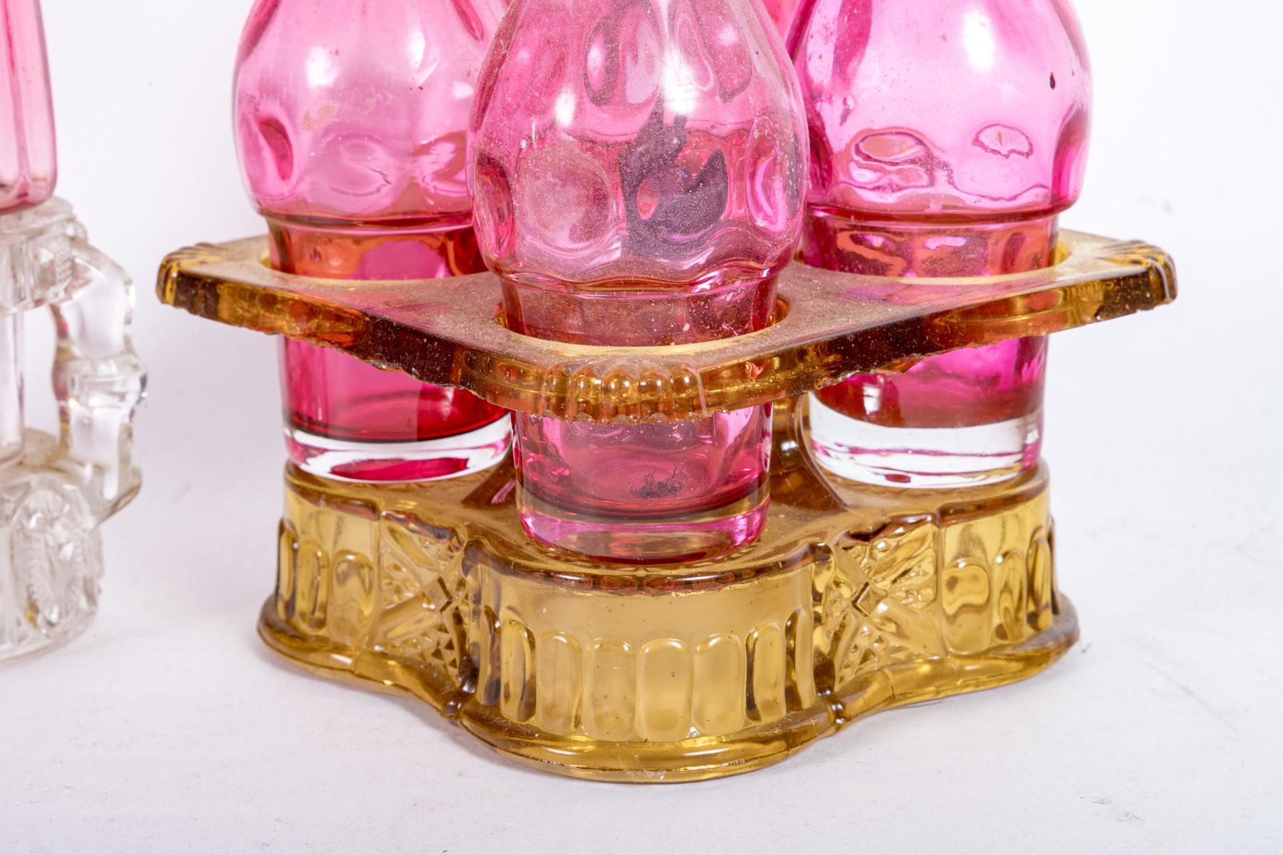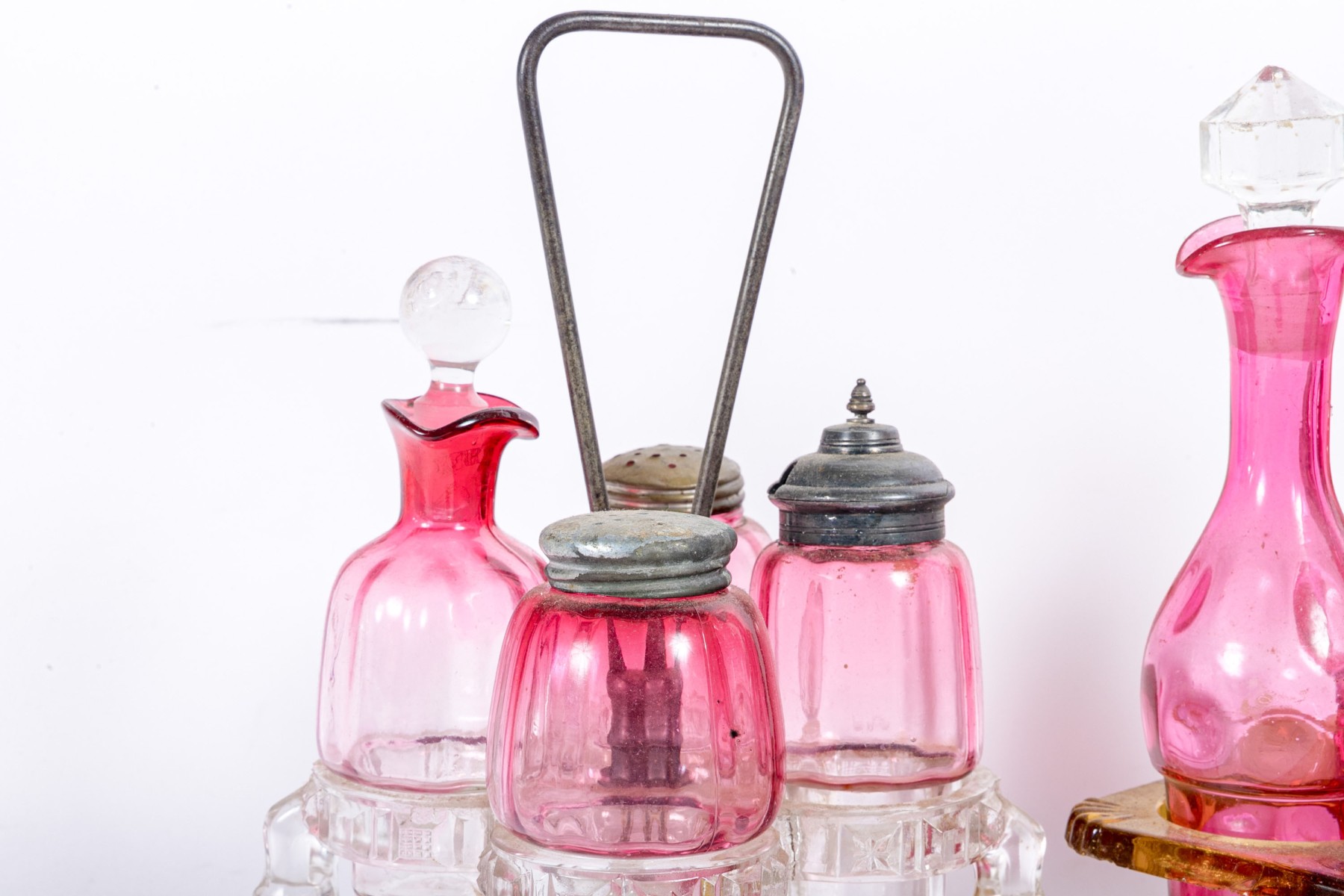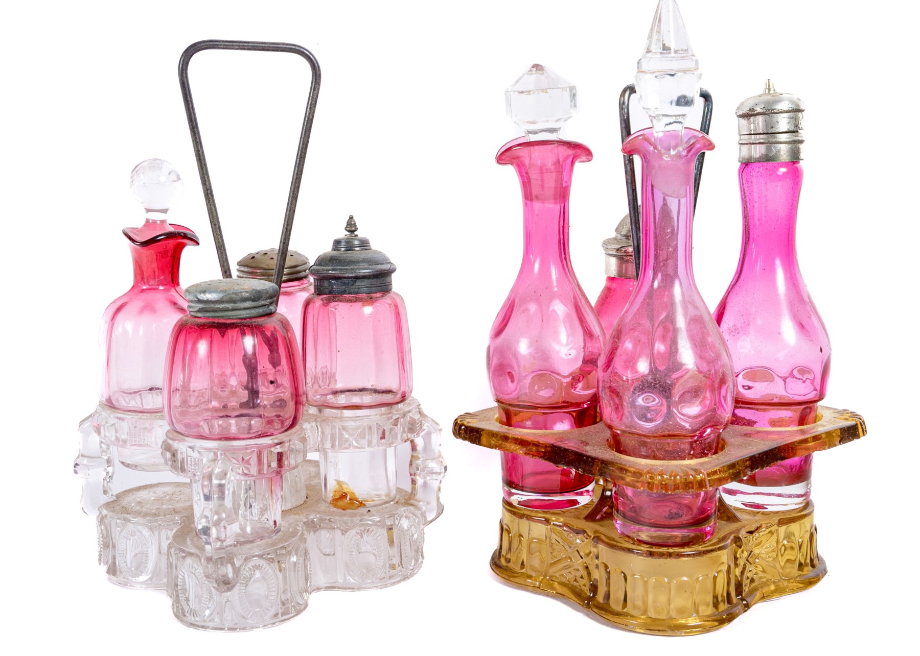 A fabulous duo of cranberry depression glass cruet sets on clear and amber glass stands with metal handles at the centers.