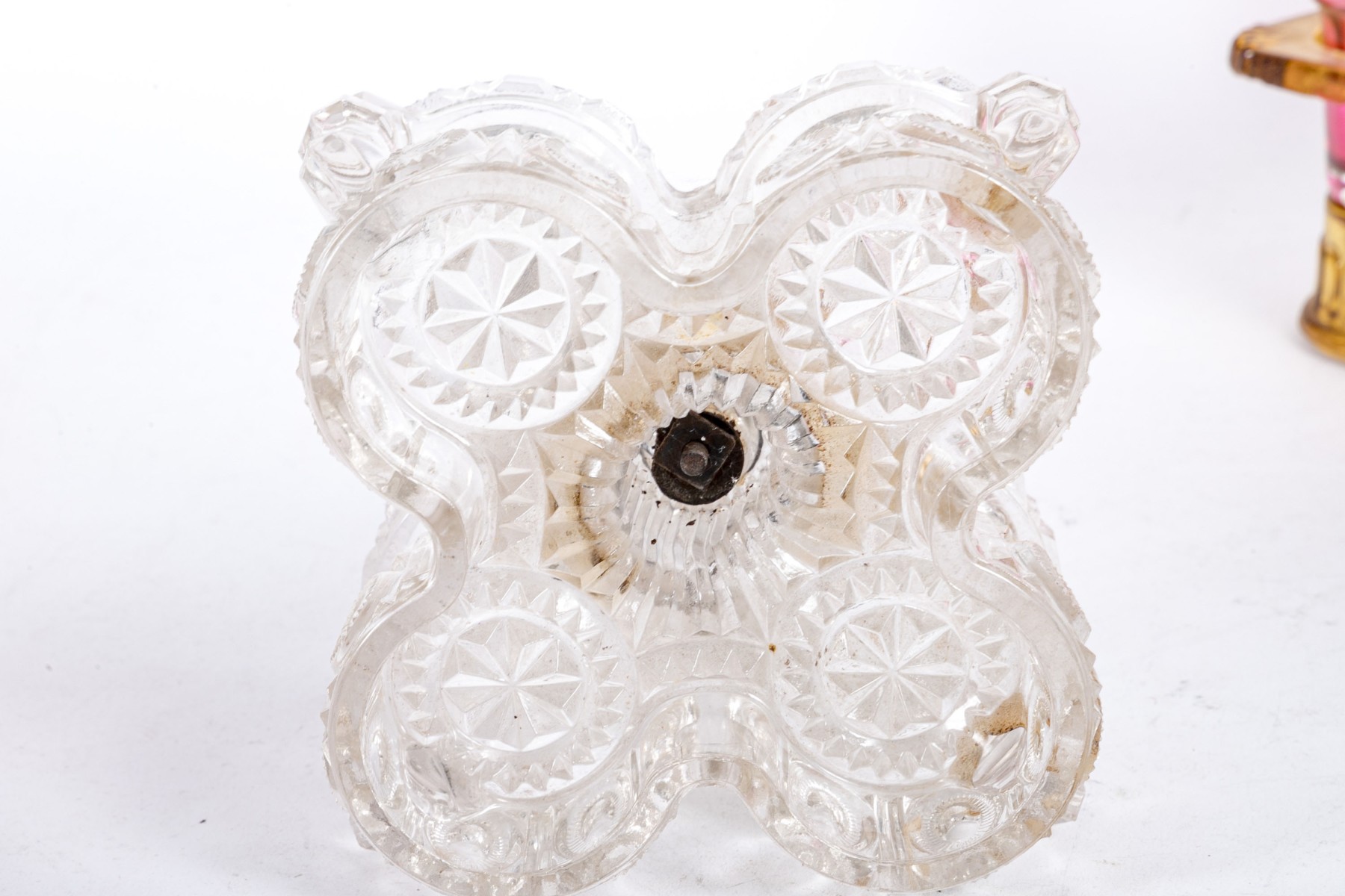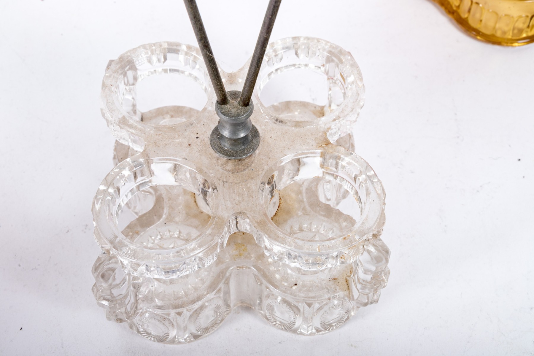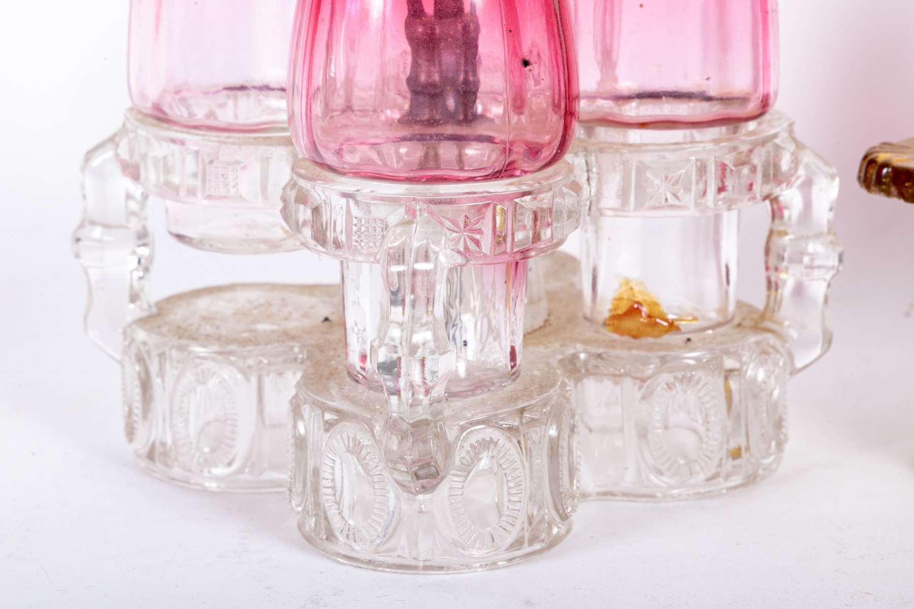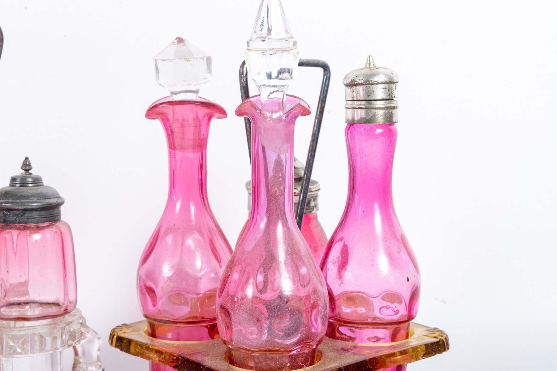 A fabulous duo of cranberry depression glass cruet sets on clear and amber glass stands with metal handles at the centers.