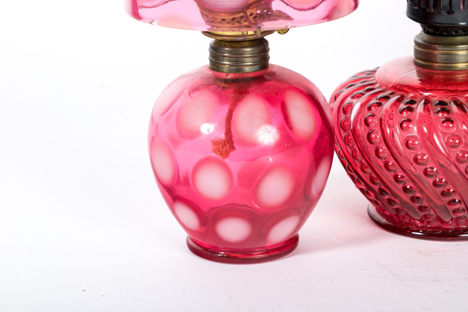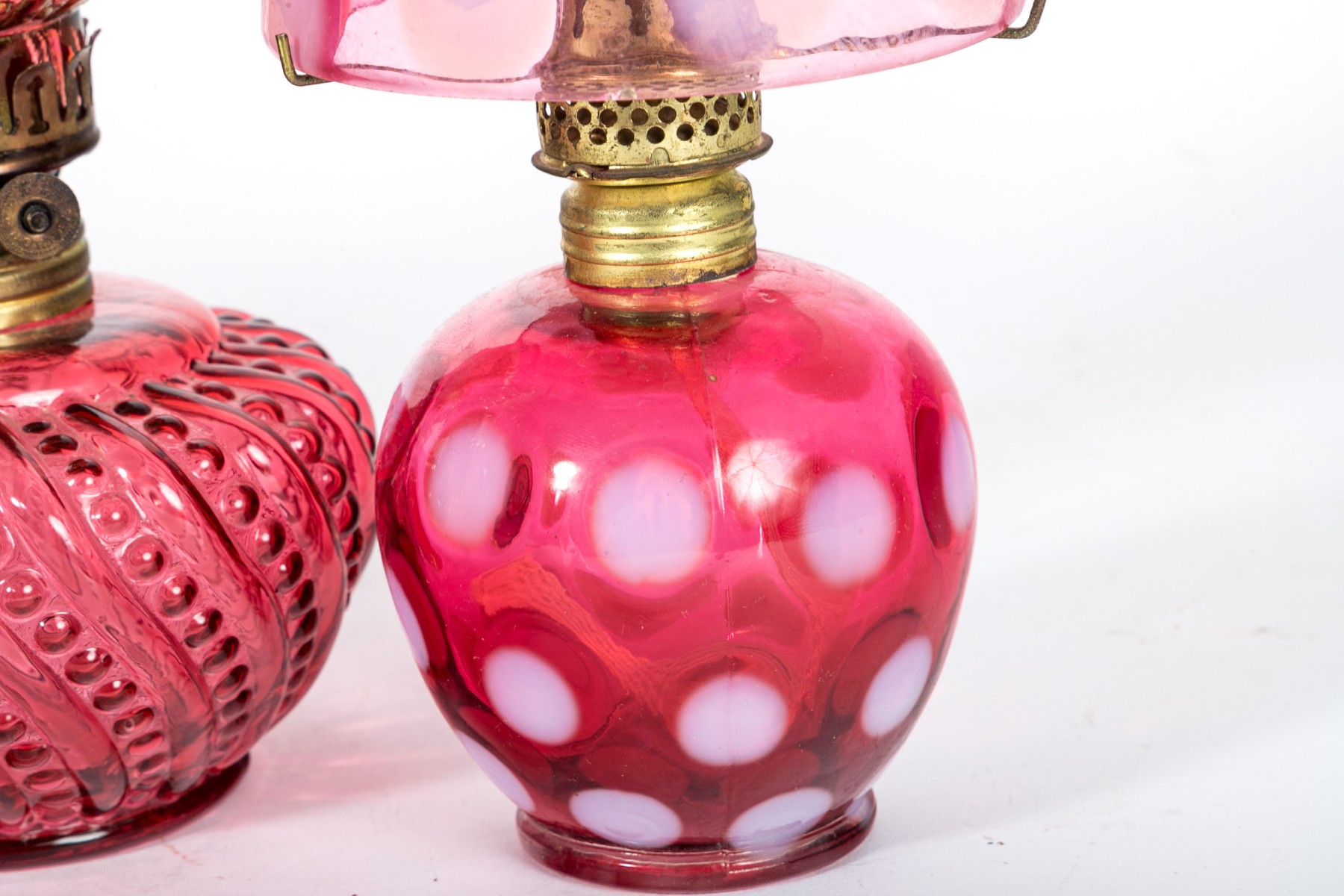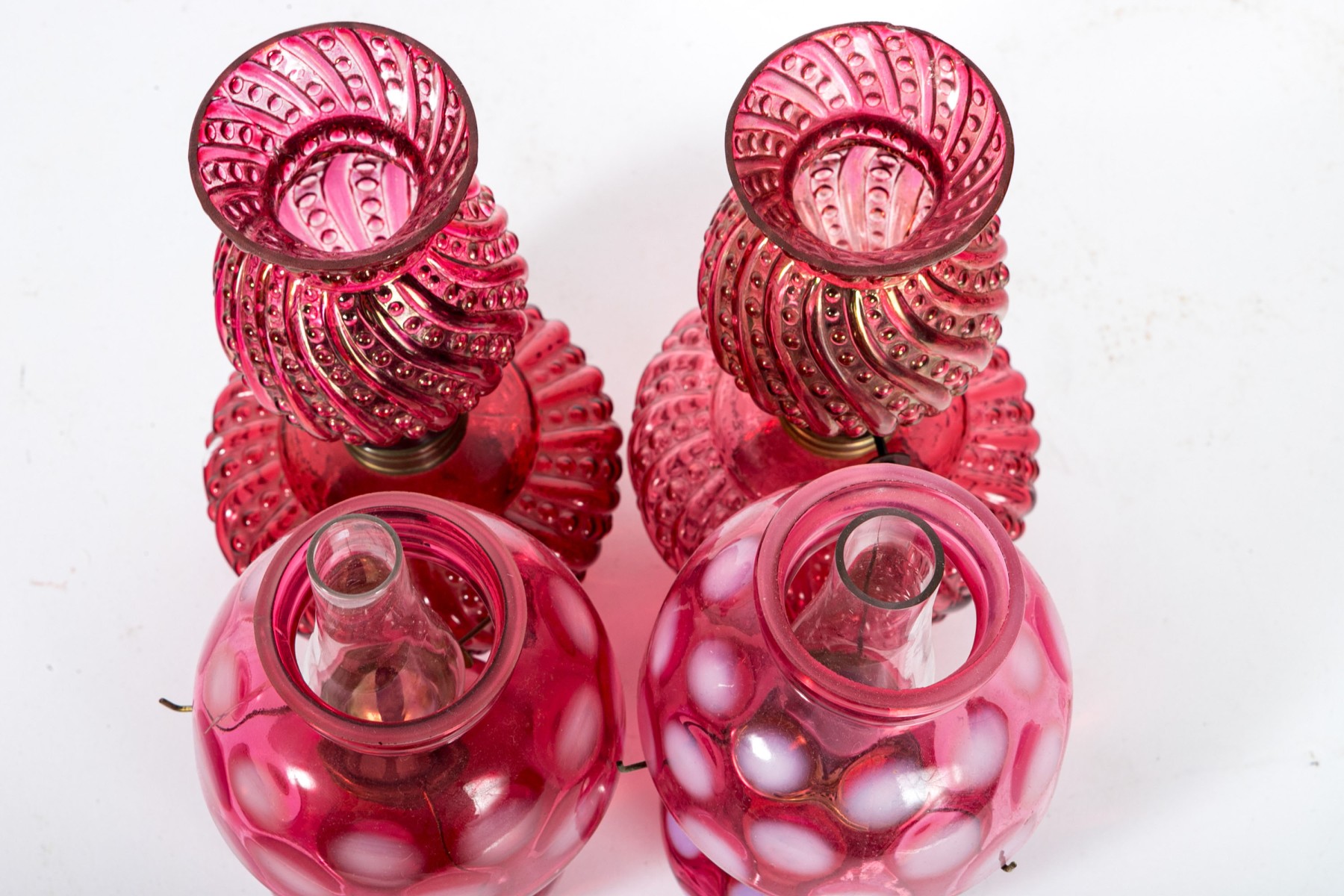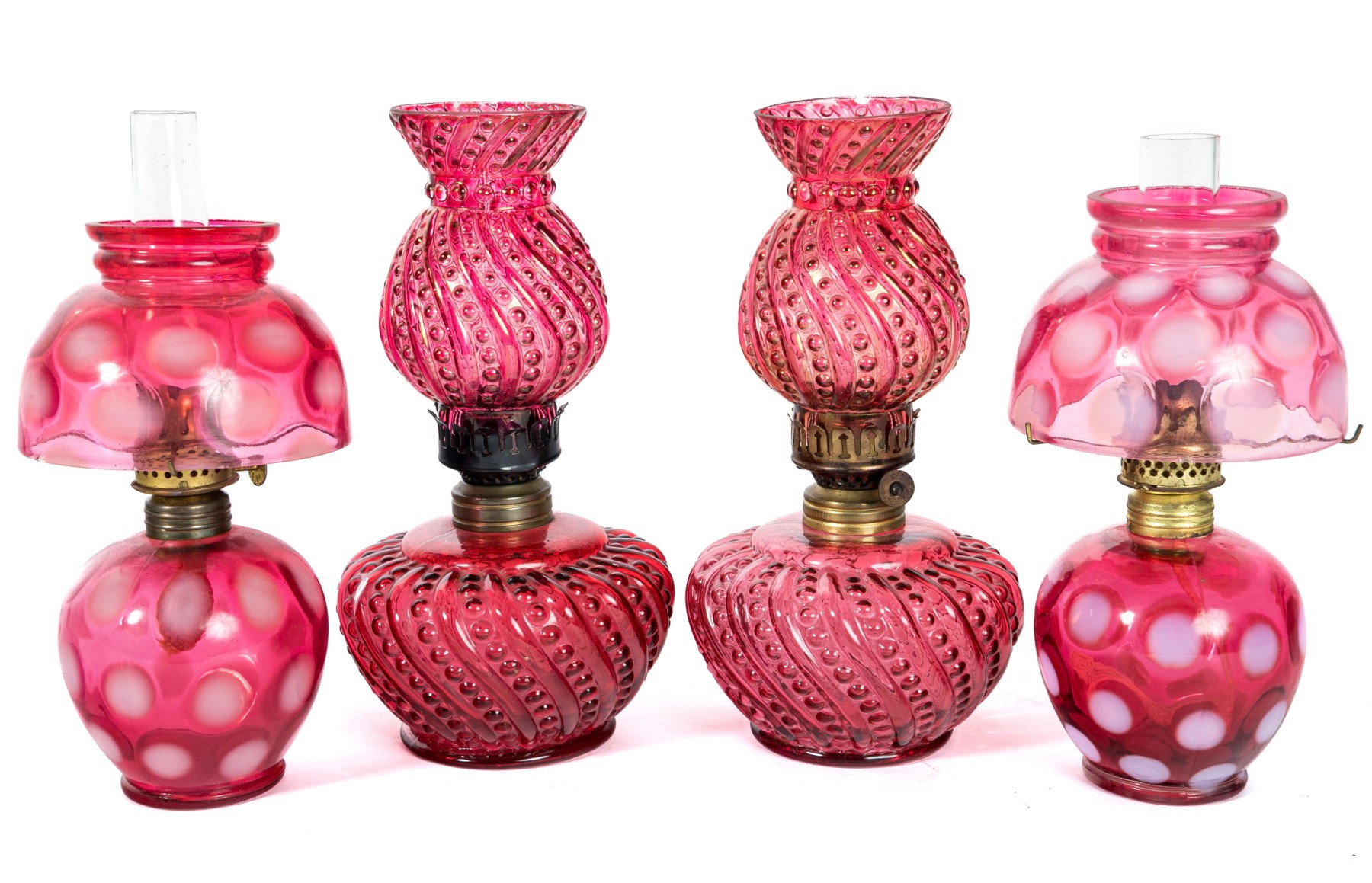 A delightful group of cranberry depression glass oil lamps. The first pair sports white coin spot designs, topped with domed shades and glass chimneys. The second pair displays an opalescent finish over spiraling bands of gadroons and stipples.