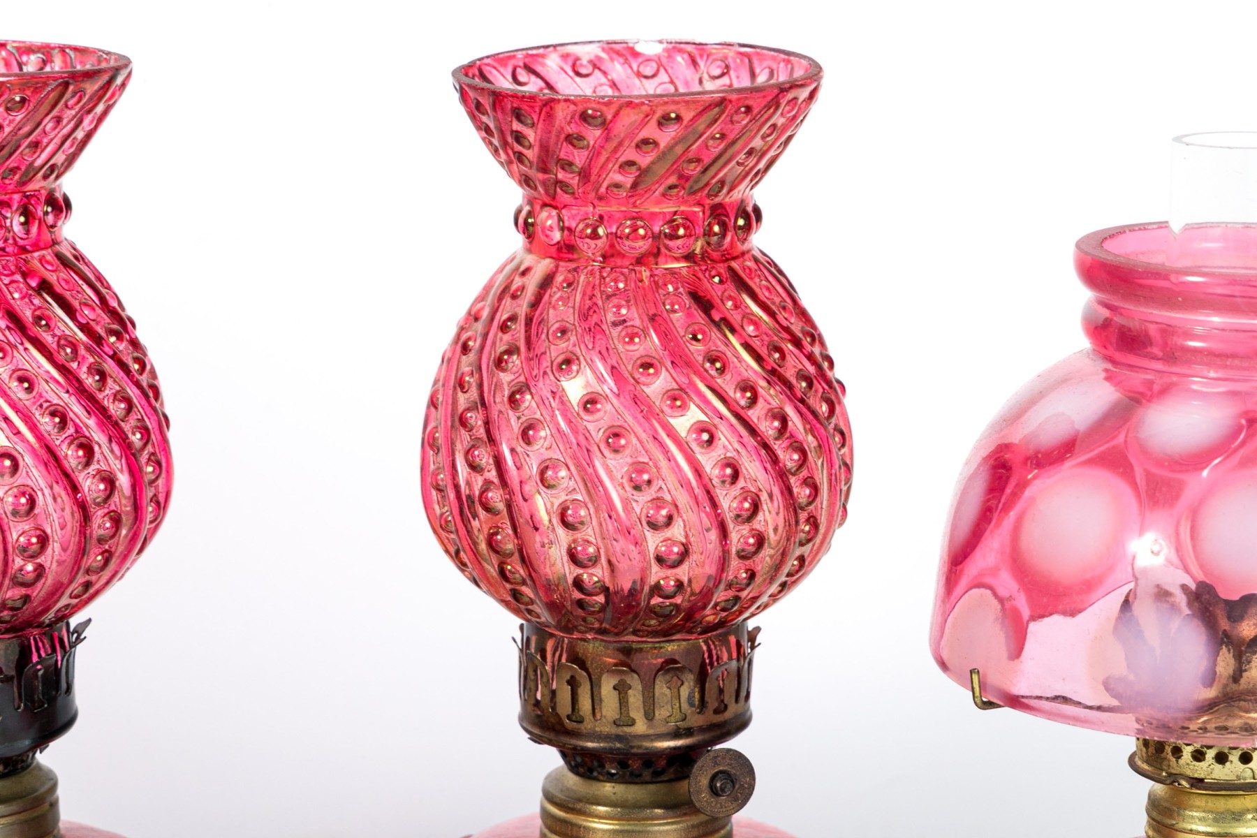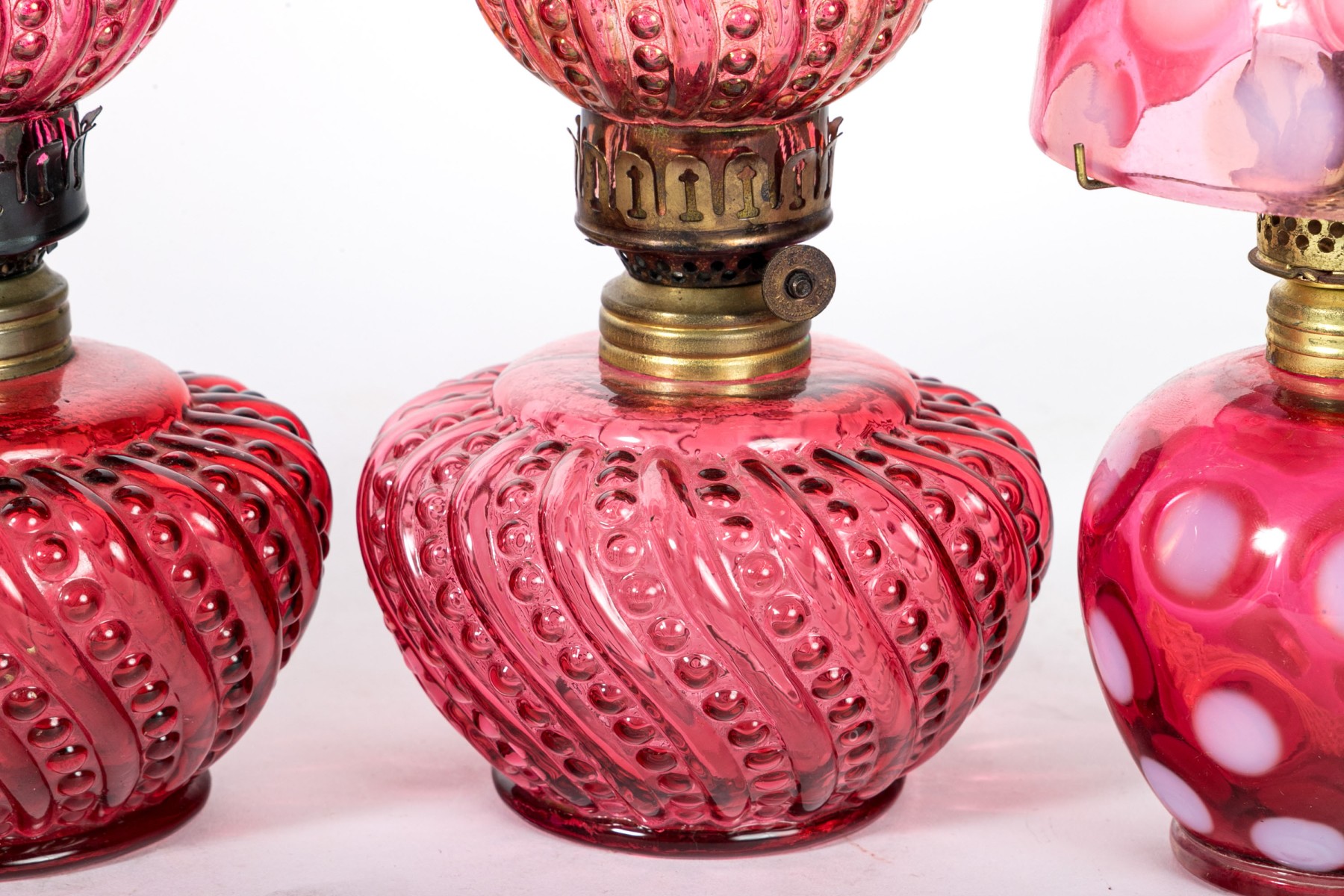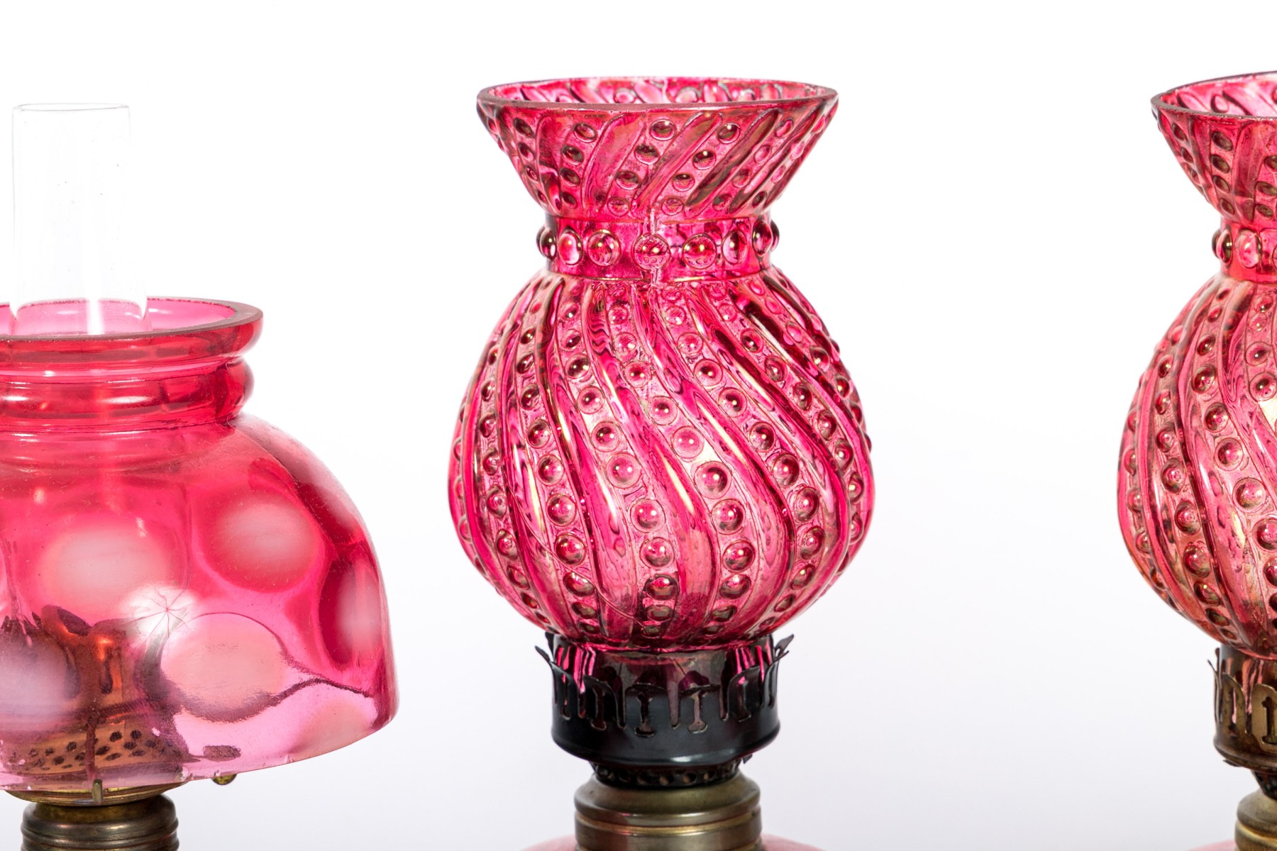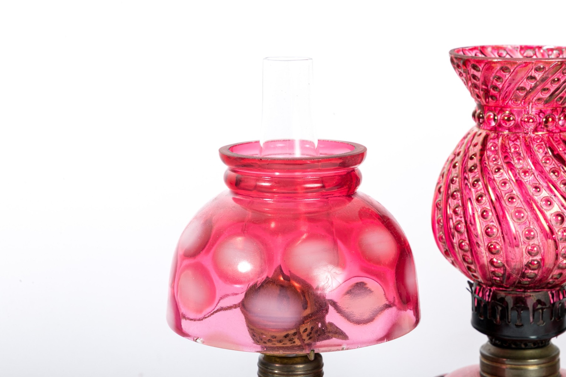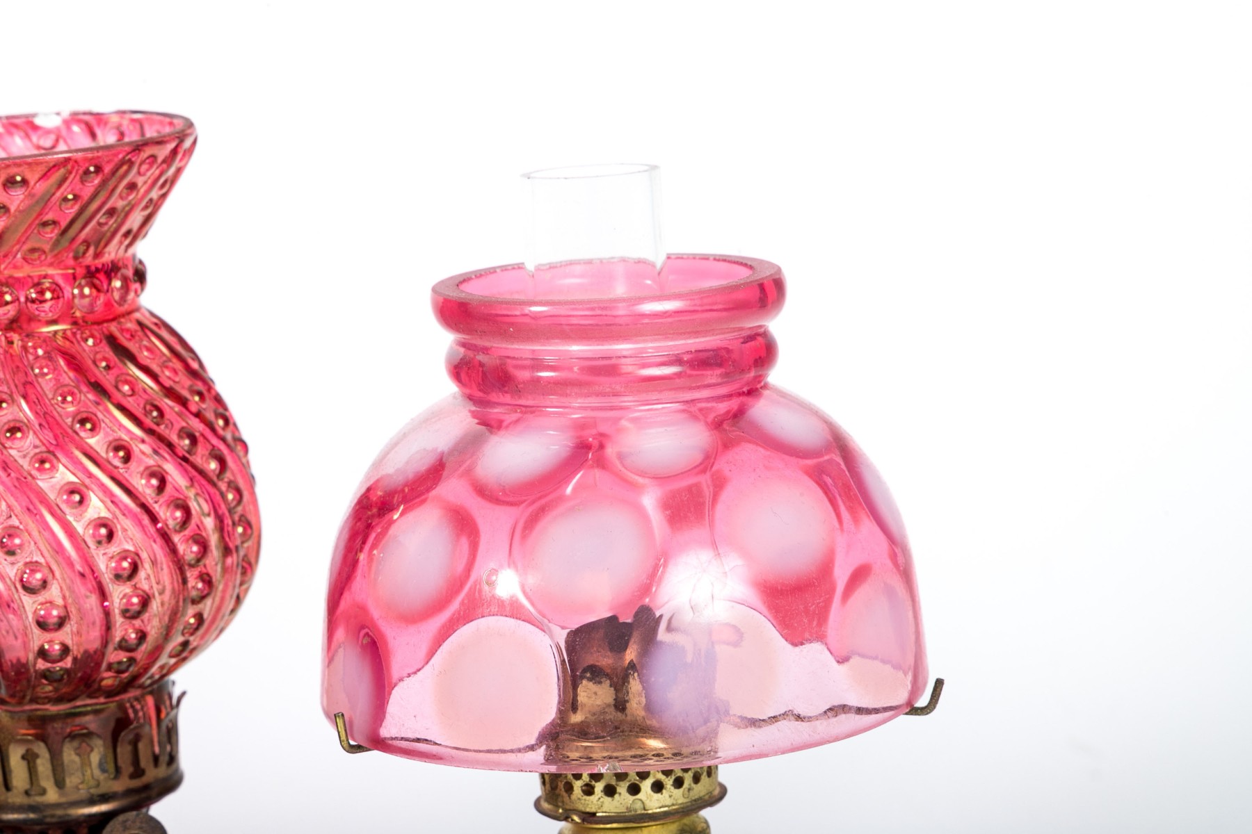 A delightful group of cranberry depression glass oil lamps. The first pair sports white coin spot designs, topped with domed shades and glass chimneys. The second pair displays an opalescent finish over spiraling bands of gadroons and stipples.