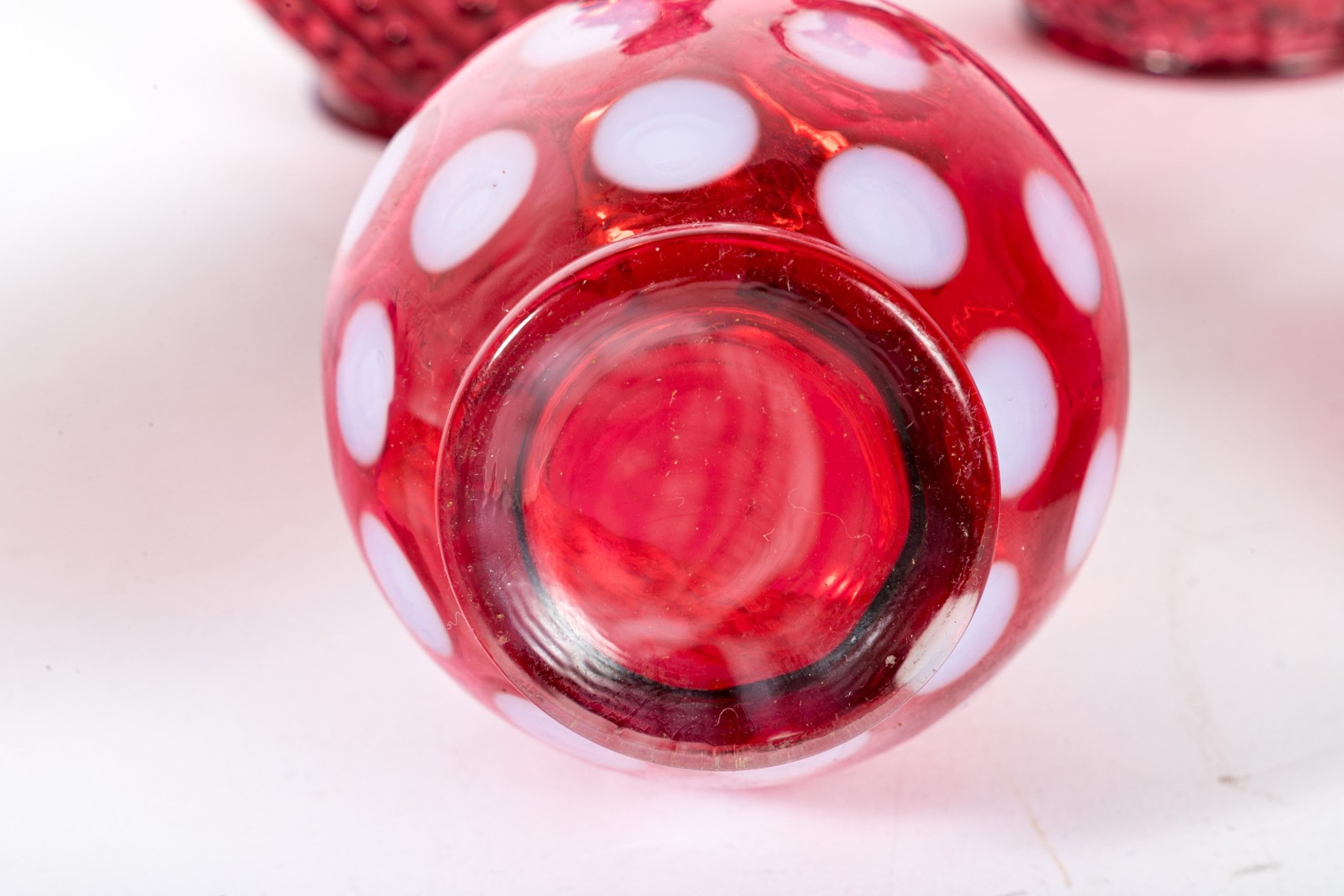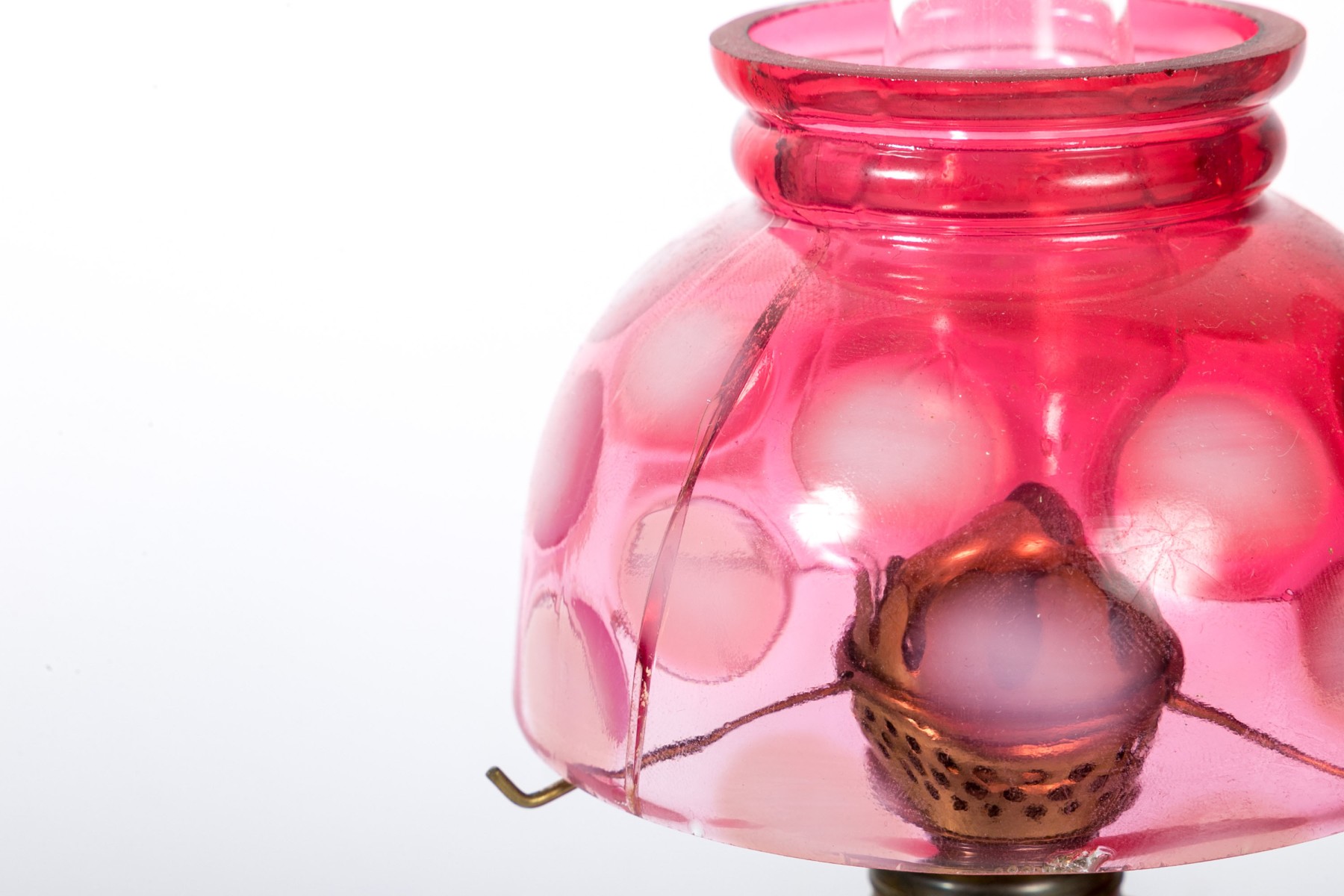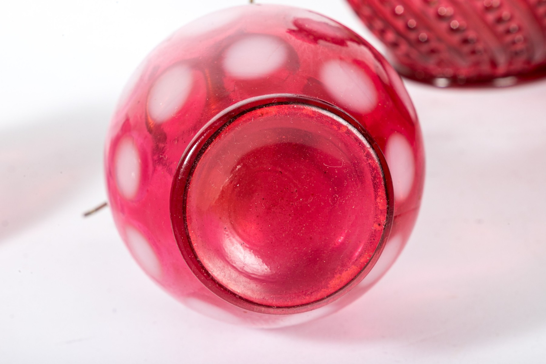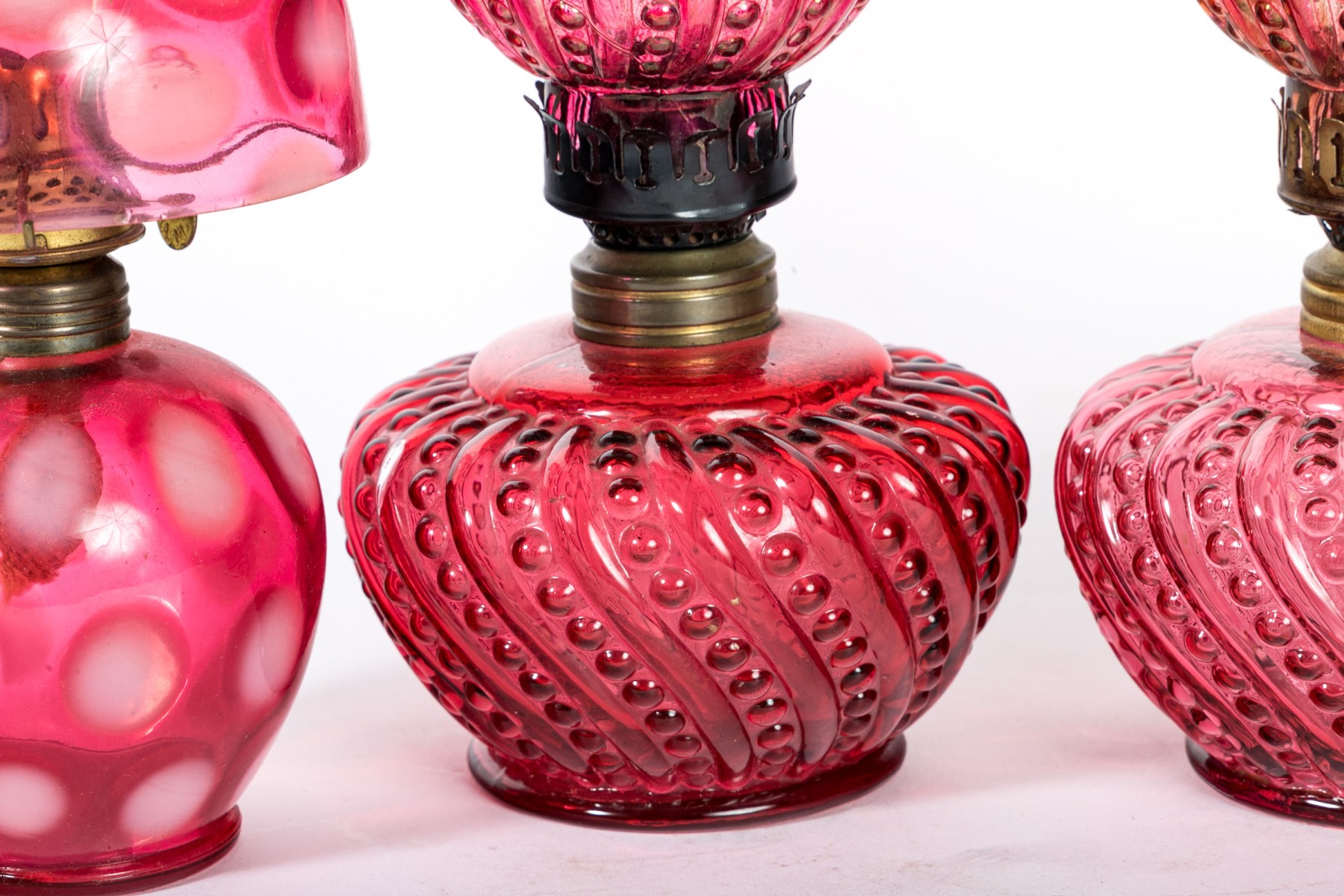 A delightful group of cranberry depression glass oil lamps. The first pair sports white coin spot designs, topped with domed shades and glass chimneys. The second pair displays an opalescent finish over spiraling bands of gadroons and stipples.