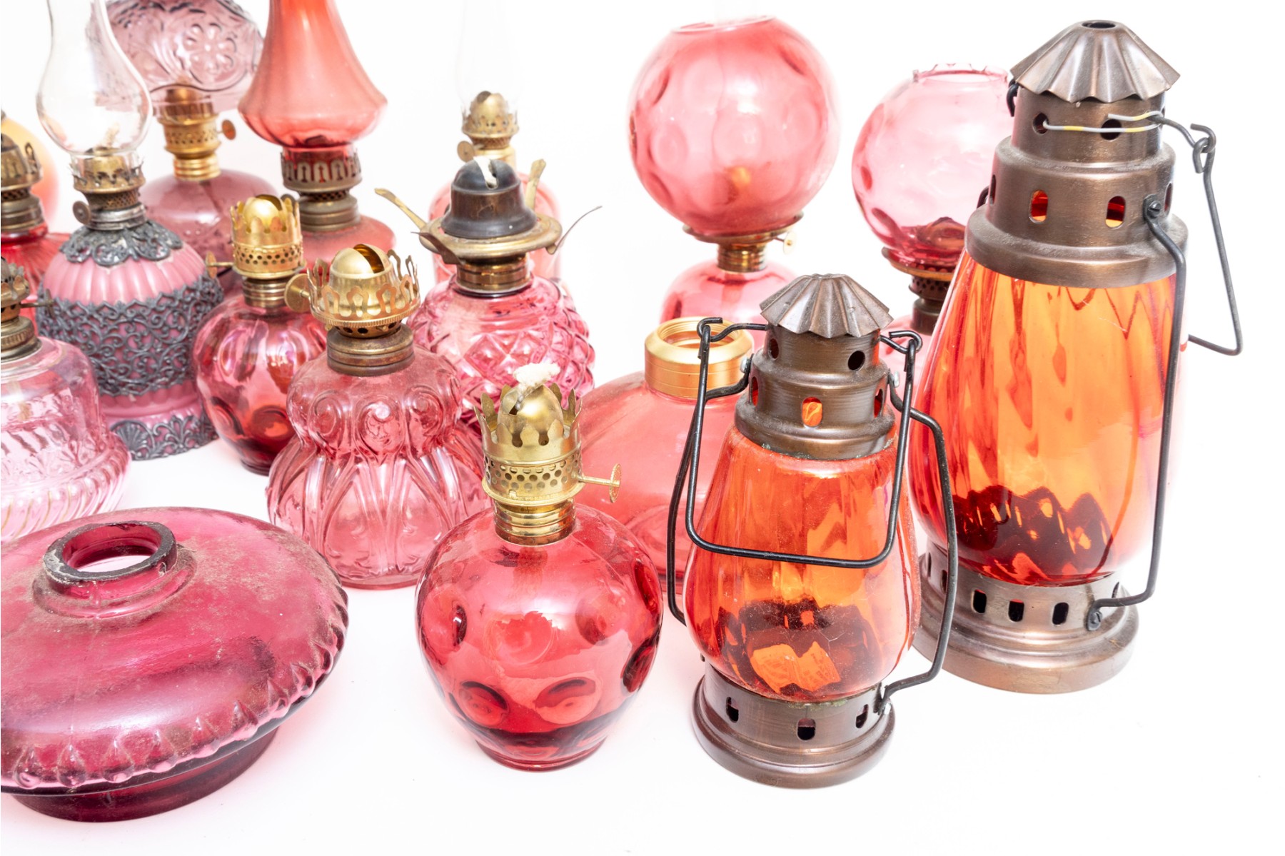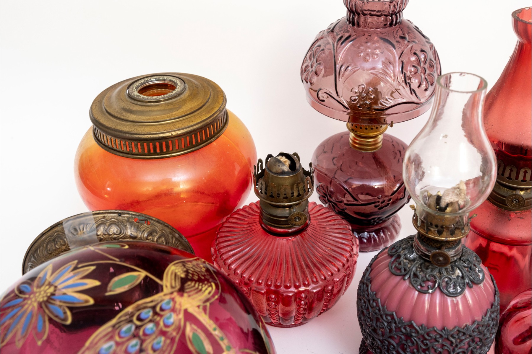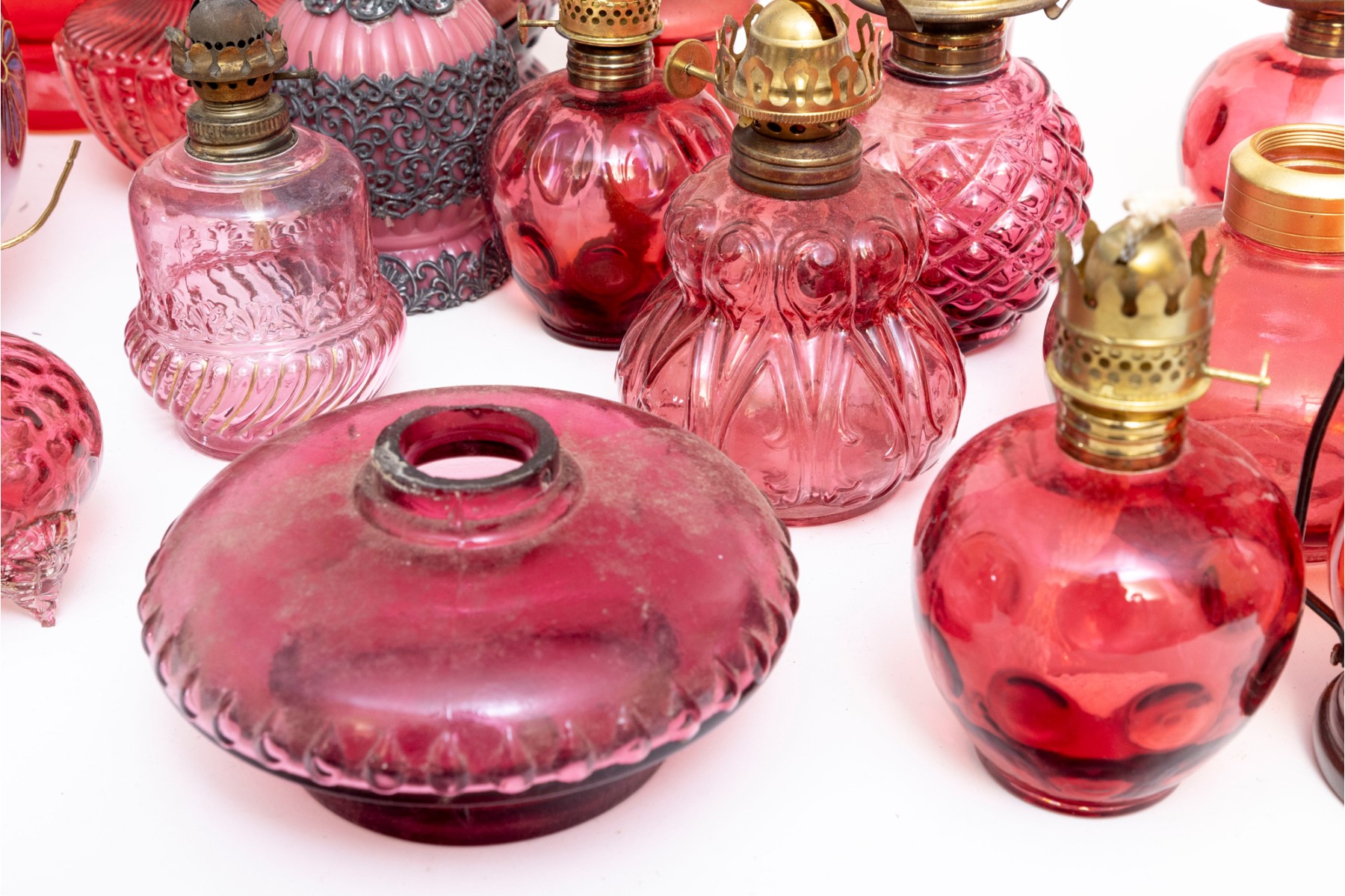 A fabulous variety of vintage cranberry depression glass including oil lamps, fonts, and shades in coin dot and honeycomb patterns, including Fenton.