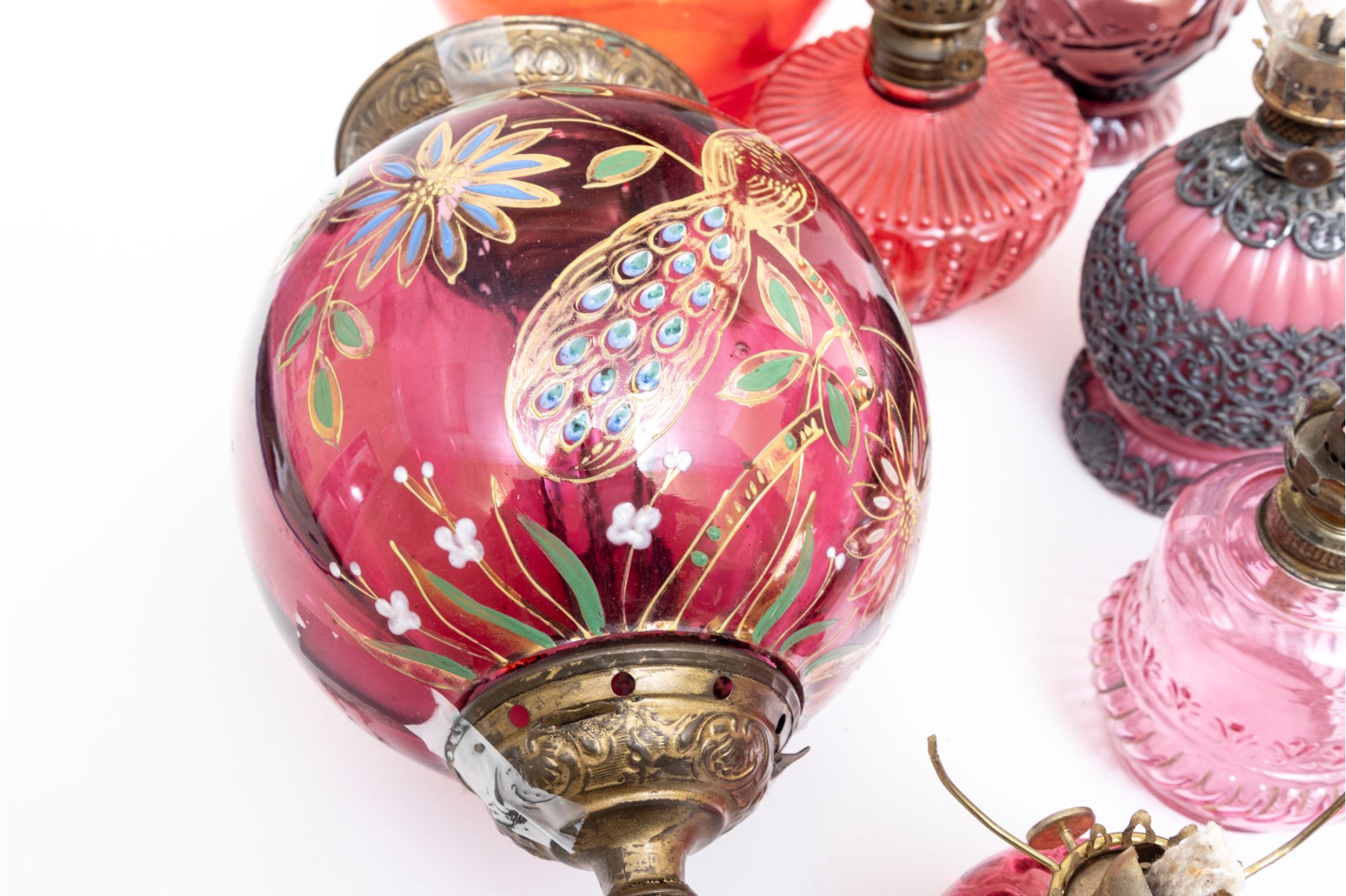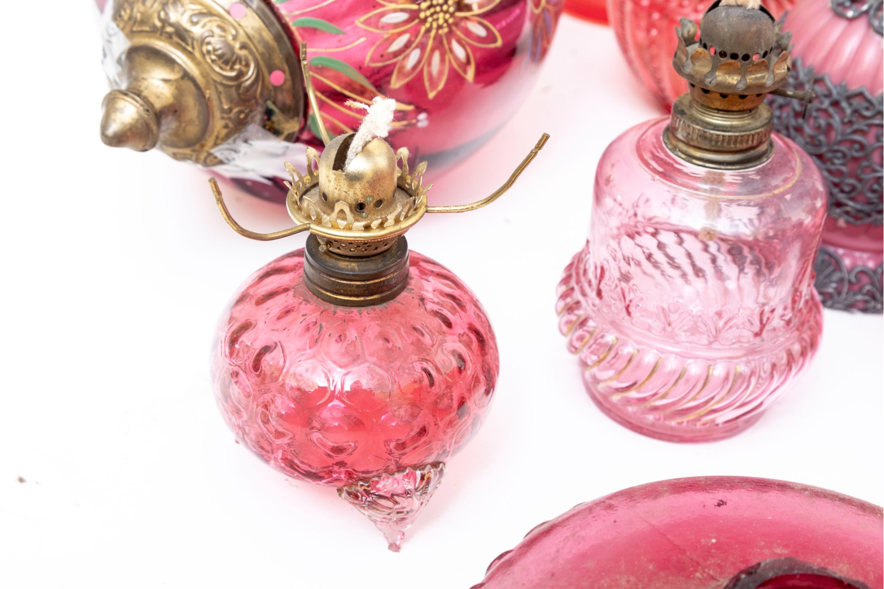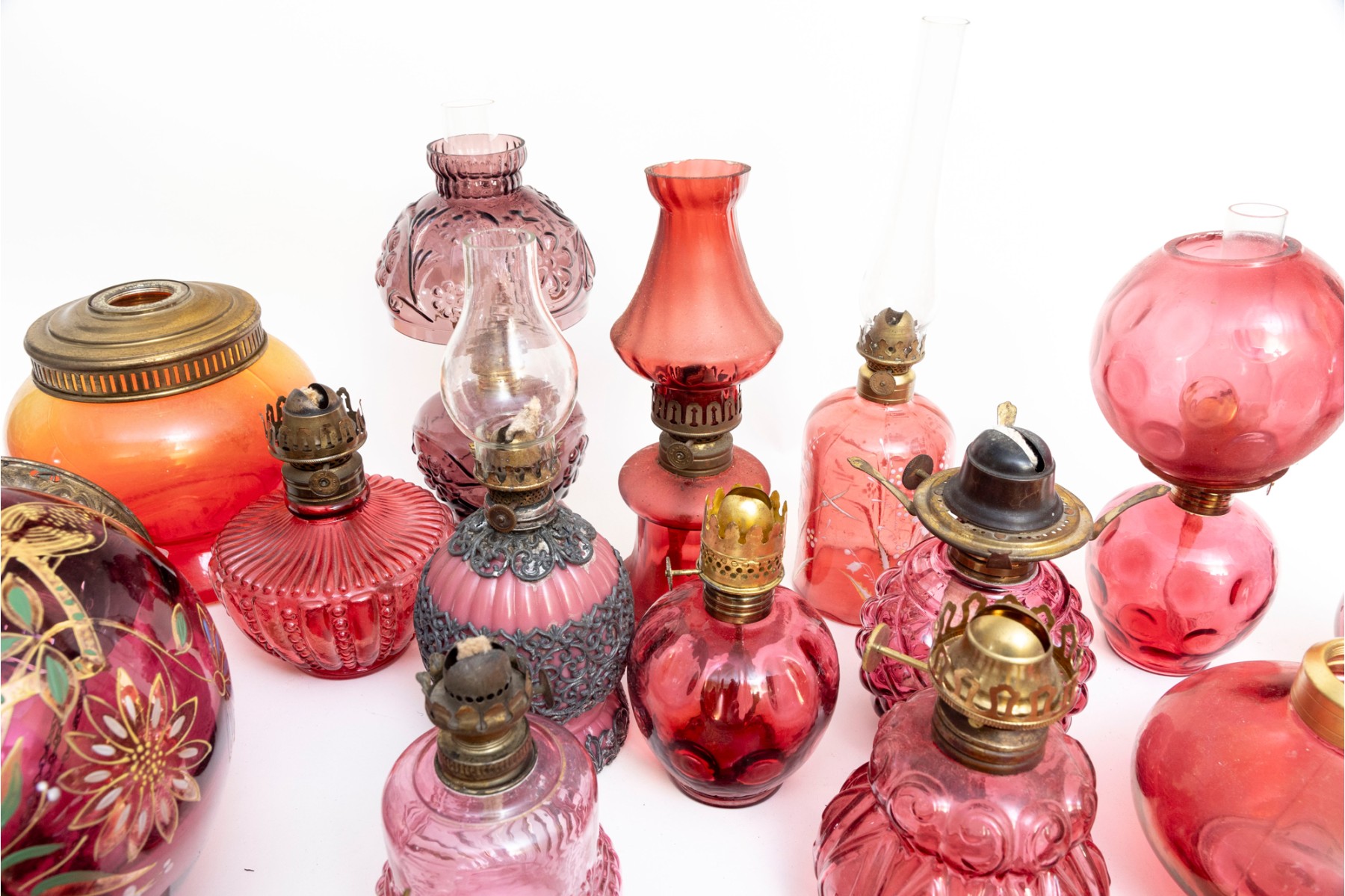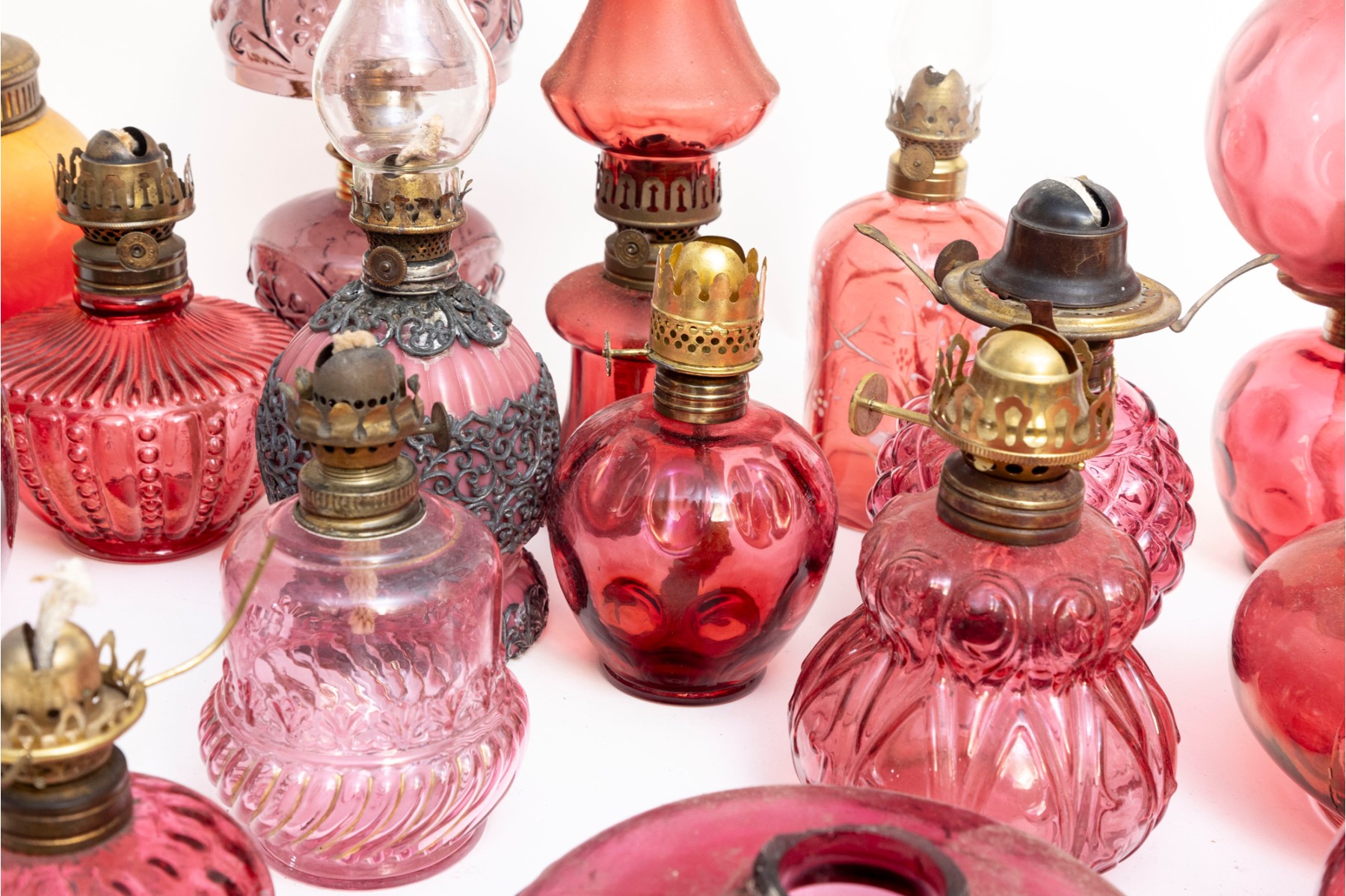 A fabulous variety of vintage cranberry depression glass including oil lamps, fonts, and shades in coin dot and honeycomb patterns, including Fenton.