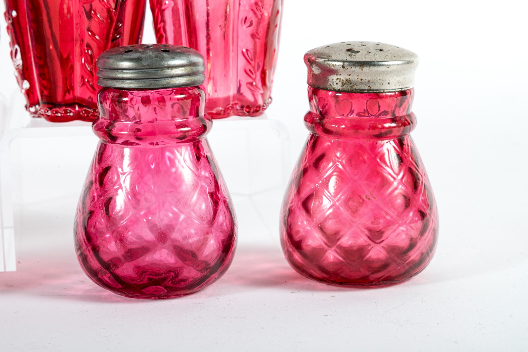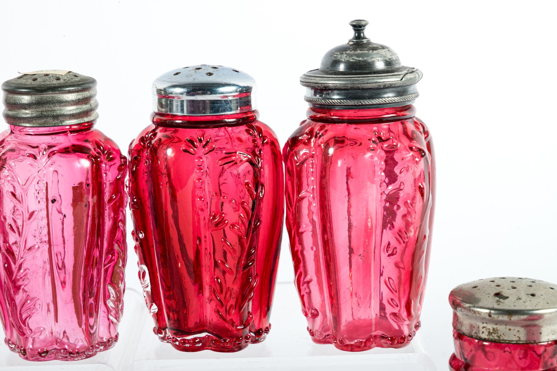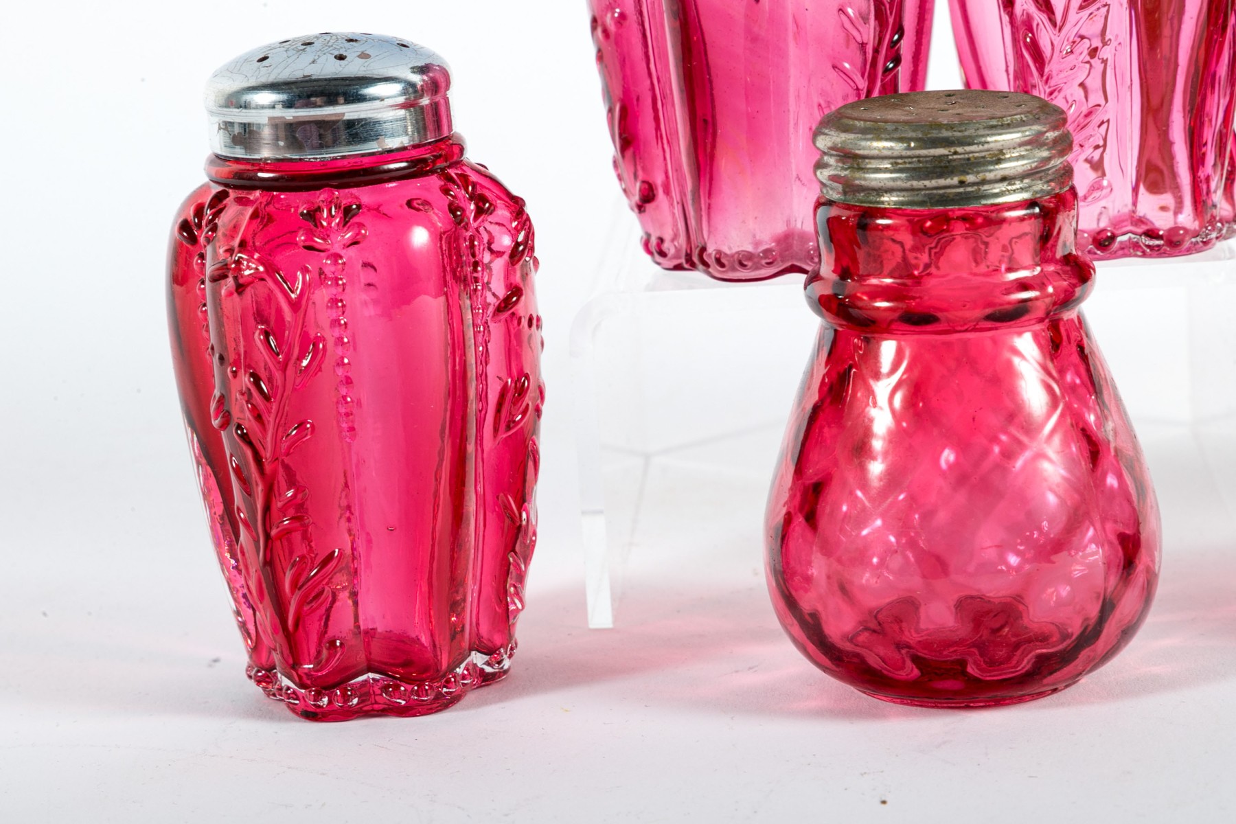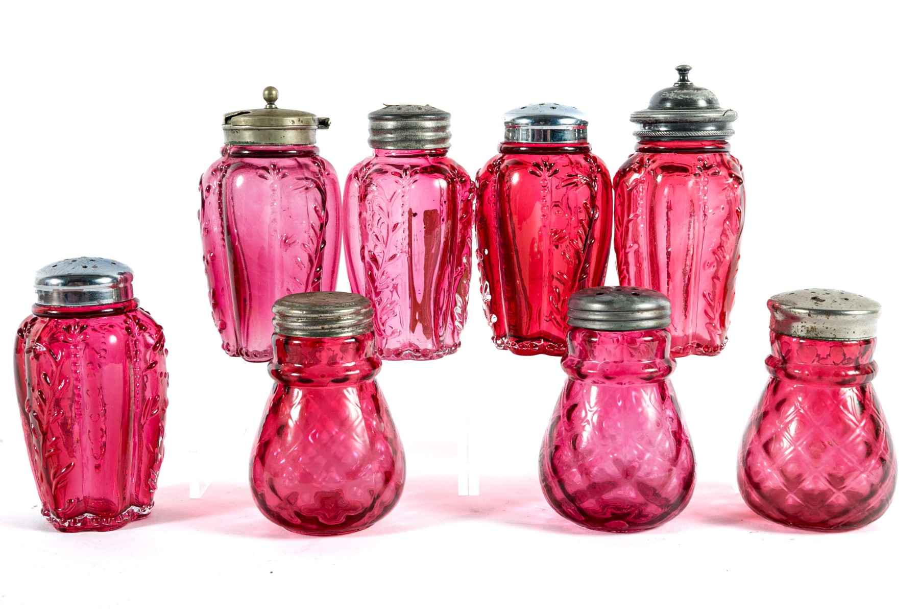 A collection of cranberry depression glass Includes two shakers and two jars with tall, gadrooned bodies decorated with foliate relief and stippled flourishes; and three pear-shaped shakers with diamond-quilted textures.