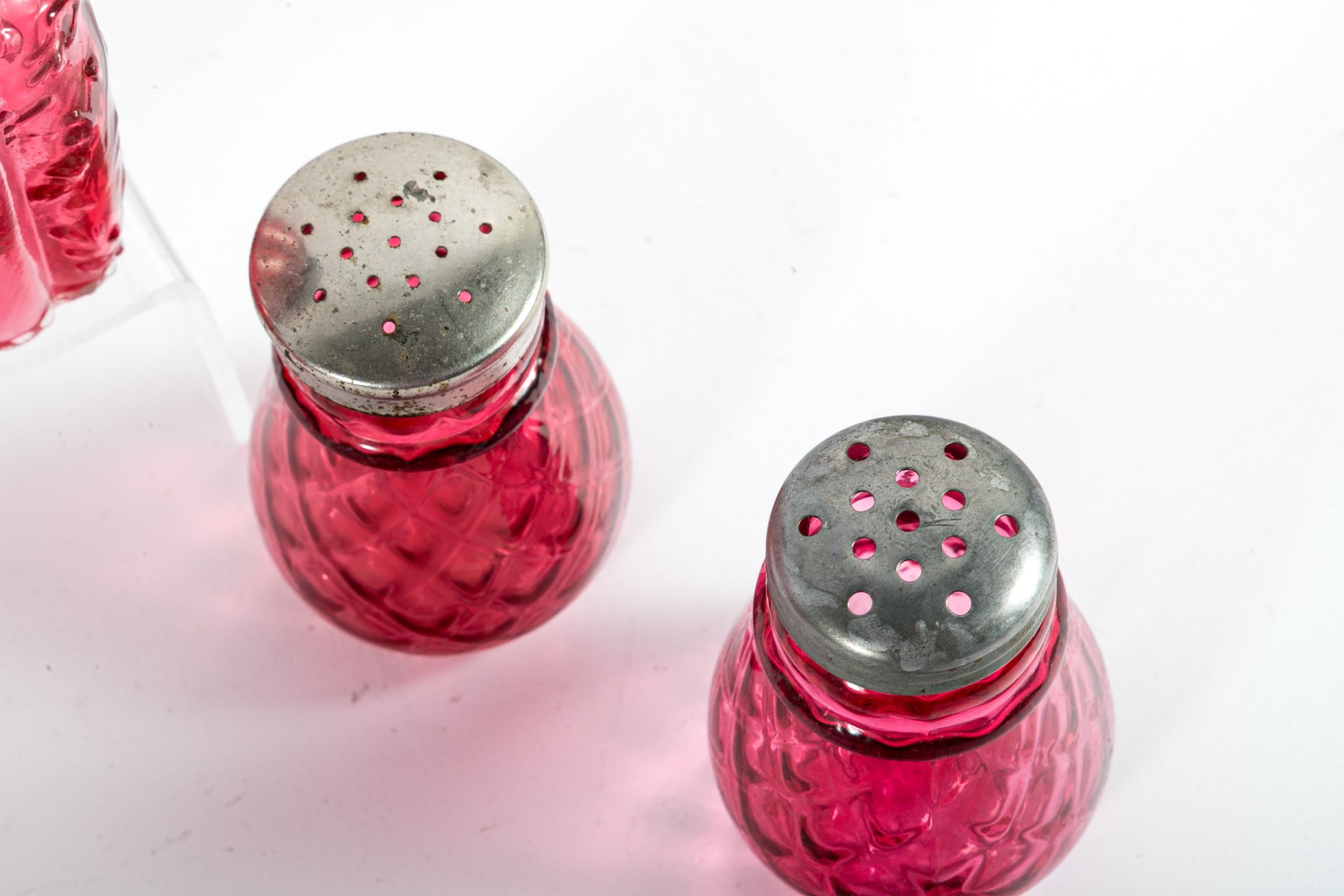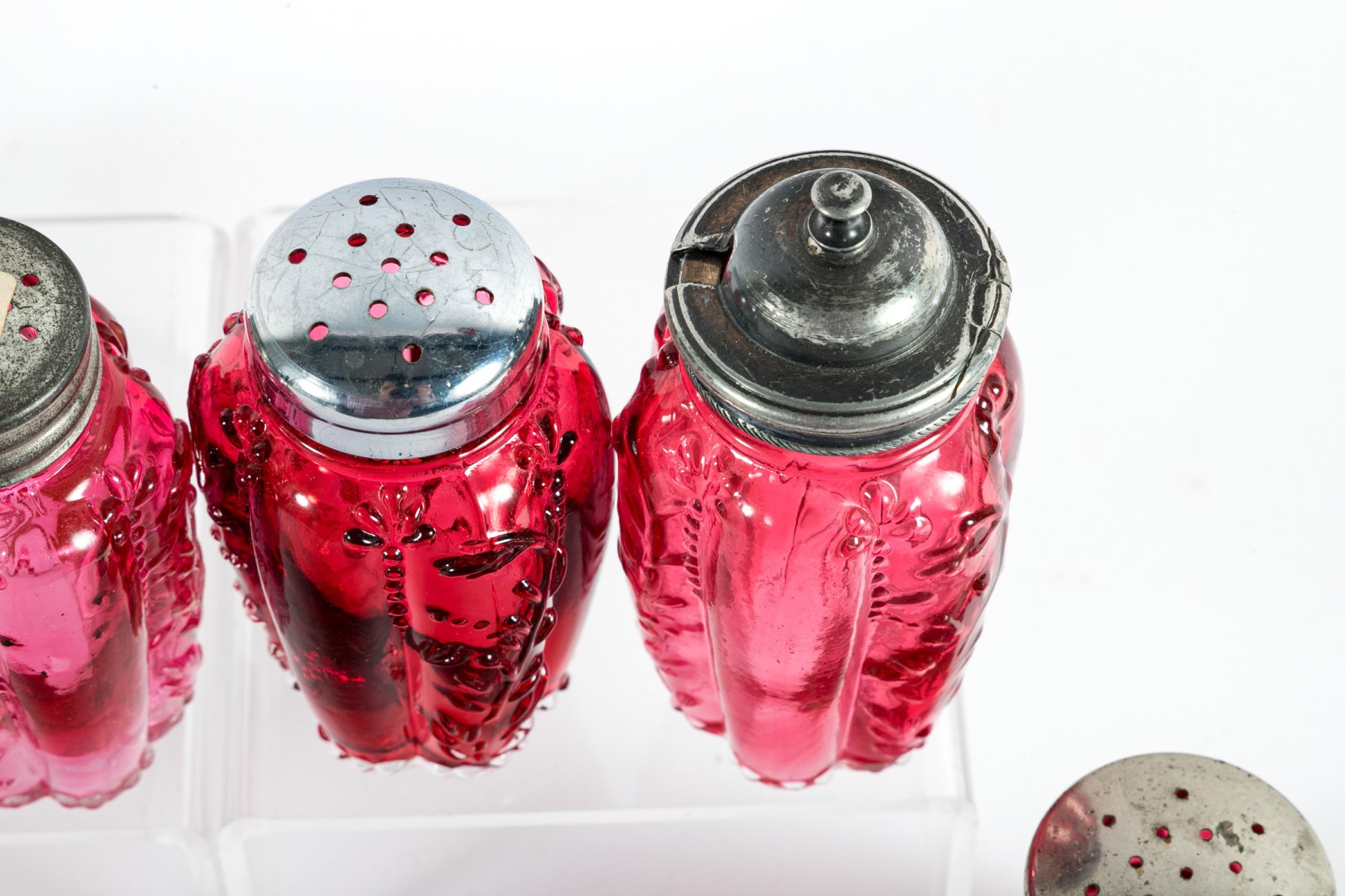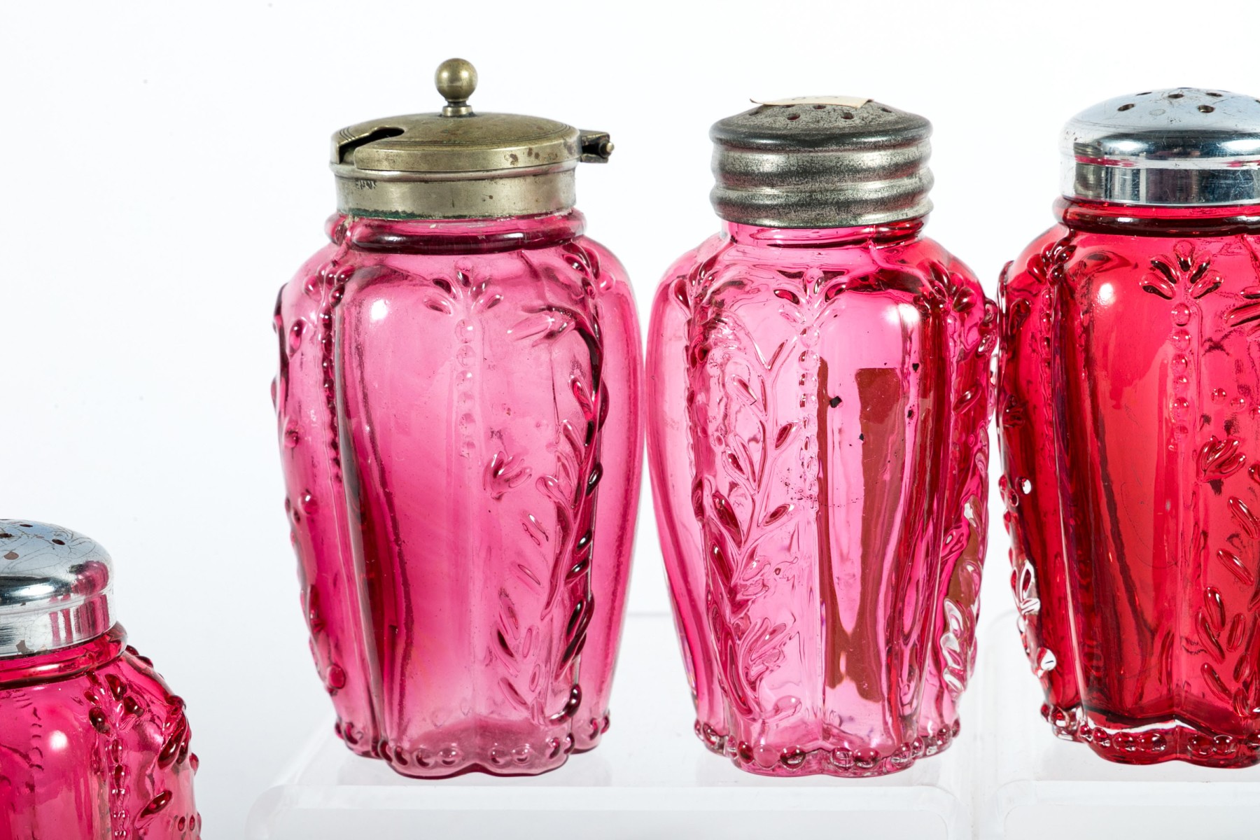 A collection of cranberry depression glass Includes two shakers and two jars with tall, gadrooned bodies decorated with foliate relief and stippled flourishes; and three pear-shaped shakers with diamond-quilted textures.