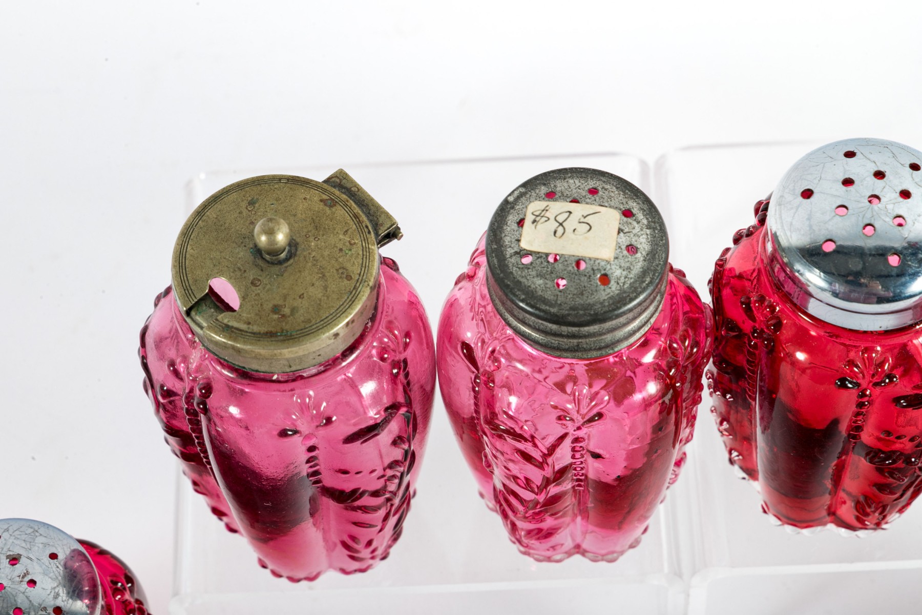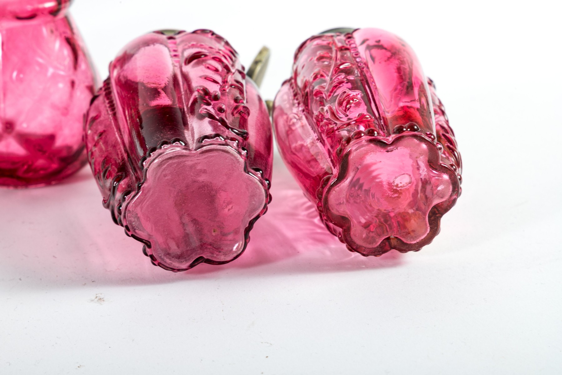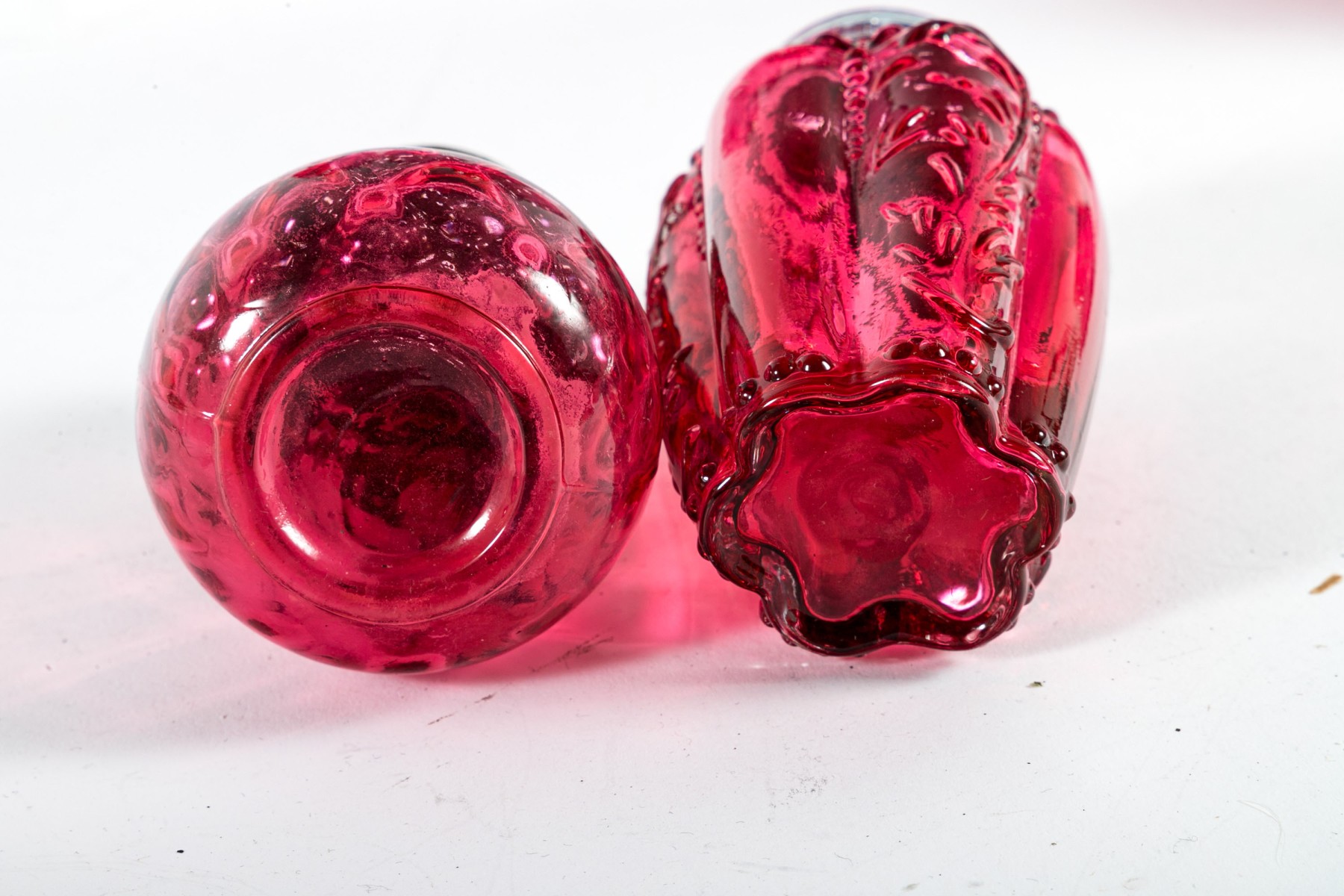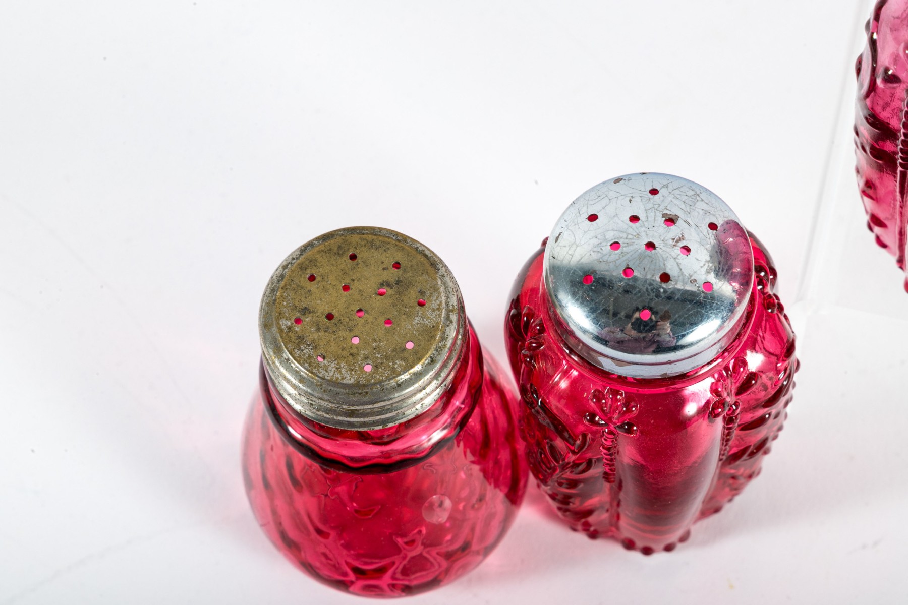 A collection of cranberry depression glass Includes two shakers and two jars with tall, gadrooned bodies decorated with foliate relief and stippled flourishes; and three pear-shaped shakers with diamond-quilted textures.