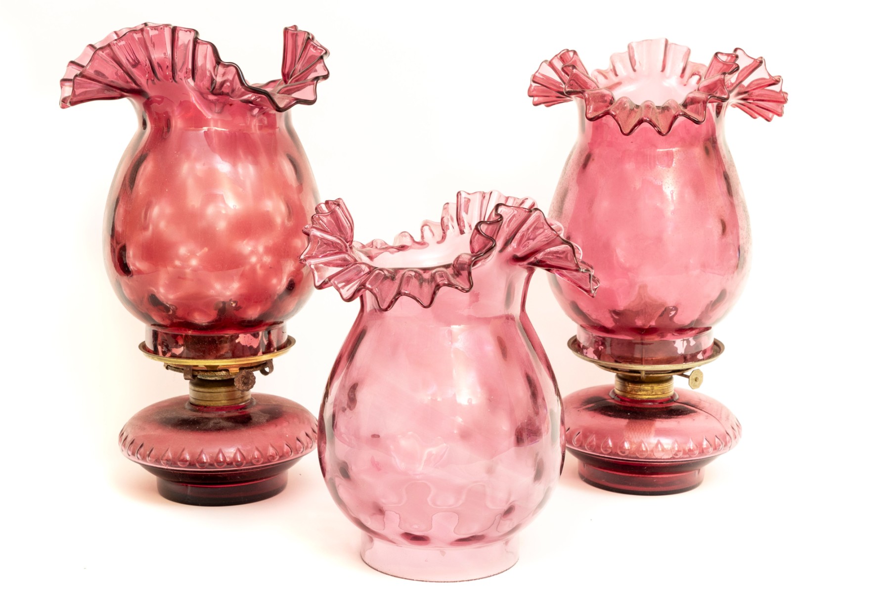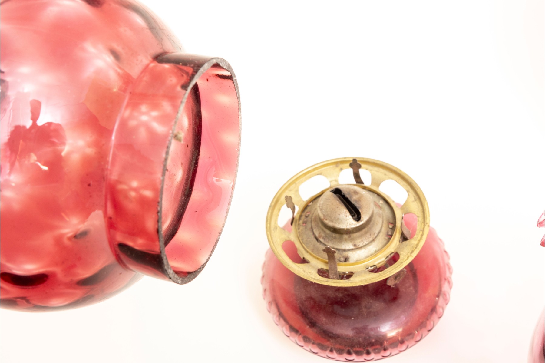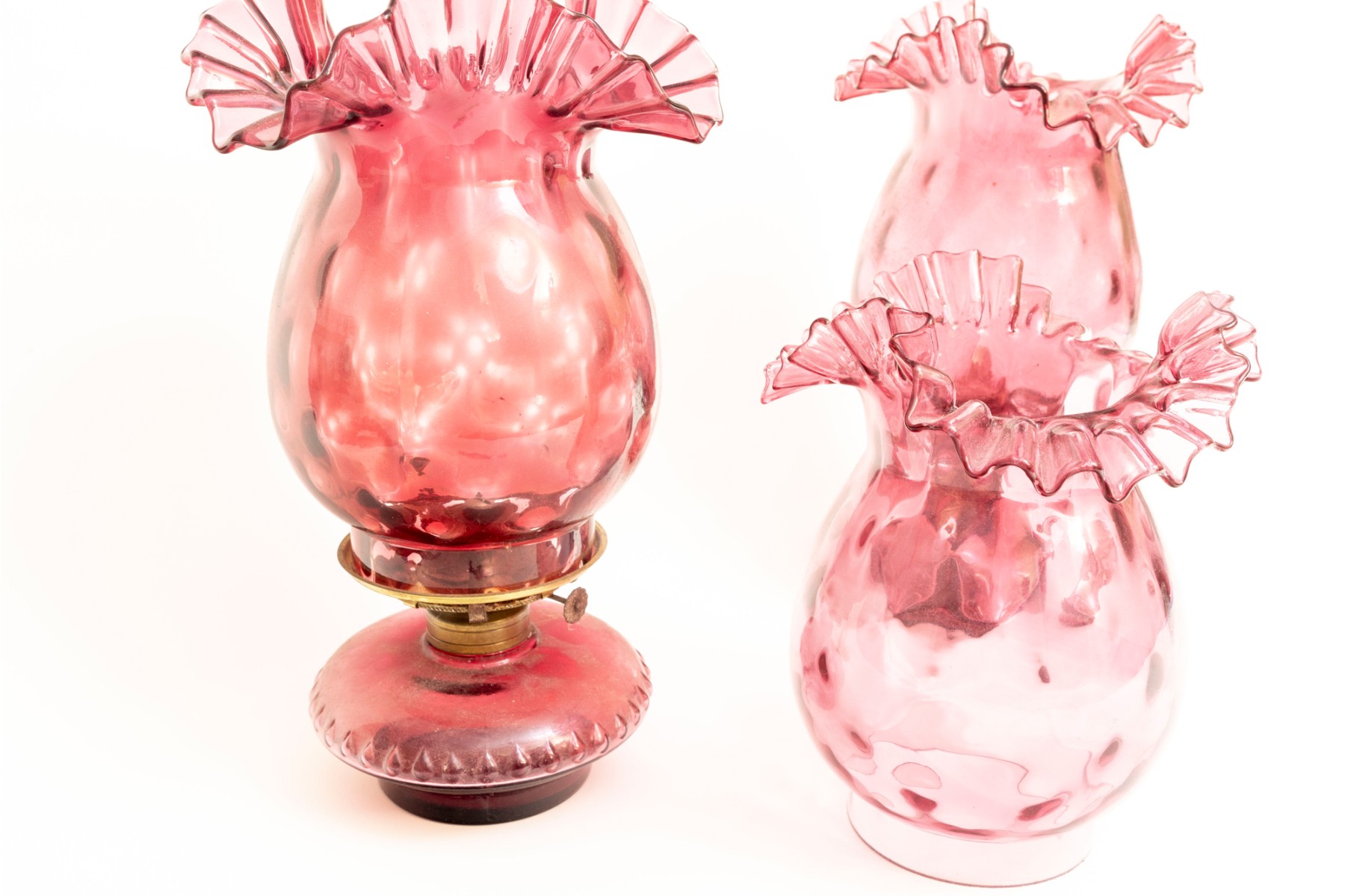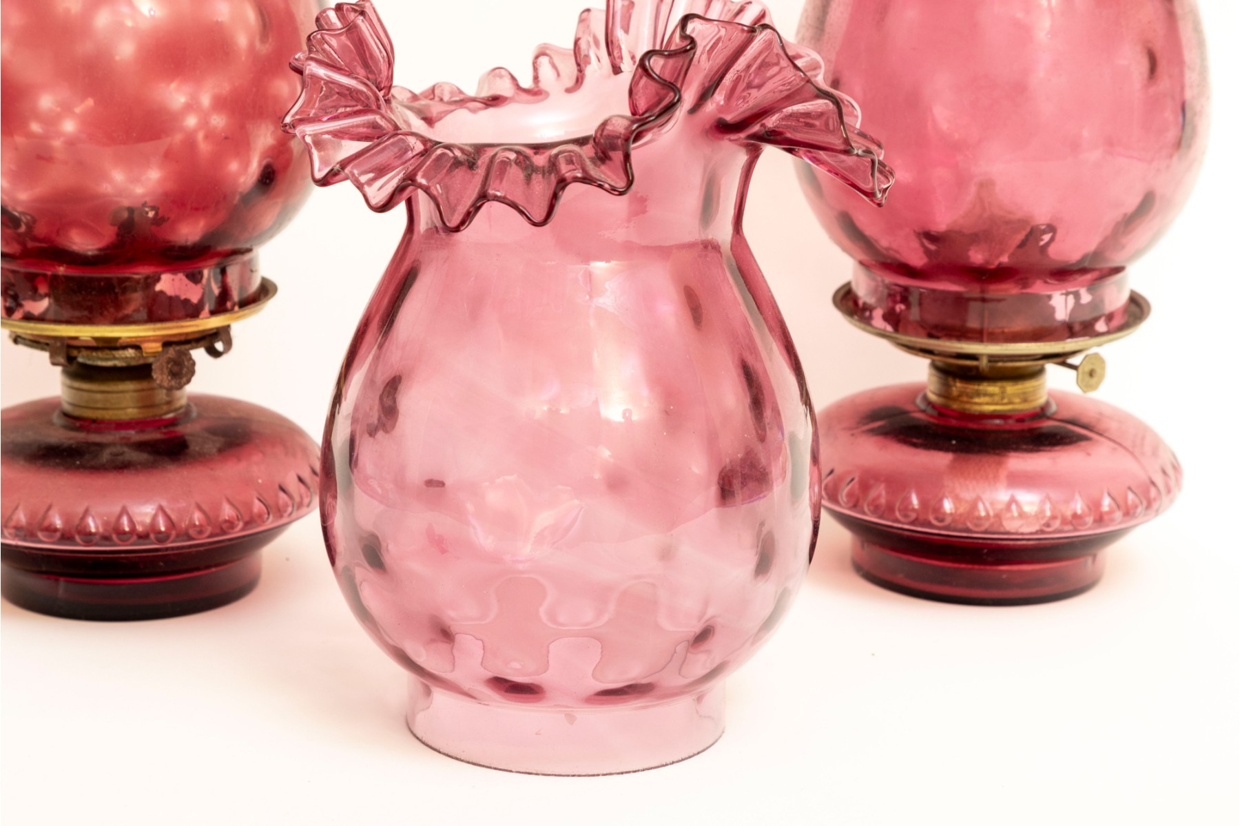 A duo of vintage cranberry glass oil lamps displaying a border of pear-shaped relief on a stout bun-shaped font over a raised foot. Includes three matching shades with ruffled rims.