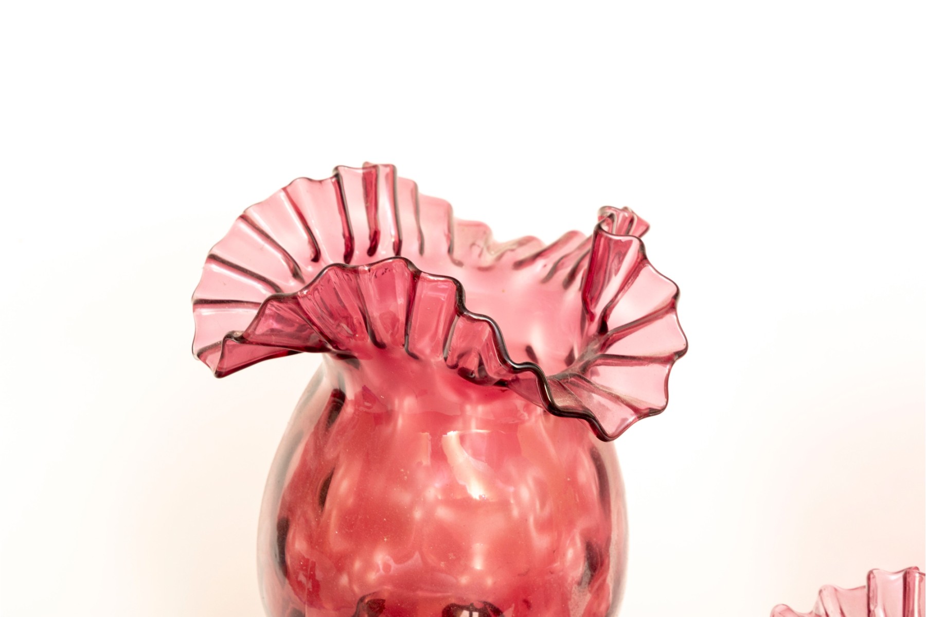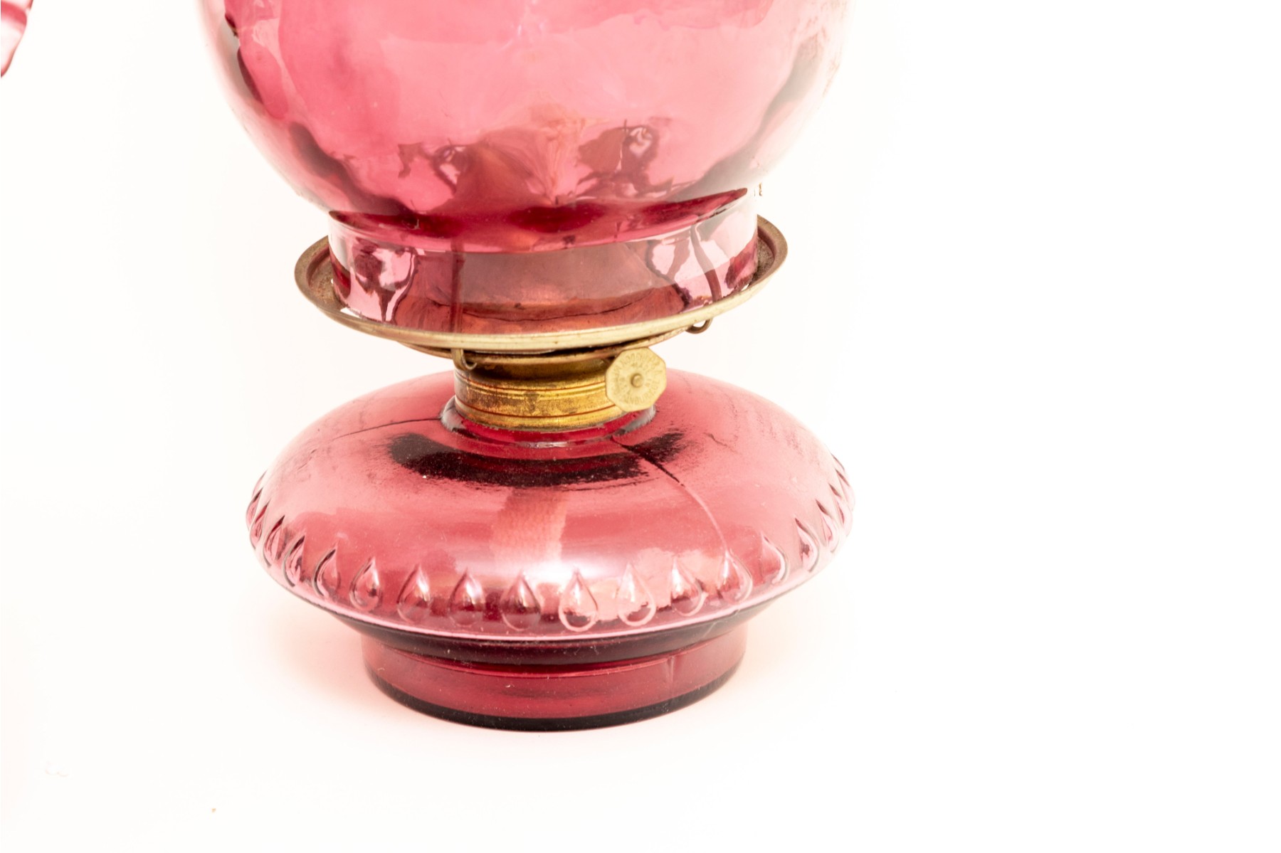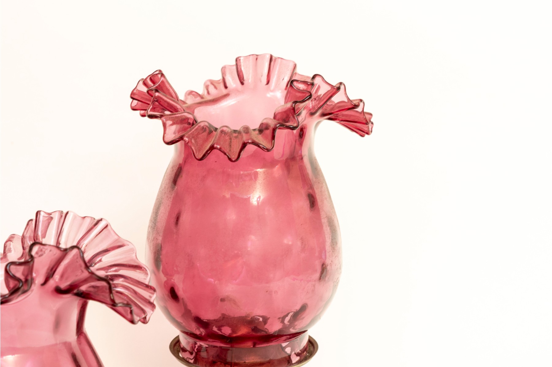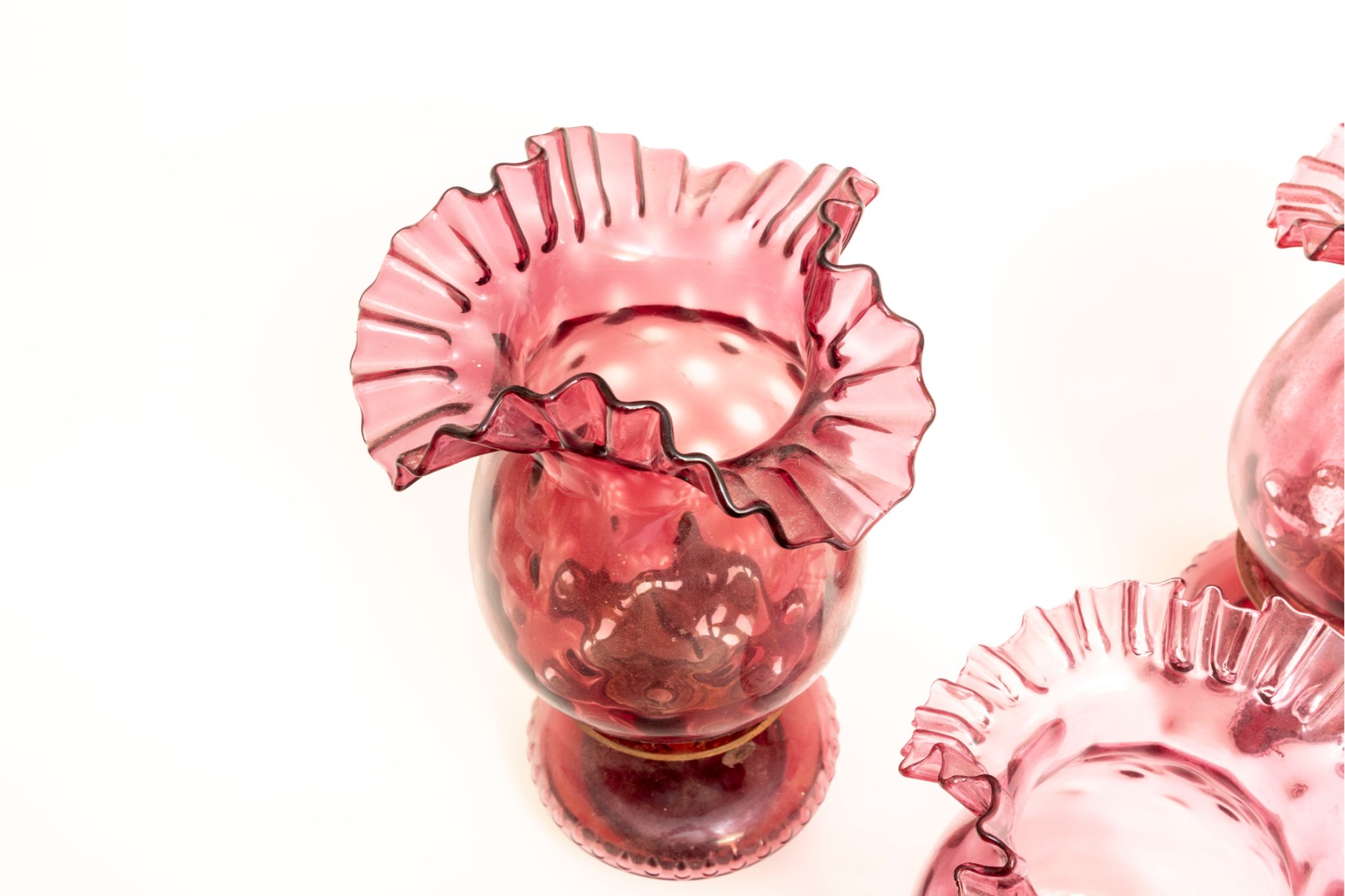 A duo of vintage cranberry glass oil lamps displaying a border of pear-shaped relief on a stout bun-shaped font over a raised foot. Includes three matching shades with ruffled rims.