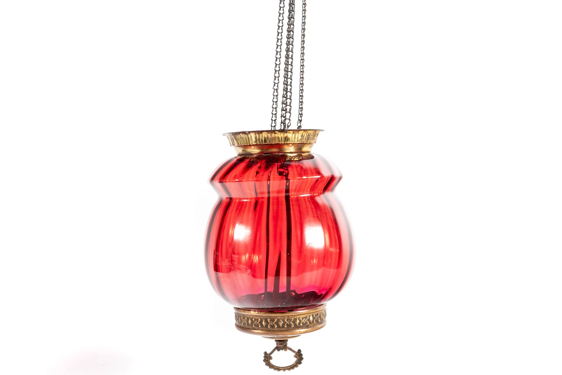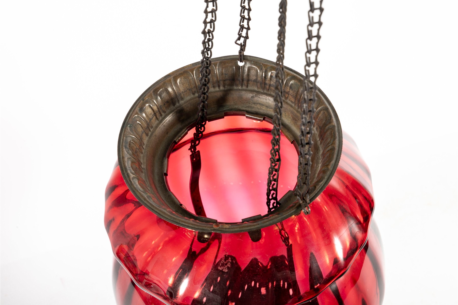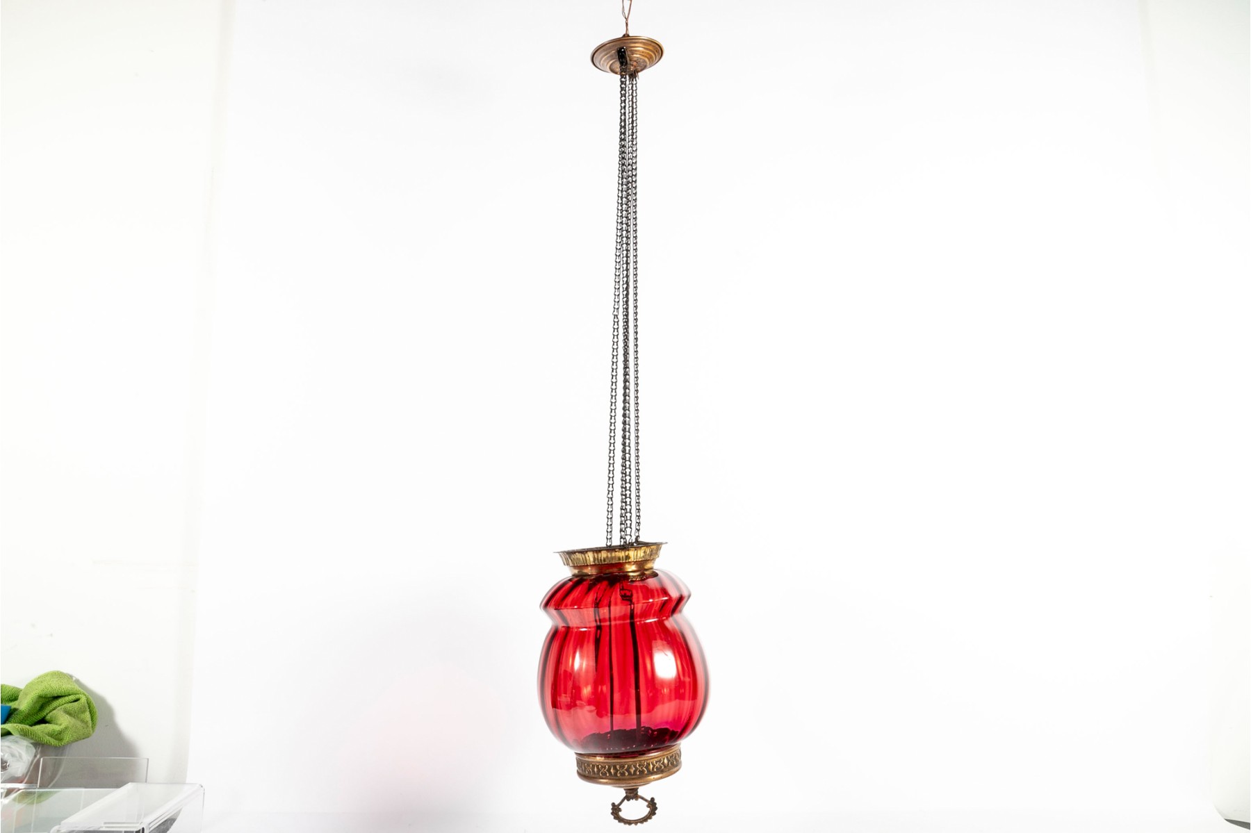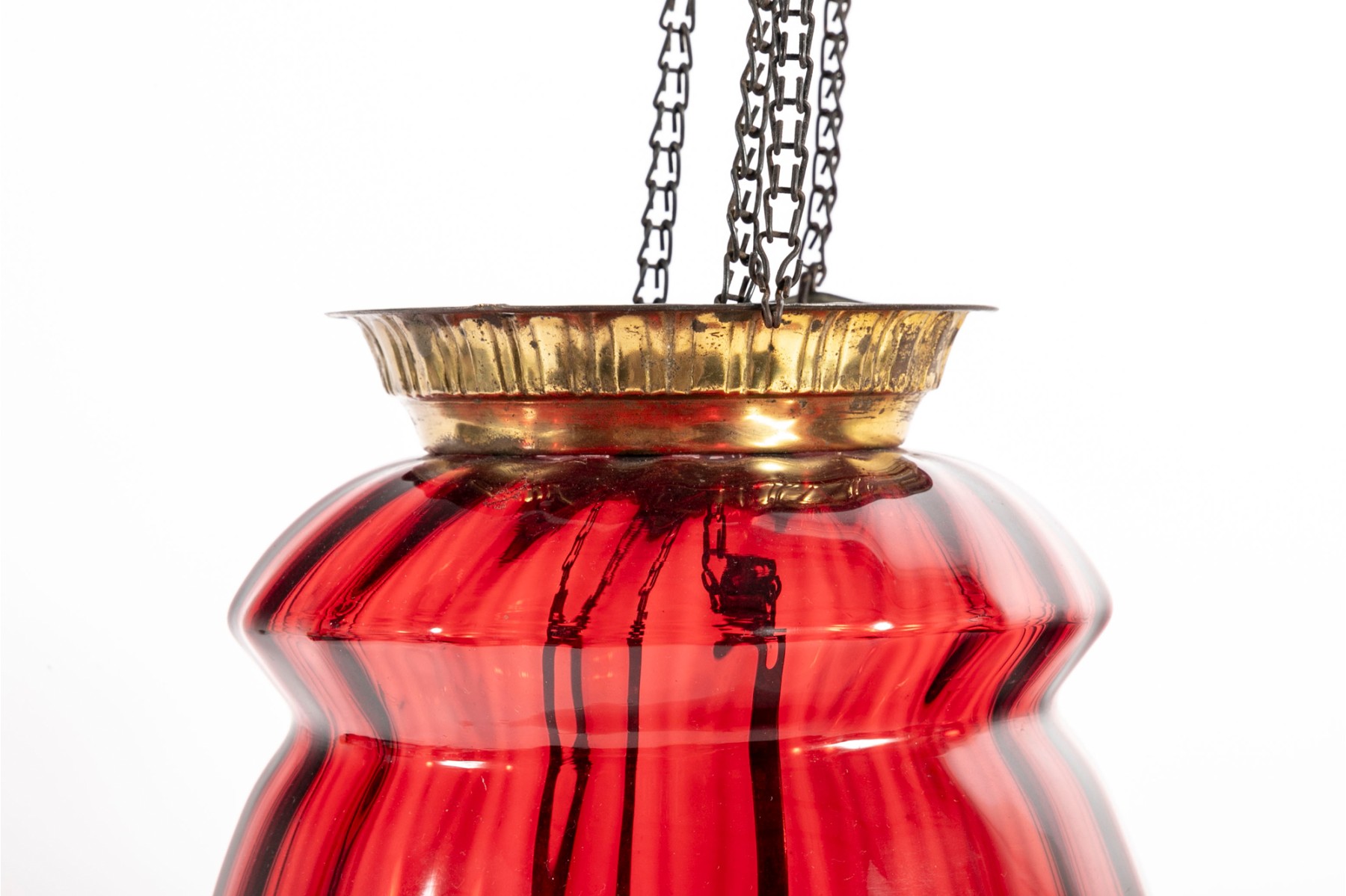 A wonderful pendant light displaying a vasaform cranberry glass body with subtle ribbing, topped with a gilt rim and a gently domed base with a foliate finial.