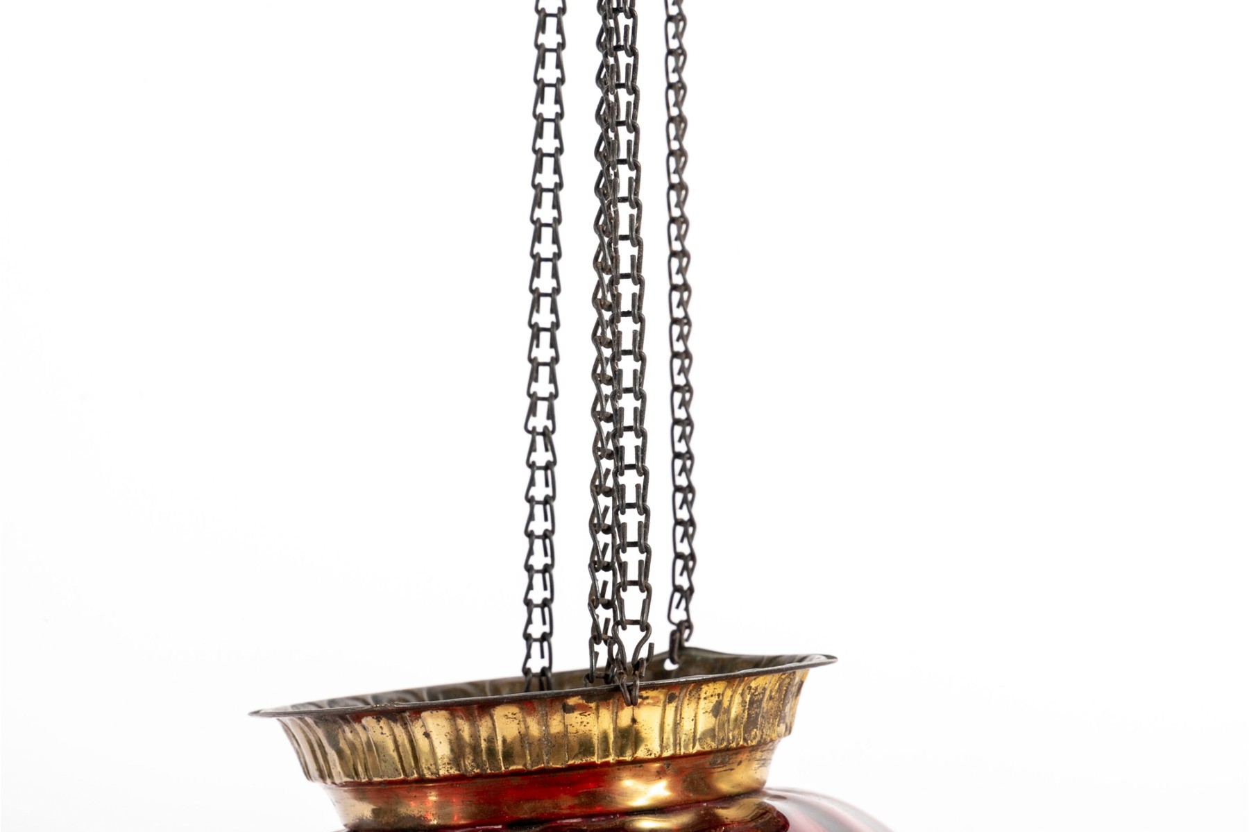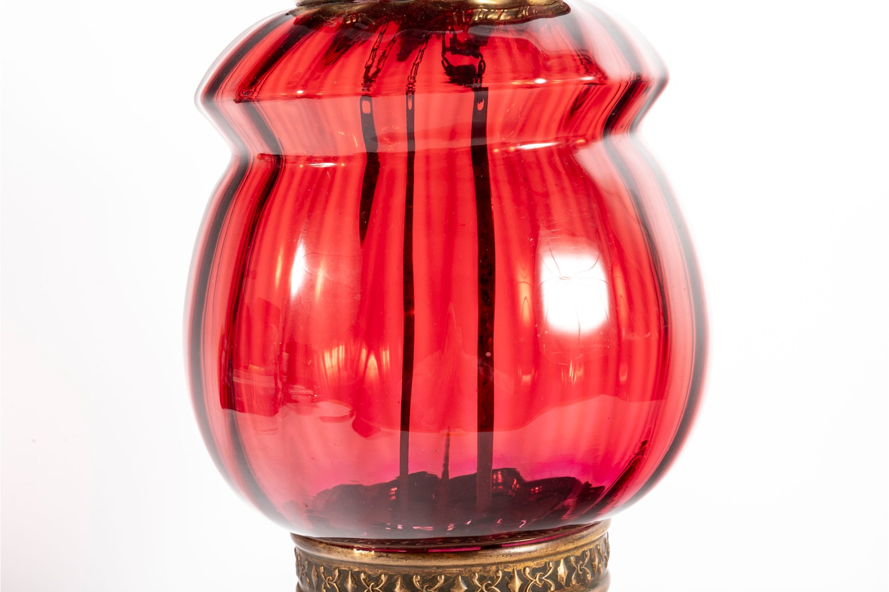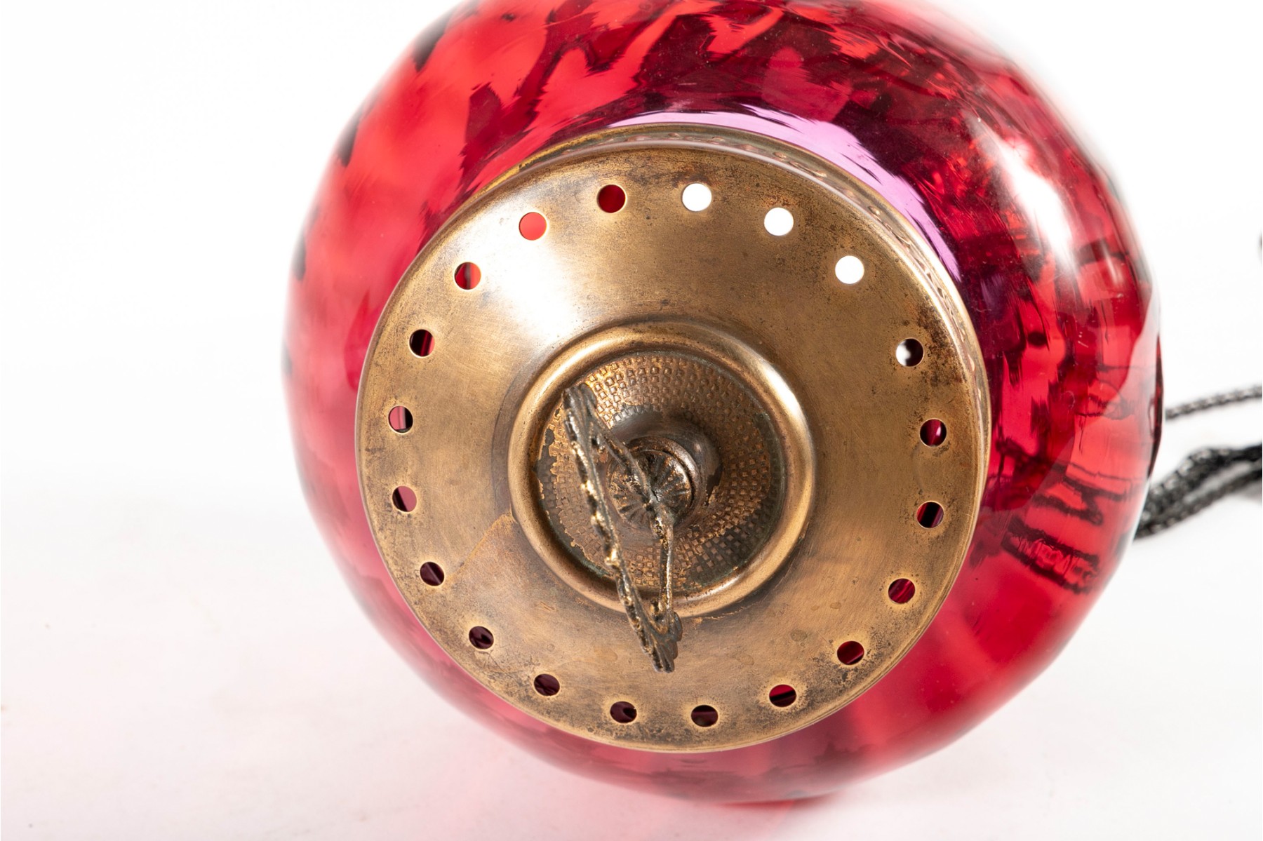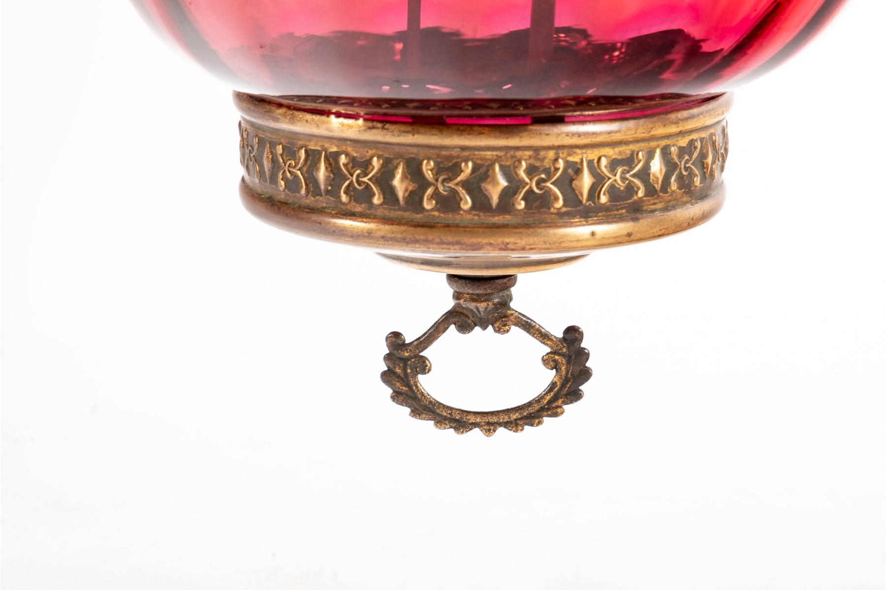 A wonderful pendant light displaying a vasaform cranberry glass body with subtle ribbing, topped with a gilt rim and a gently domed base with a foliate finial.