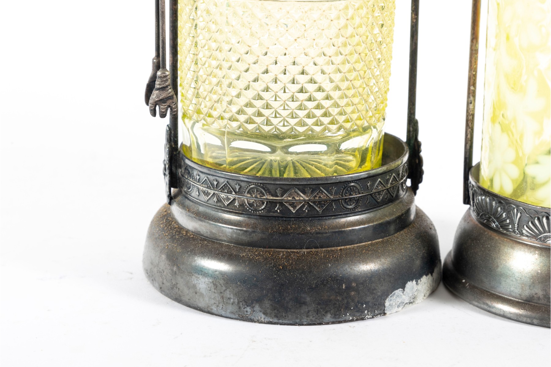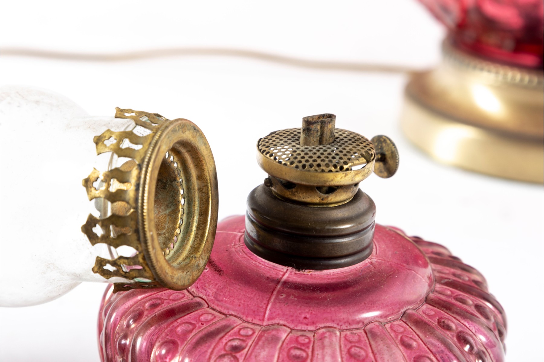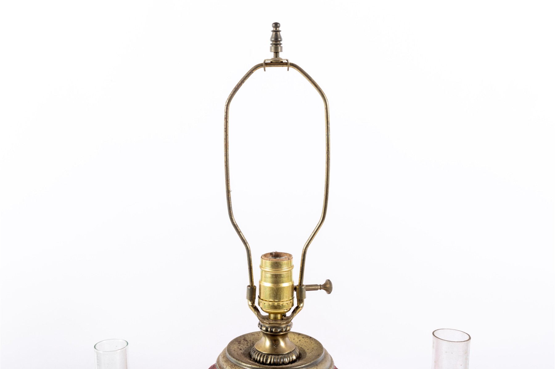 Displays well with minor wear including a small chip to the rim of one of the oil lamp's glass chimneys. The working condition of the table lamp has not been tested.