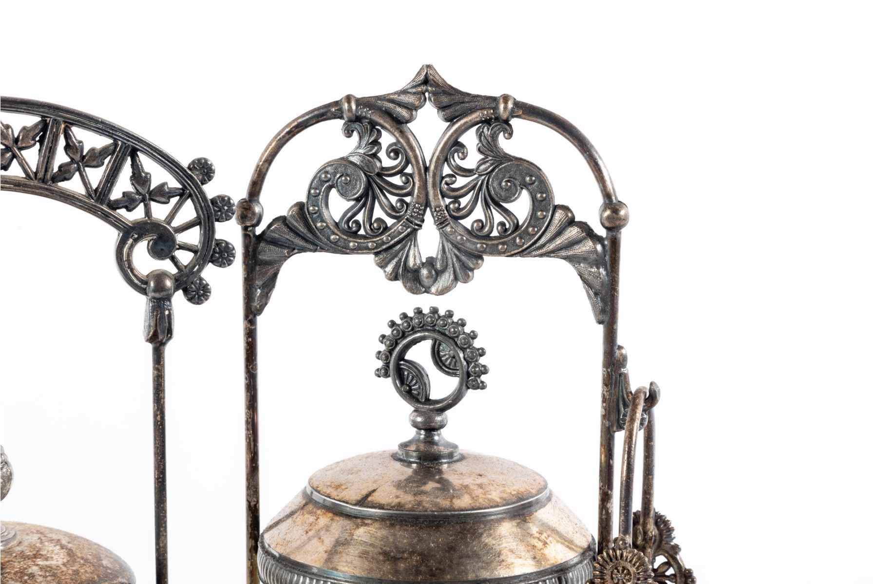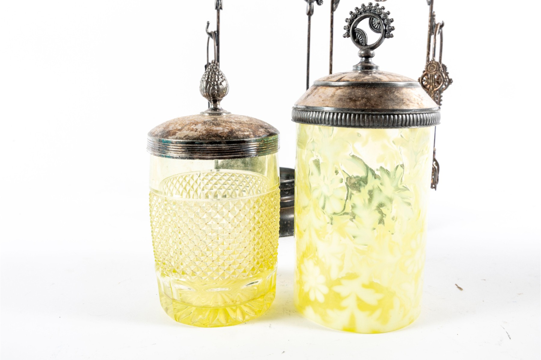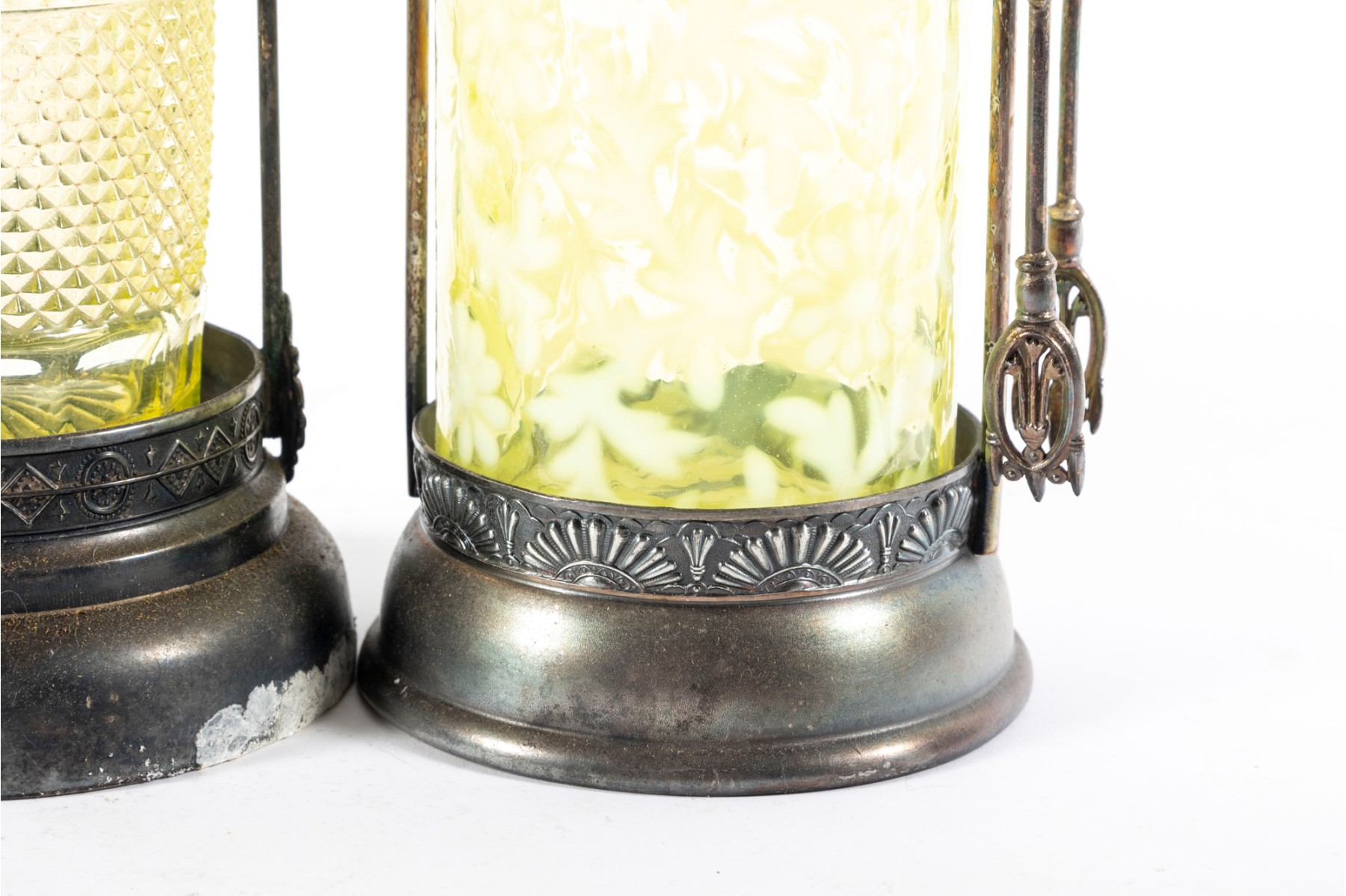 Displays well with minor wear including a small chip to the rim of one of the oil lamp's glass chimneys. The working condition of the table lamp has not been tested.