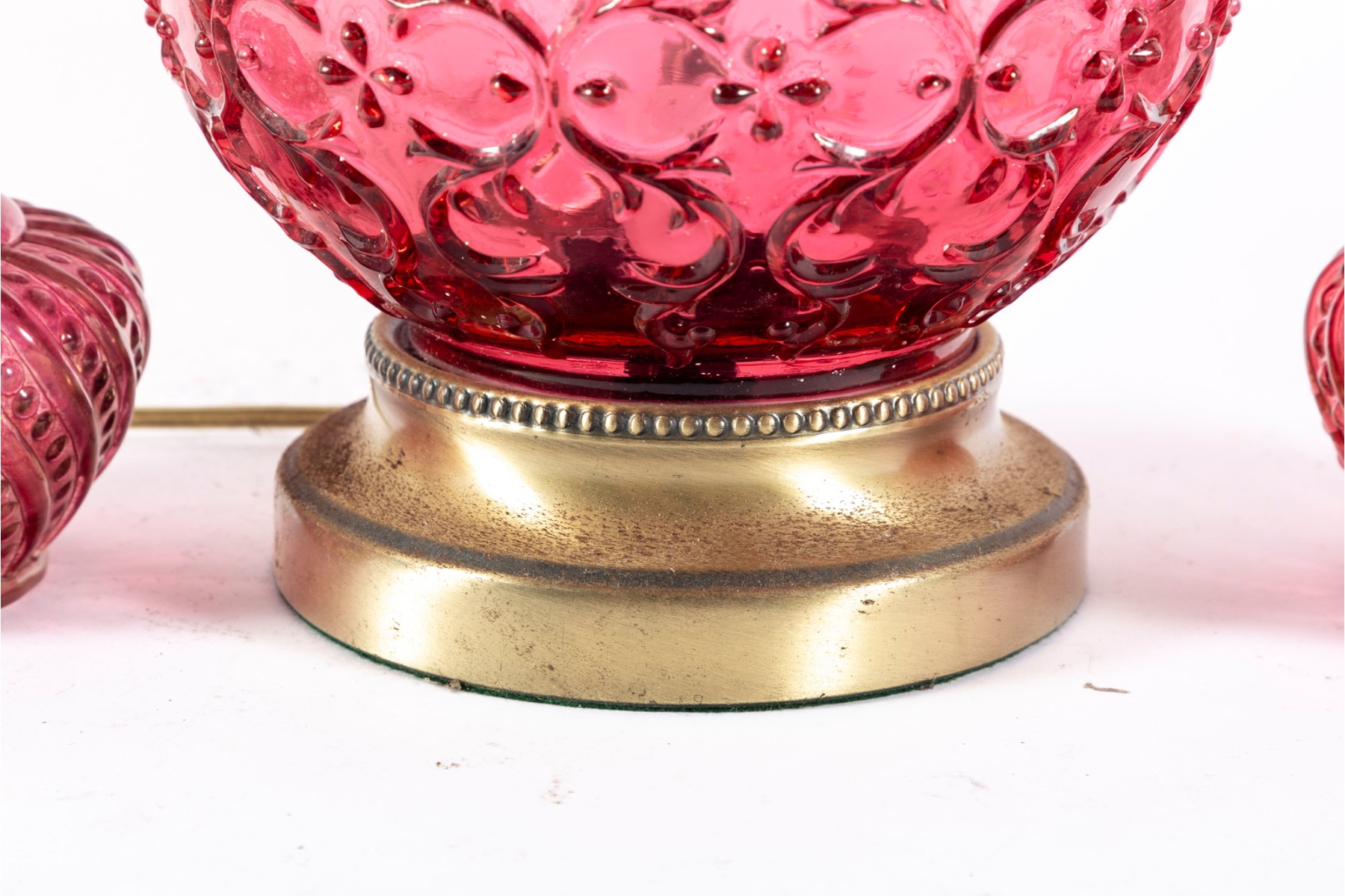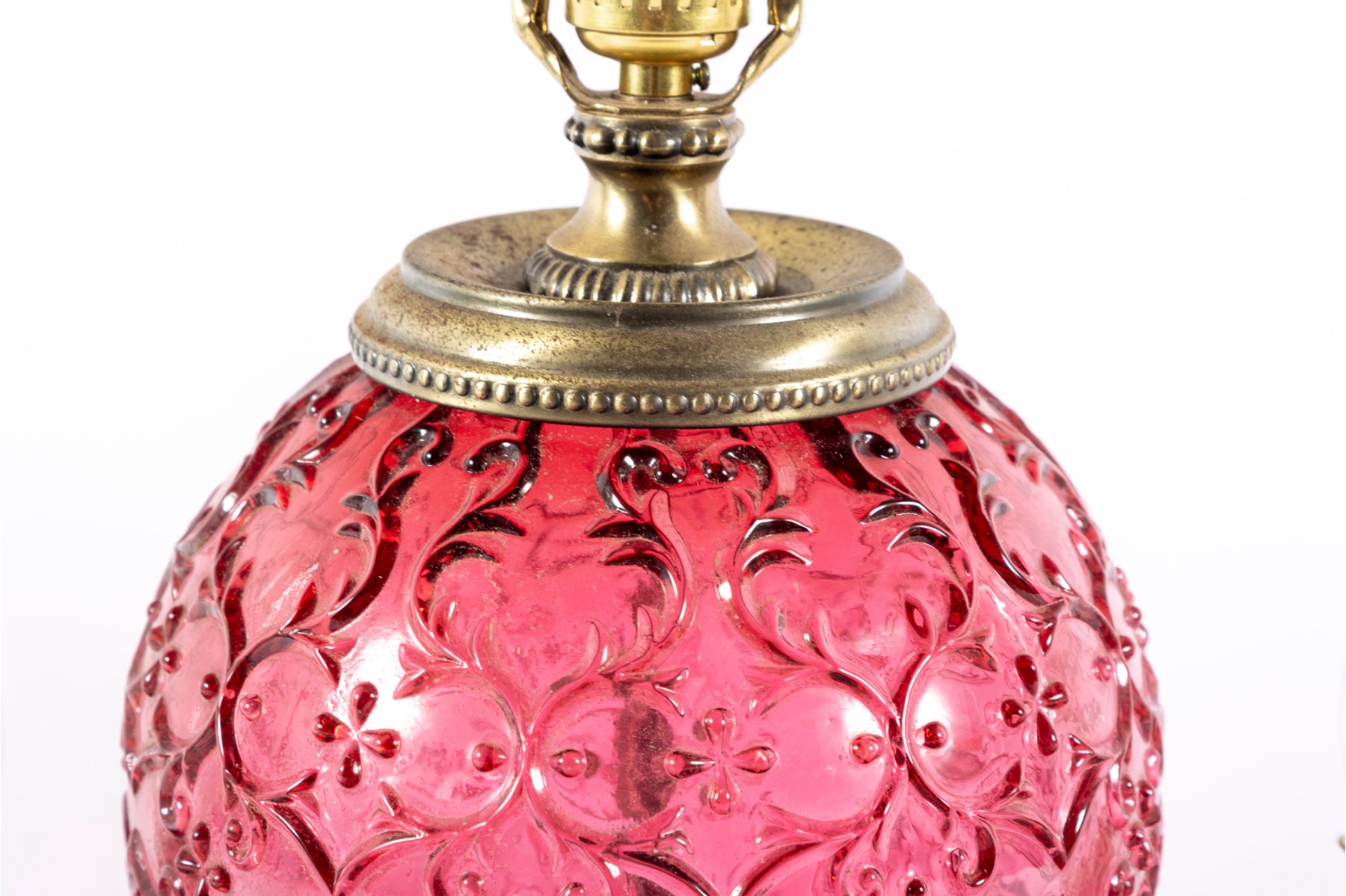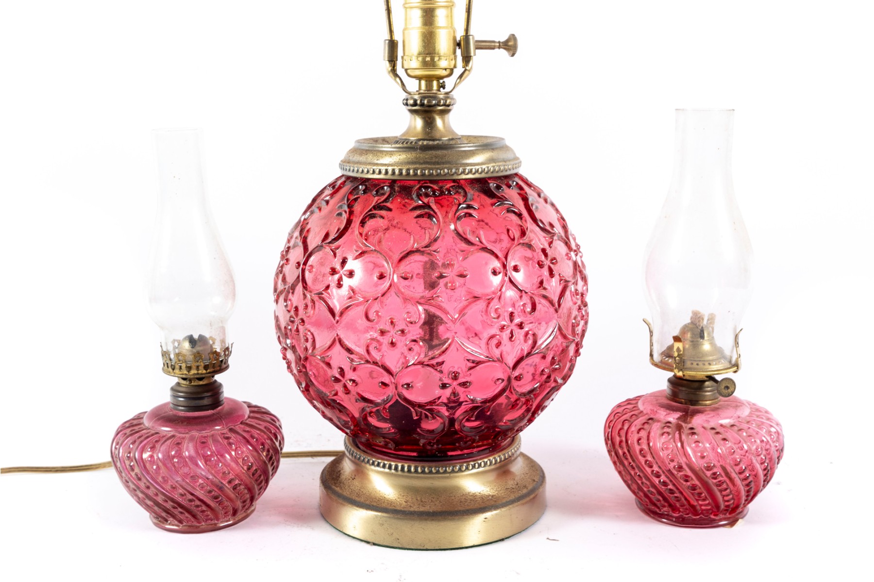 A fabulous cranberry glass table lamp displaying floral motifs along a lattice of foliate scrolled relief. Accompanied by a pair of gadrooned and stippled cranberry glass oil lamps.