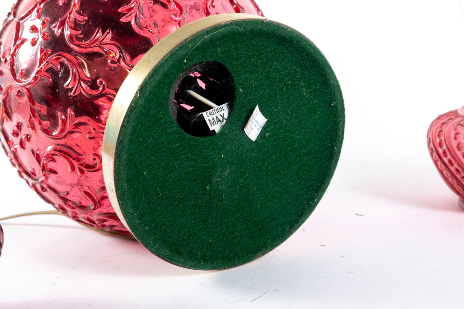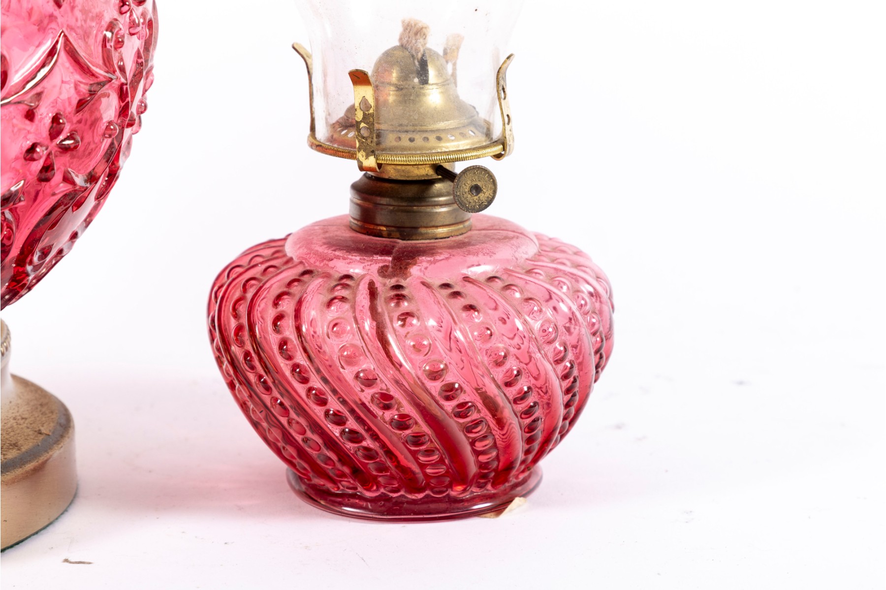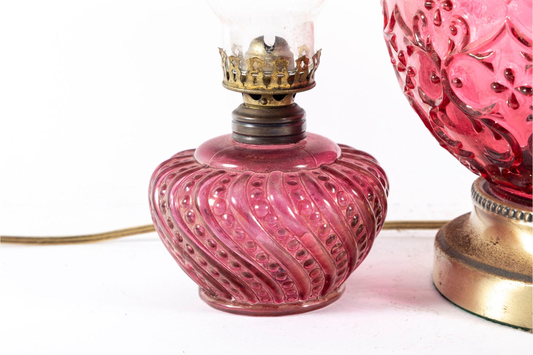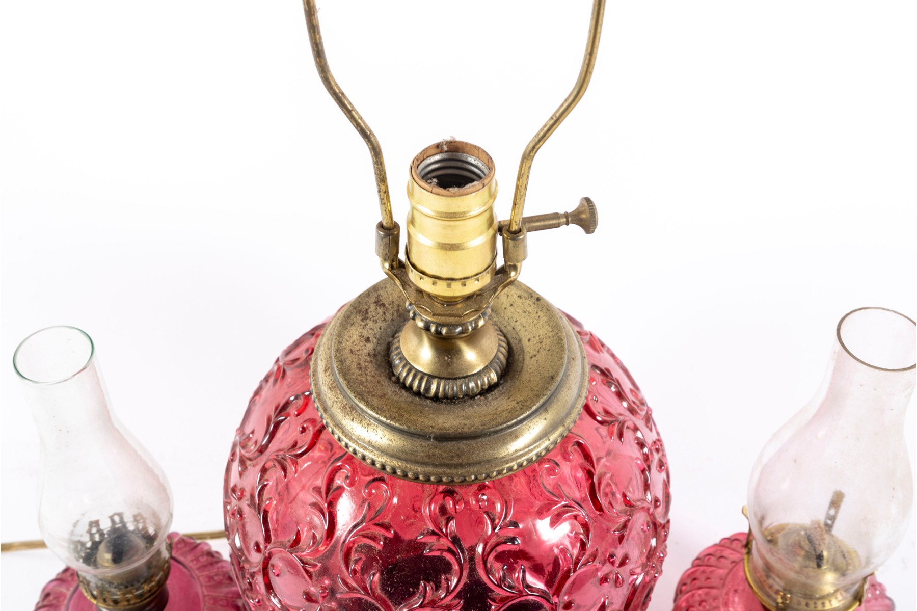 A fabulous cranberry glass table lamp displaying floral motifs along a lattice of foliate scrolled relief. Accompanied by a pair of gadrooned and stippled cranberry glass oil lamps.