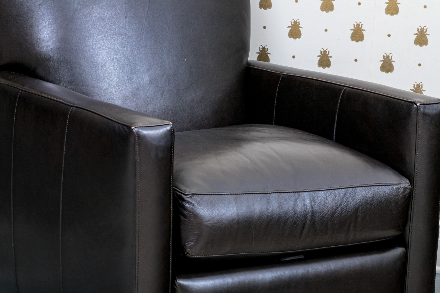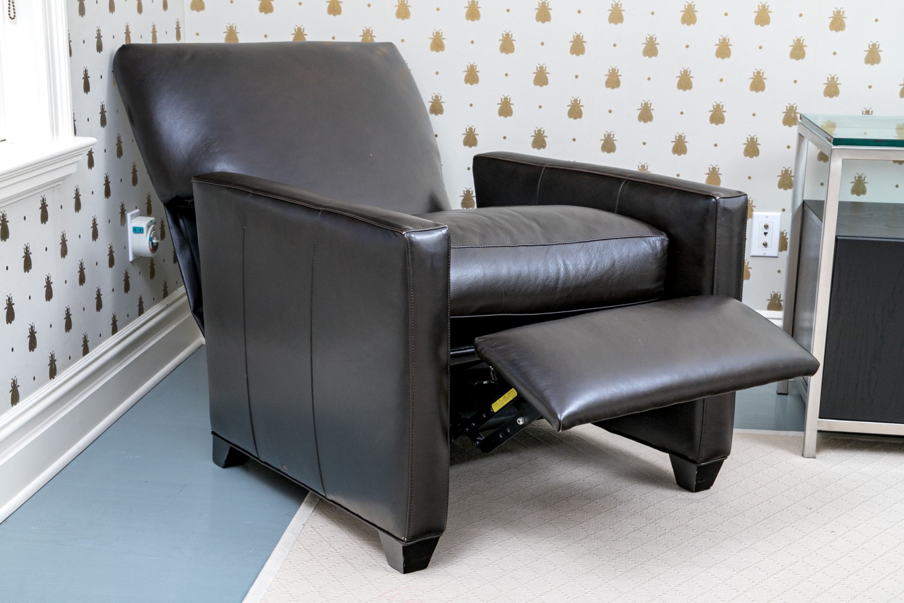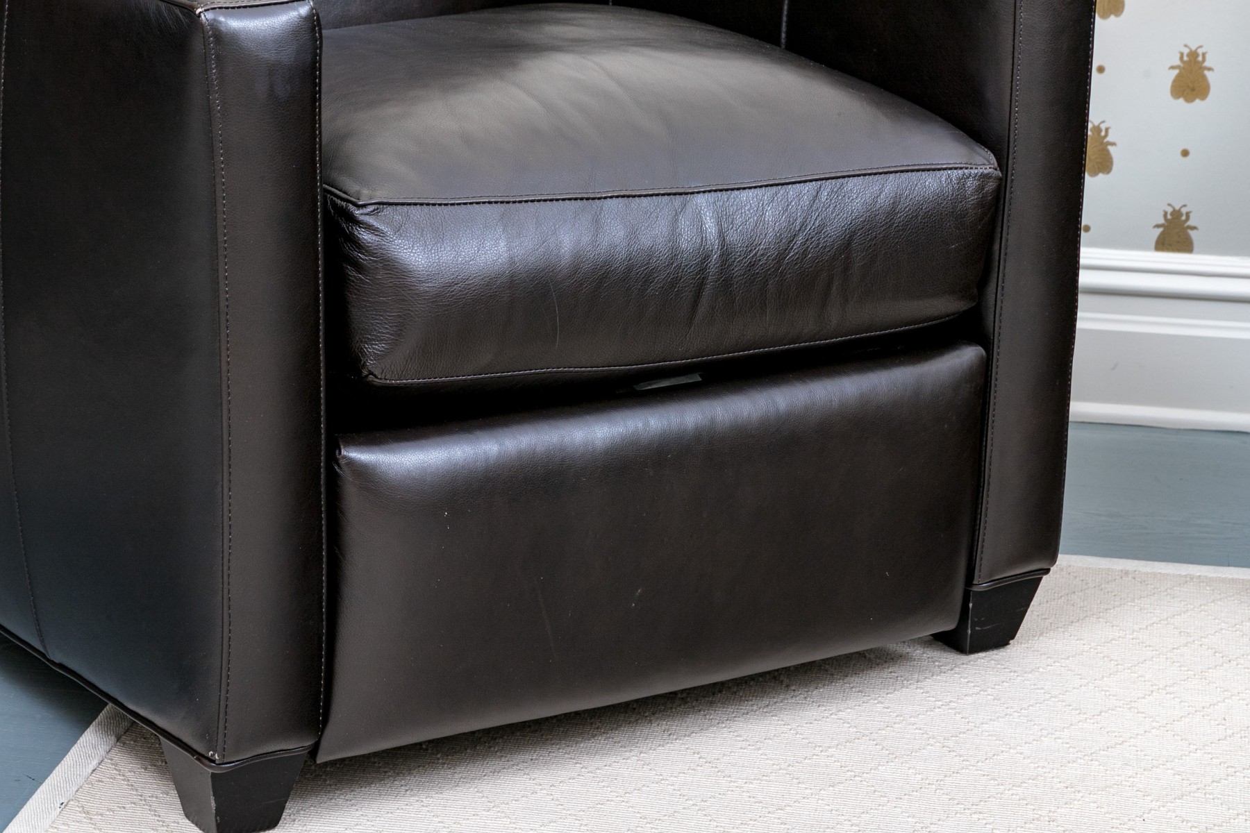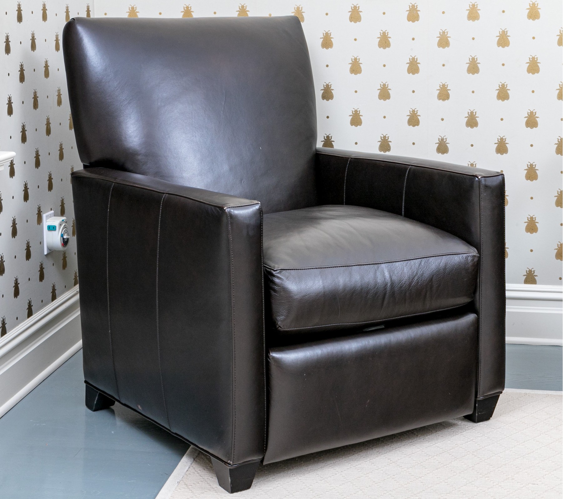 Handsome and comfortable. This Crate And Barrel "Tracy" reclining armchair is leather upholstered and raised on four short feet.