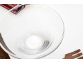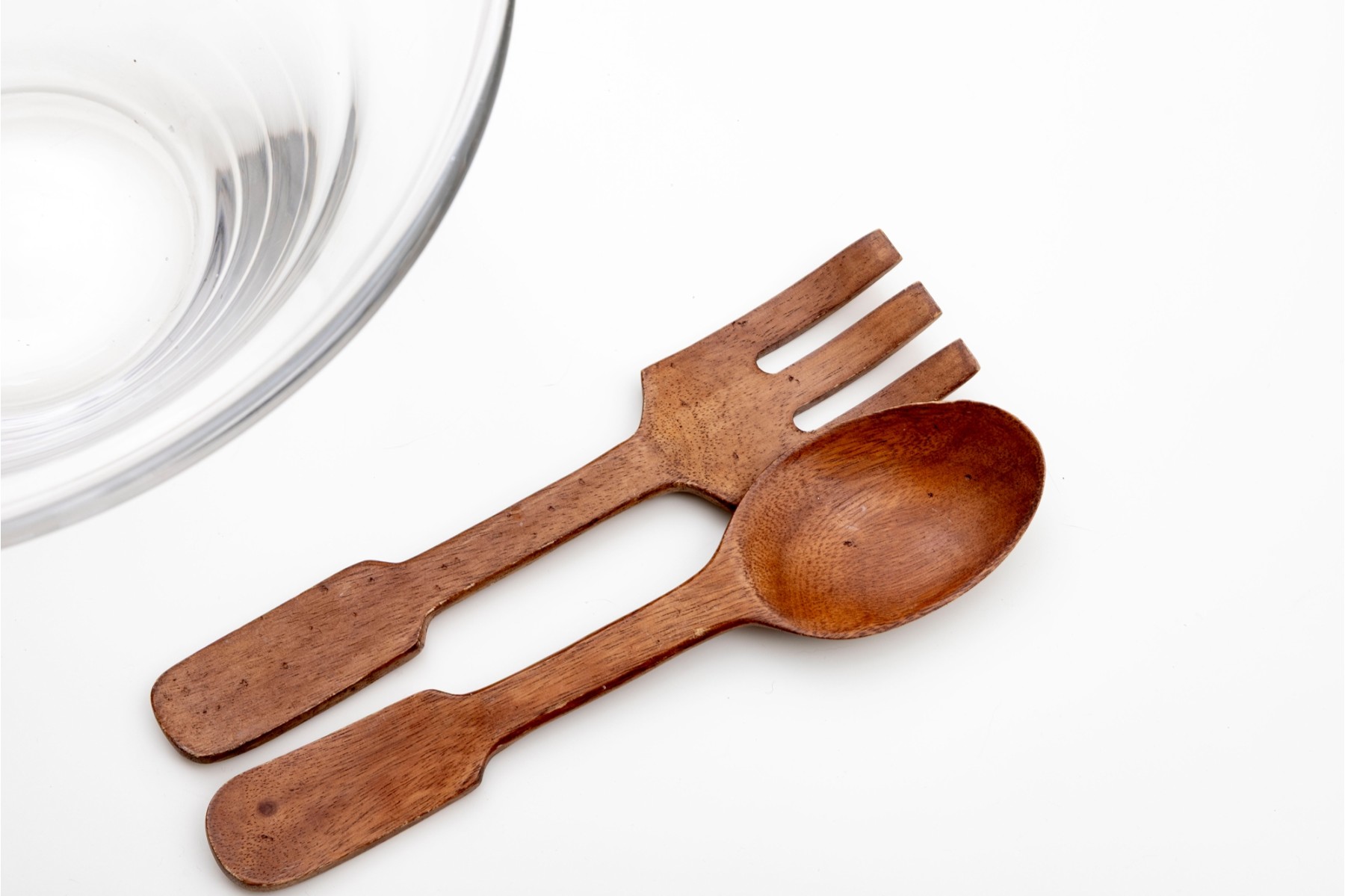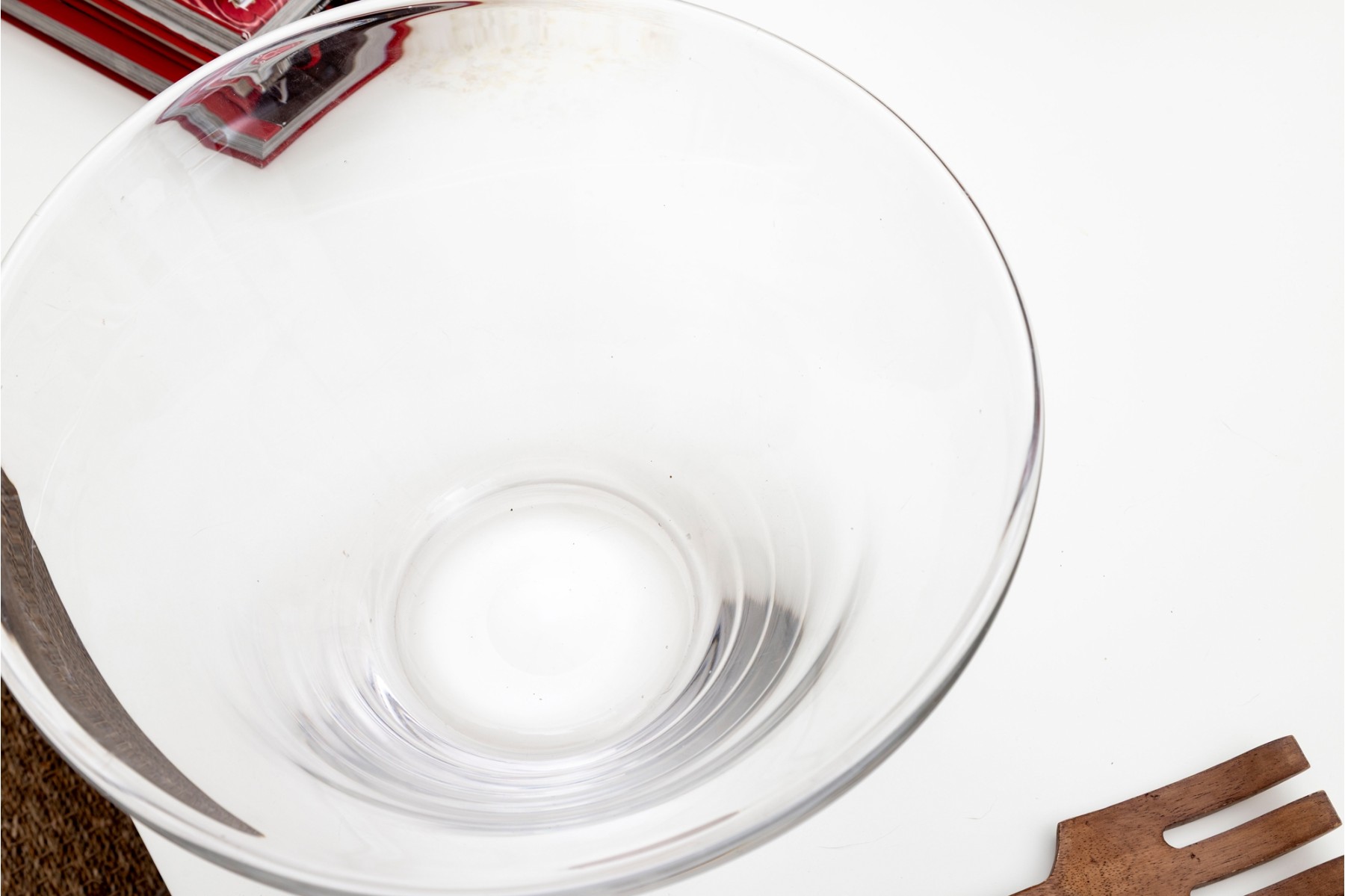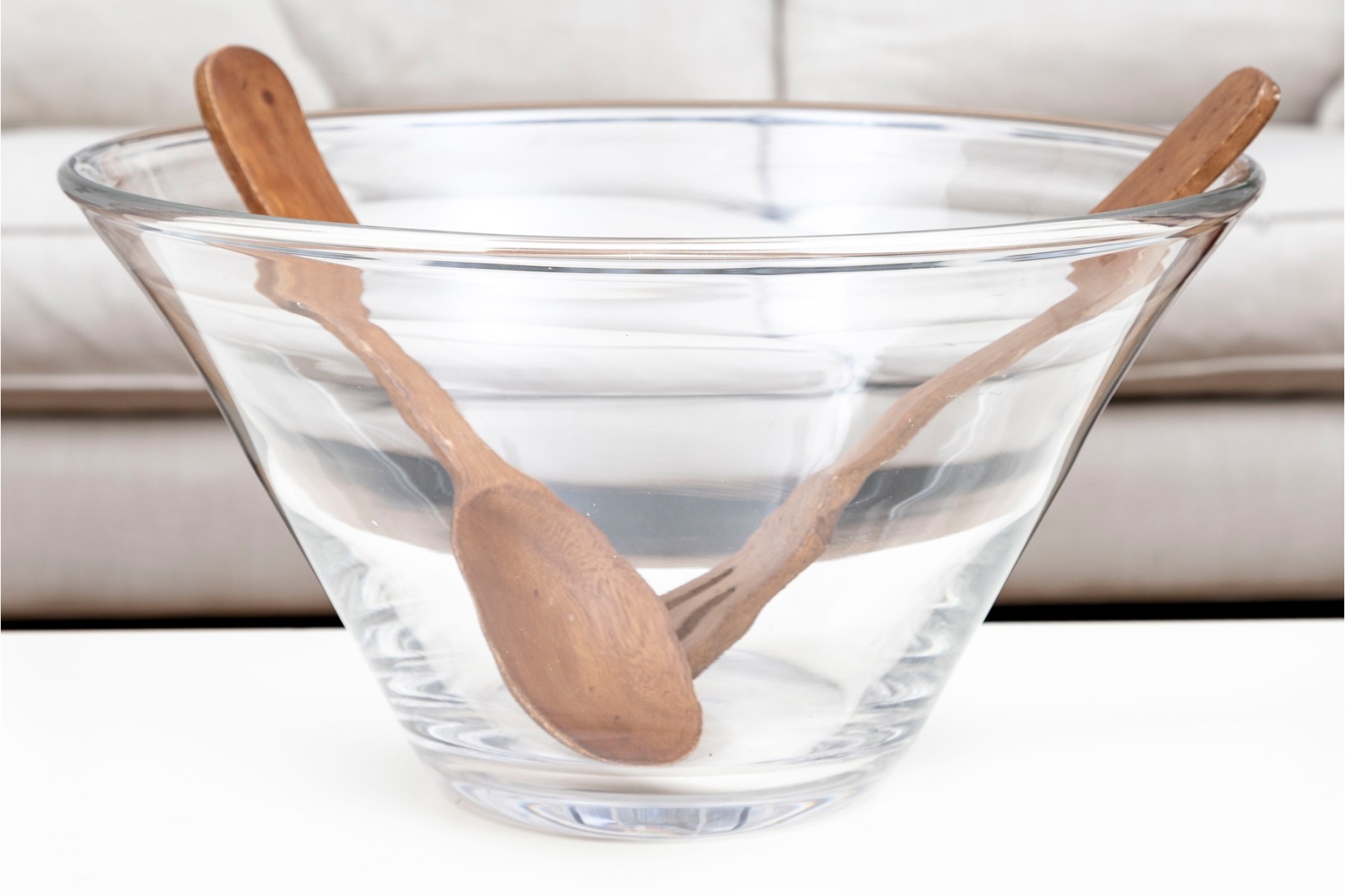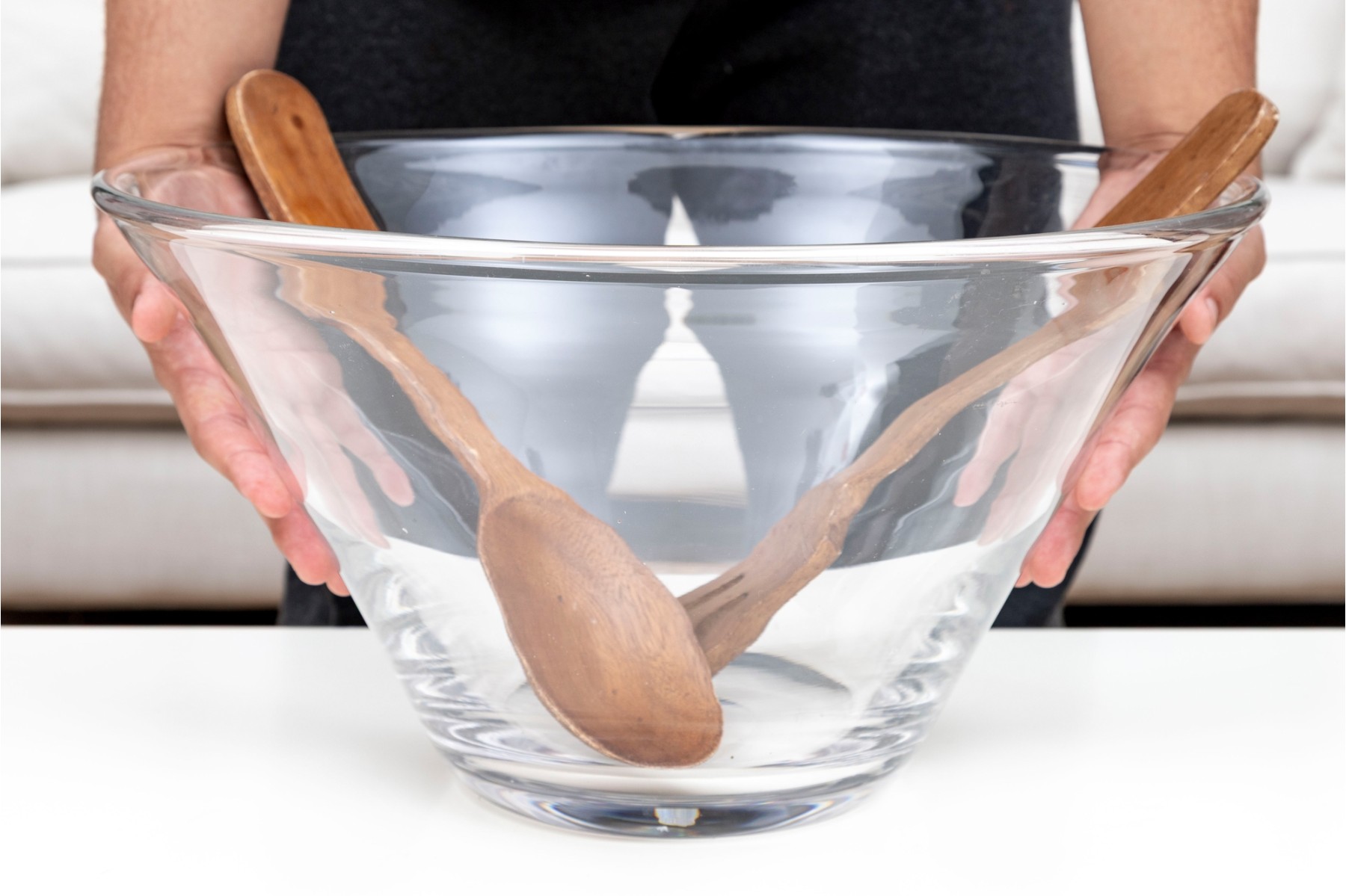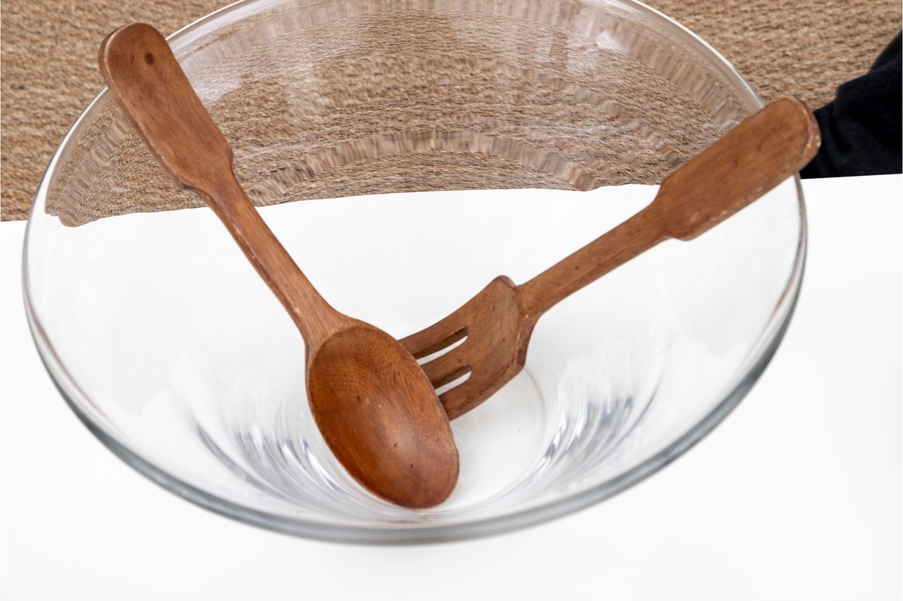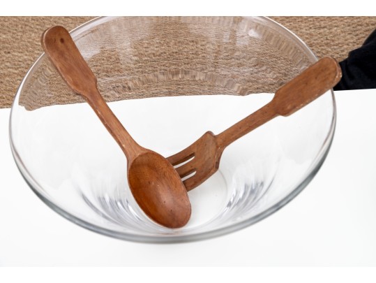 A beautifully crafted 14.5" diameter Crate & Barrel glass mixing bowl paired with a set of acacia wood utensils, including a fork and spoon.