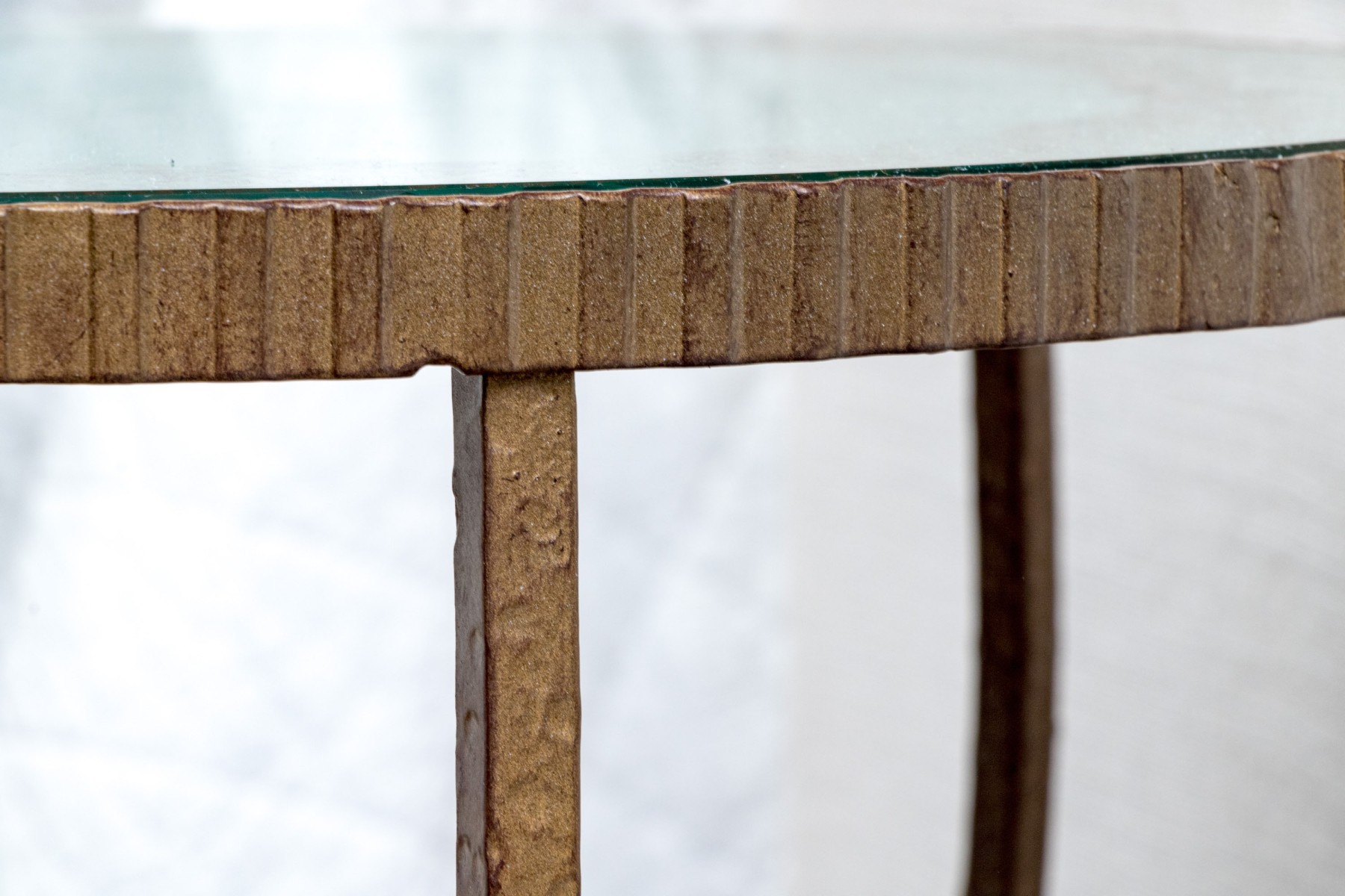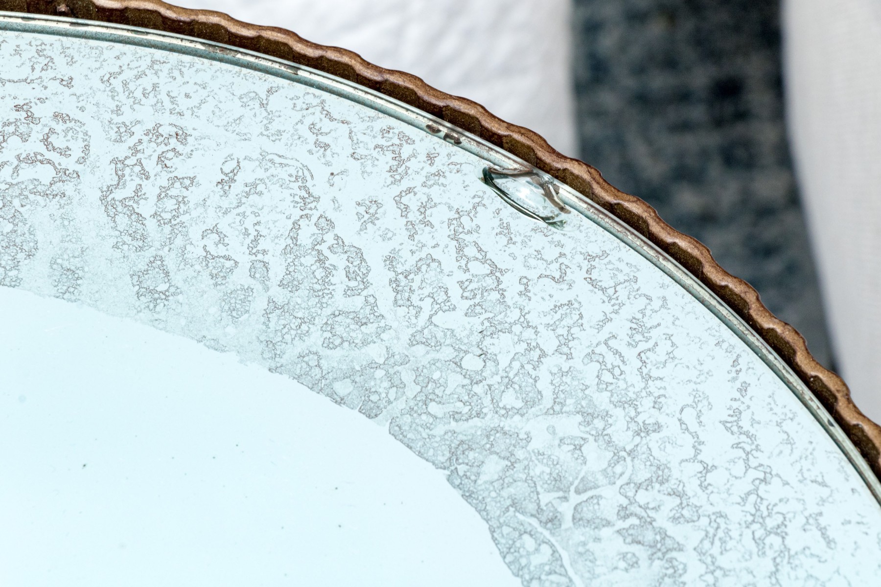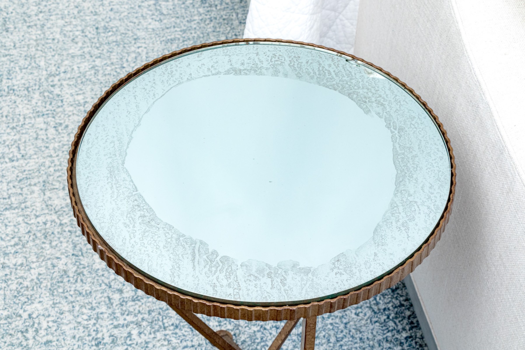 An excellent Crate & Barrel "Jules" accent table featuring a beveled and antiqued mirror top with a chiseled bronzetone rim over a chic tripod of curved legs with a fine hammered texture. Beautifully designed with a balanced blend of contemporary modernity and vintaged charm for a versatile and stylish display.